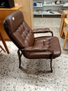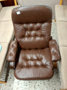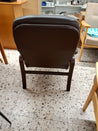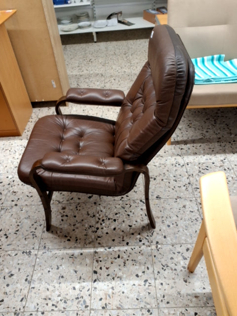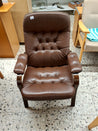 Stolen har en polstret ryg og sæde med knapper, samt træarme. Den er lavet af brunt læder.