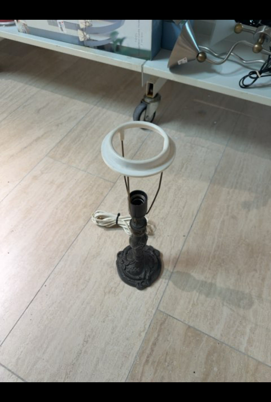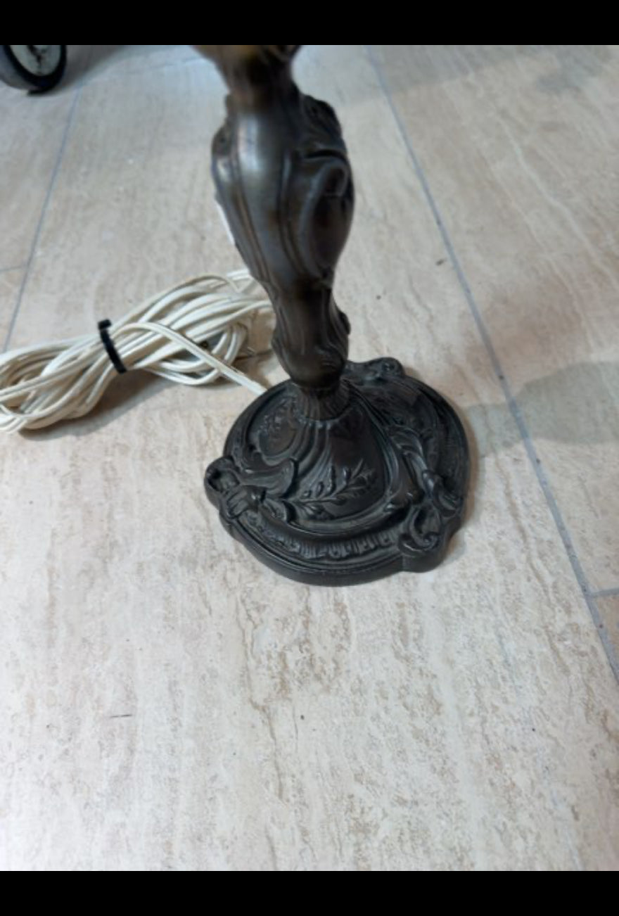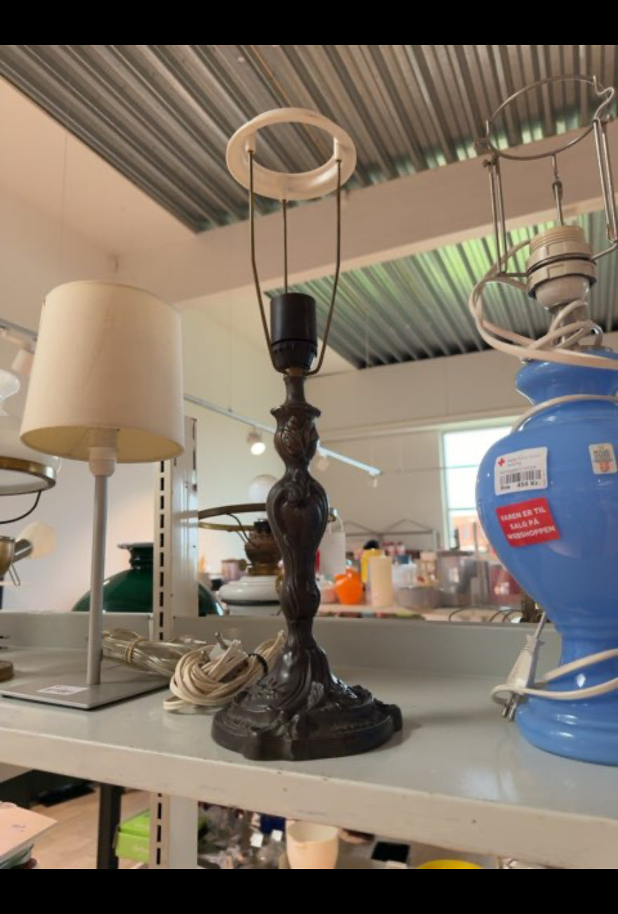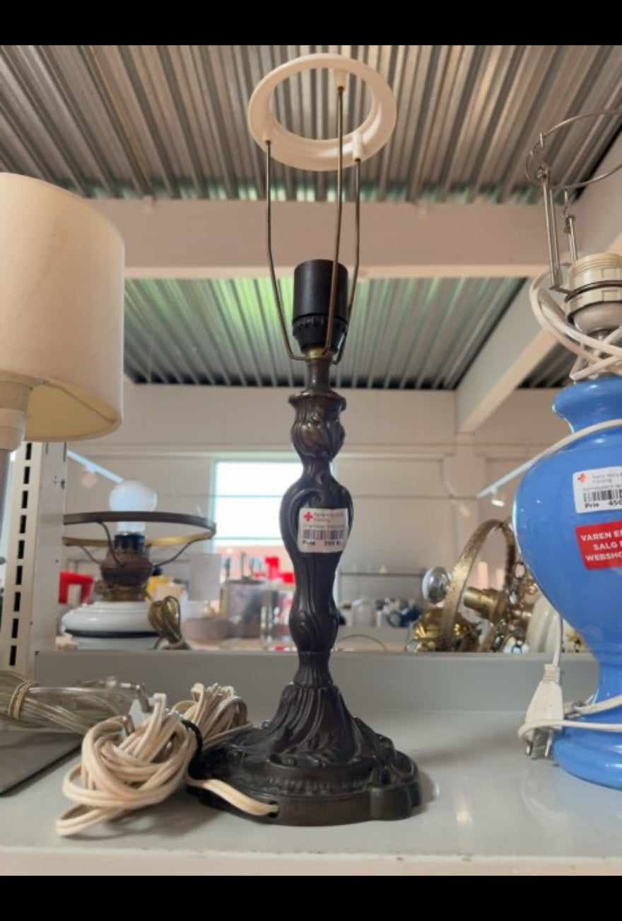 Lampen har en dekorativ stand i mørkt metal med en detaljeret overflade. Den er designet til at holde en lampehætte og leveres med en ledning.