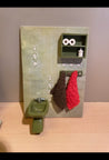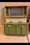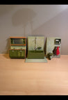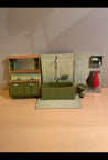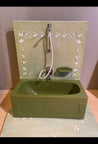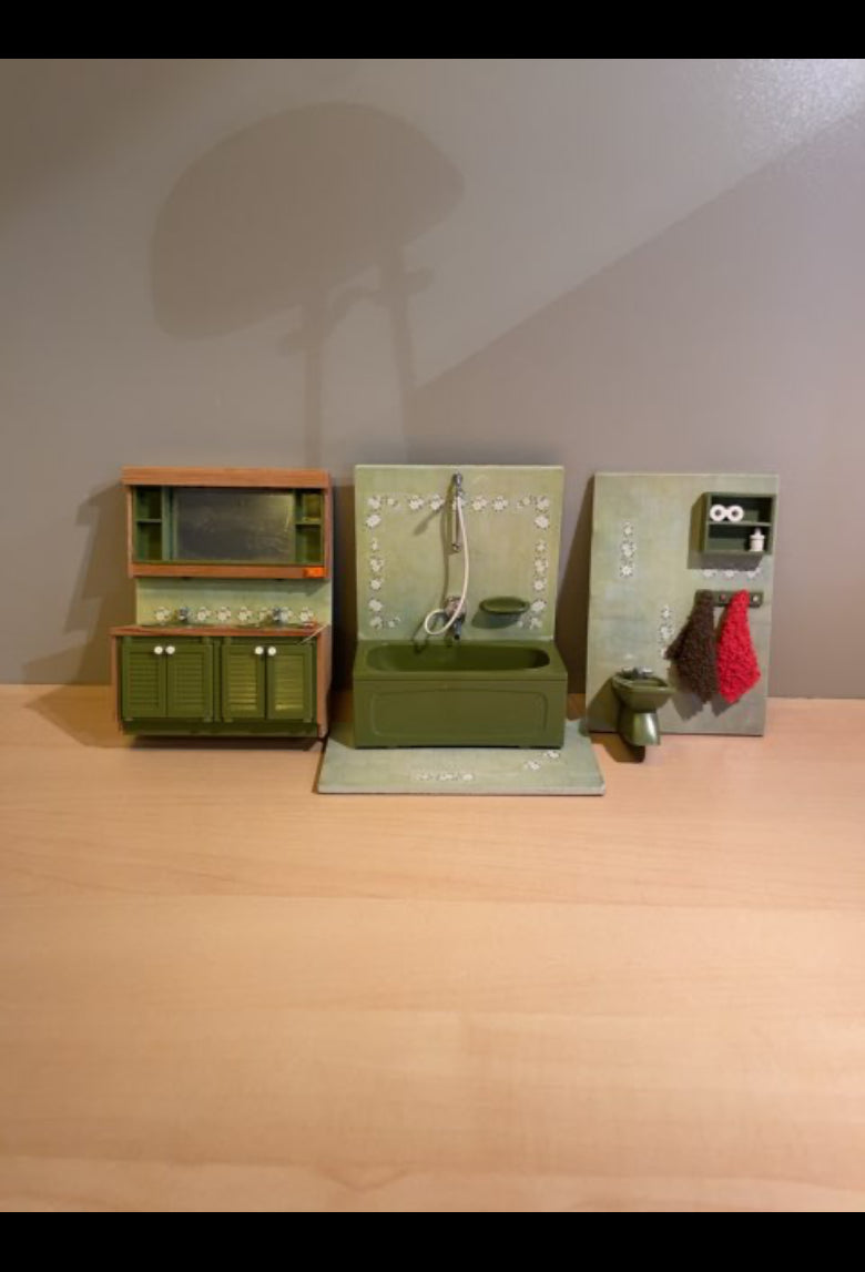 Produktet er et miniature badeværelse i plastik med en grøn farve. Det inkluderer et badekar, vaskemøbel og bidét m. hylde og håndklæder.