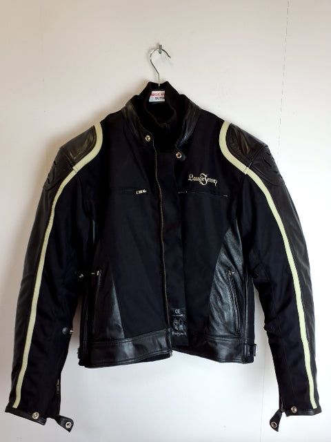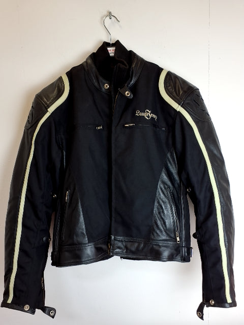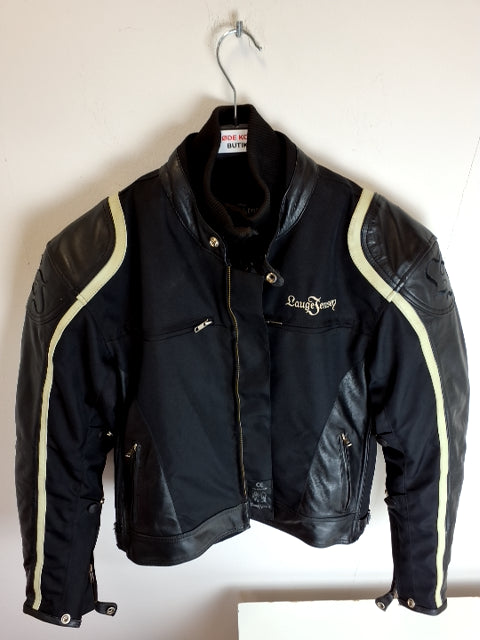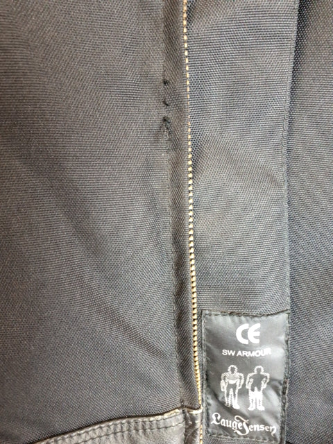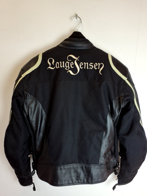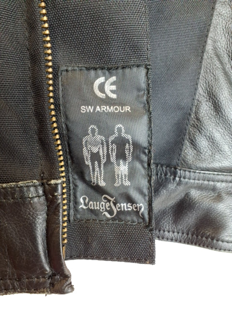 MC jakke af mærket "Lauge Jensen". Str: "Euro 2XL". På fronten af jakken ved lynlåsen er en syning gået op - dette ses på sidste foto - prisen er sat derefter.