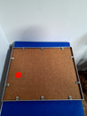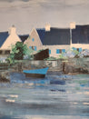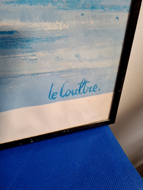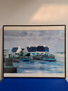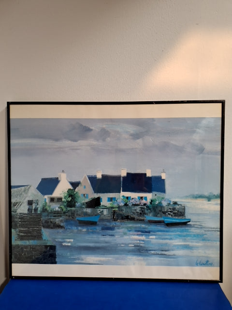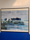 Plakat i en sort ramme, der viser en lille bådehavn med huse i blå nuancer. Rammen har lidt slitage - prisen er sat derefter. Mål: 61 x 51 cm