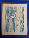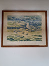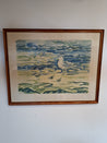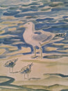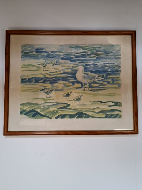 Plakat i ramme af træ. Motiv: fugle ved stranden. Mål: 66 x 52 cm
