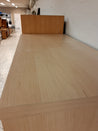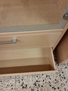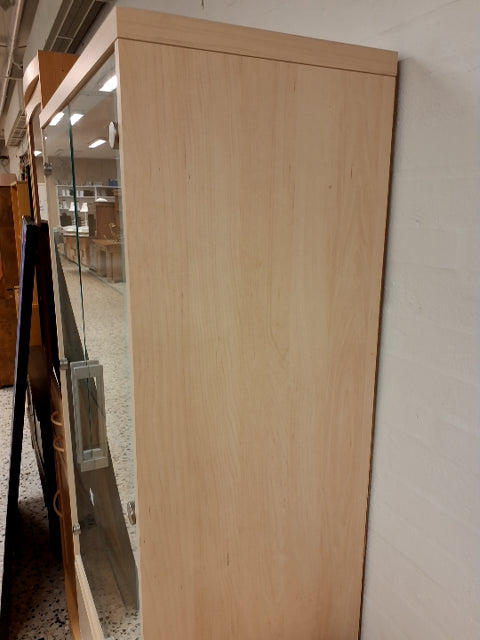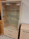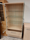 Skabet har glasdøre og hylder, med træramme og metalgreb. Det har to skuffer nedenfor. Lys træ.