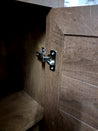 Reolen har åbne hylder og døre med lameller. Den er lavet af træfiberplader beklædt med melamin i mørkt egelook. Reolen er 198 cm højt, 51 cm dybt og 85 cm bredt.