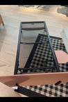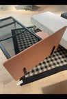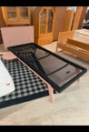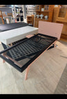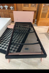 Sengen har en let, moderne design med en lyserød sengestampe og sort metalramme. Den har en mesh-overflade.