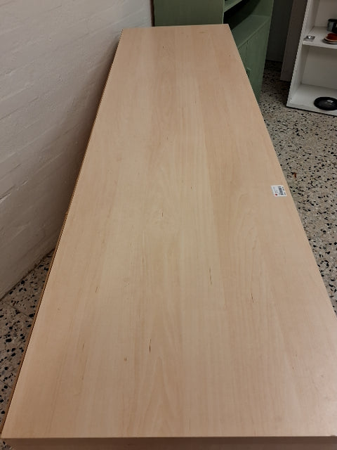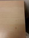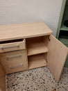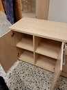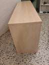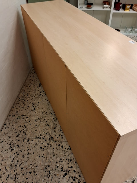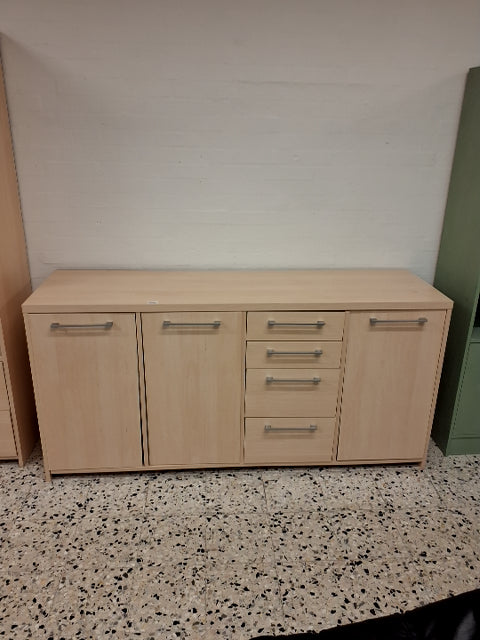 Møblet har en simpel, moderne design med tre skabe og fem skuffer. Det er lavet af lys træ og har metalhåndtag.