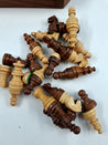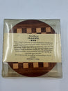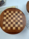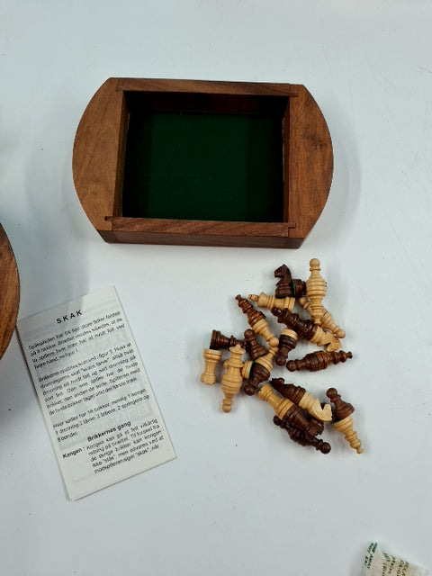 Håndlavet i Indien af lyst og mørkt Cedertræ. Brikkerne ligger i en skuffe under "brættet", Spilleregler med følger. Diameter 18,5 cm