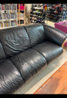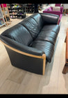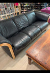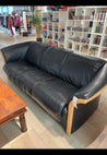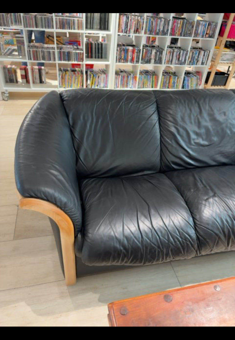 Sofaen har en moderne, strømlinet form med bløde kurver. Den er beklædt med sort læder, som giver et luksuriøst udseende og en glat overflade. Ryglænet og sædet er polstret for komfort, og der er trædetaljer i armene, der tilføjer et naturligt element til designet.