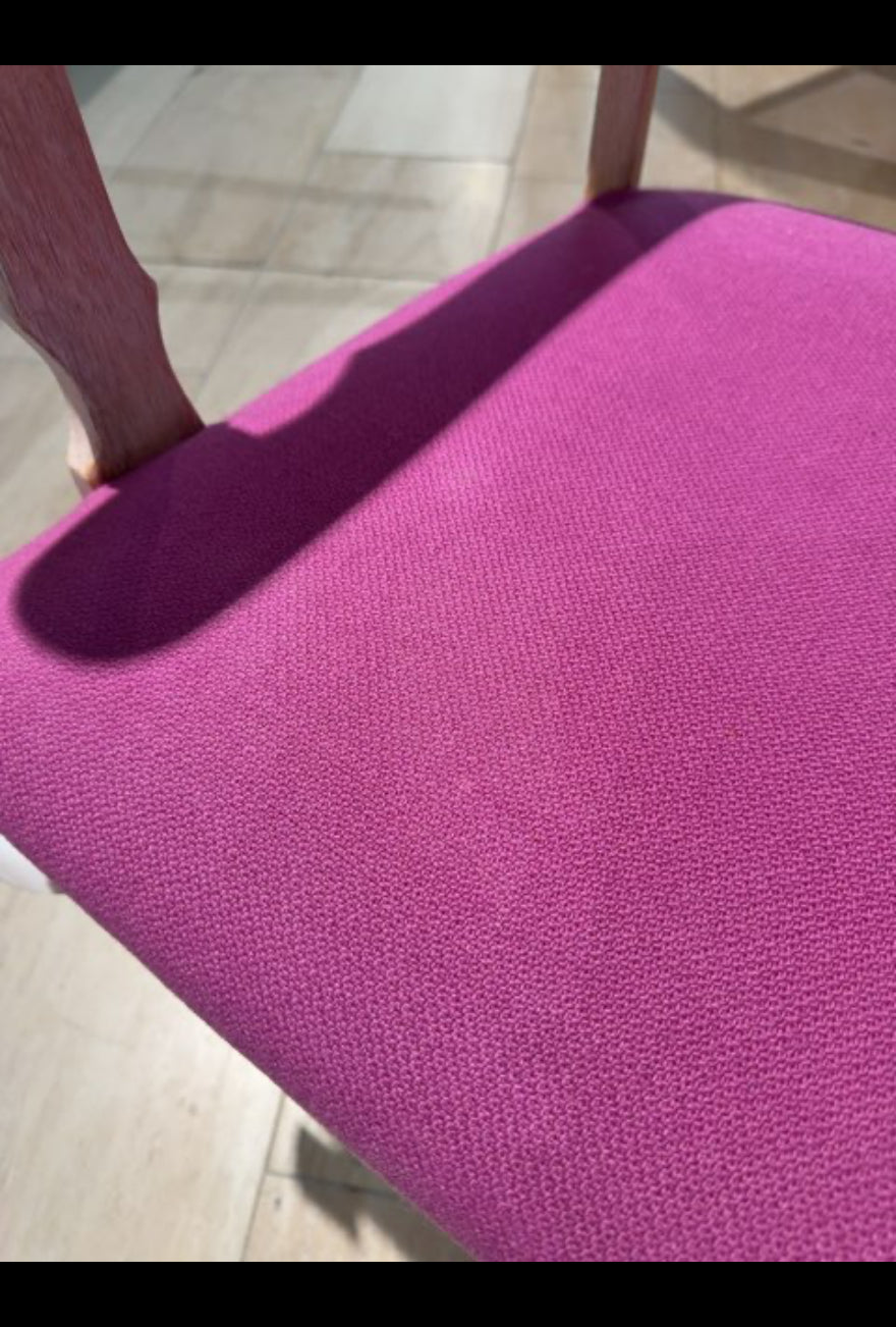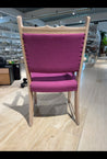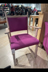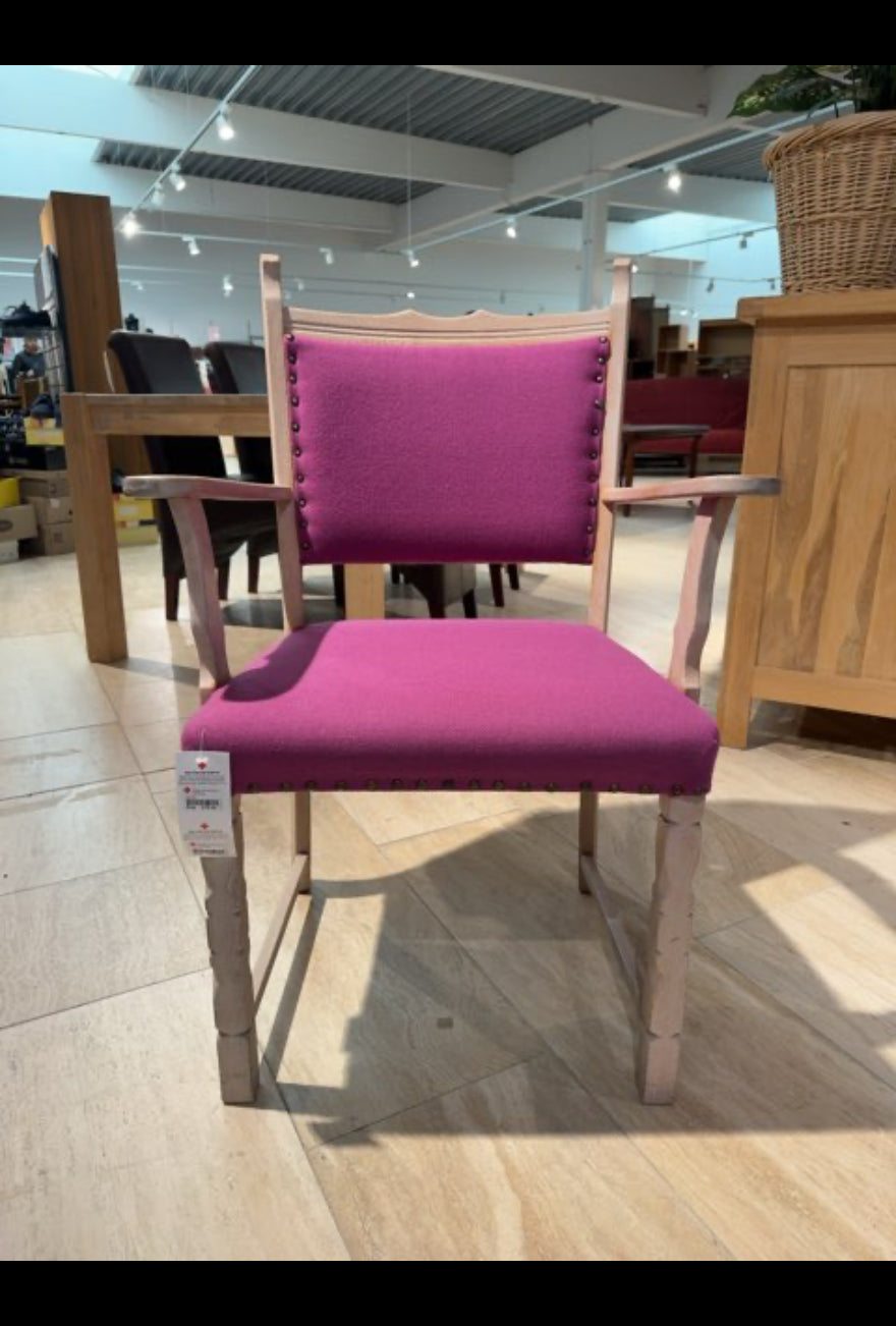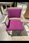 Stolen har en træramme med armstøtter og polstret sæde. Betrækket er i en kraftig, lilla stof med nitter.