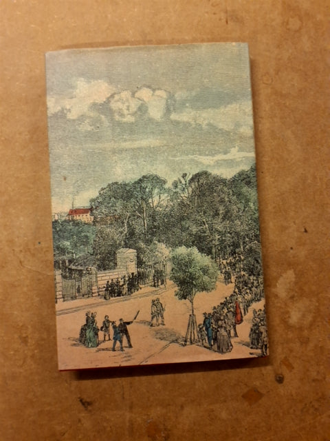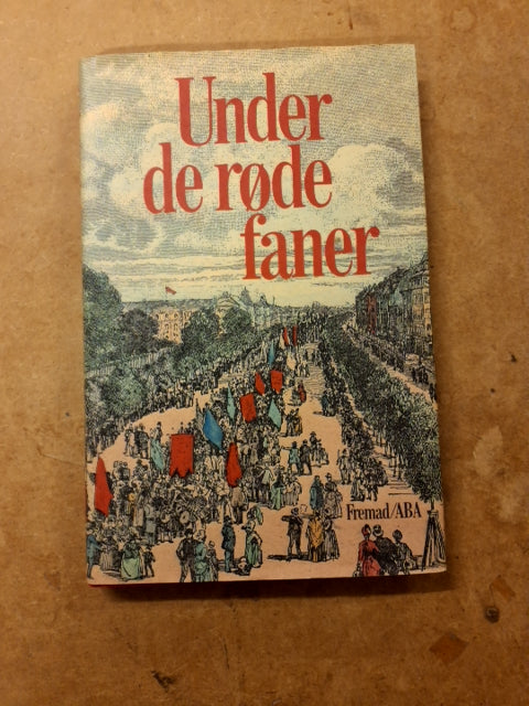 Bogen har en illustreret forside med en historisk scene og tekst i rød. Papir.,