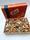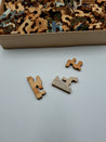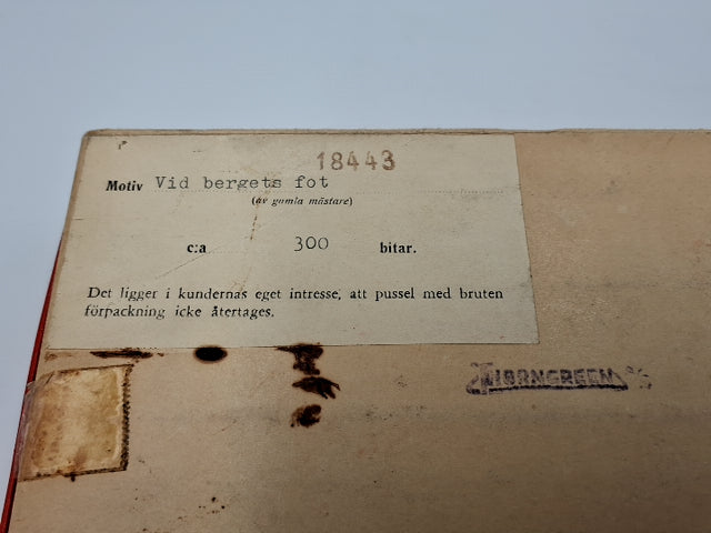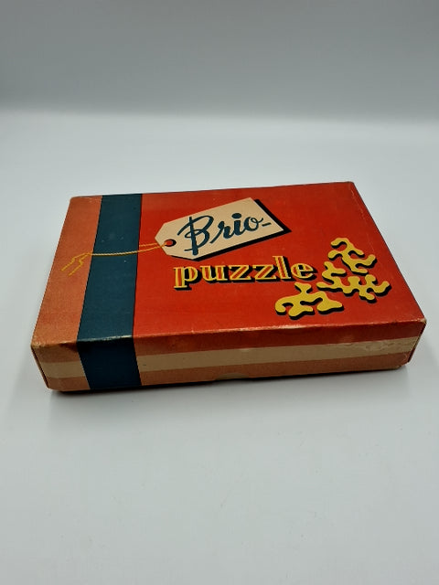 Produktet er en puzzle spil med en farverig, rød overflade og en blå strip. Den er lavet af træ. Ca. 300 brikker