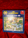 Puslespillet har 500 brikker og en farverig tegneseriestil. Pappæske.