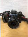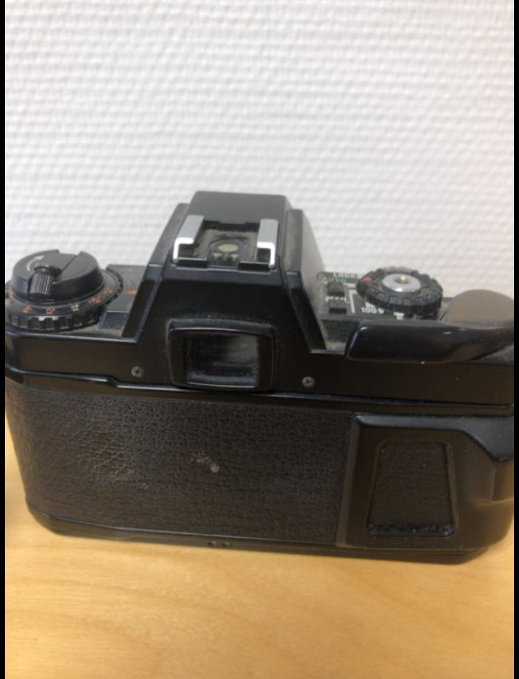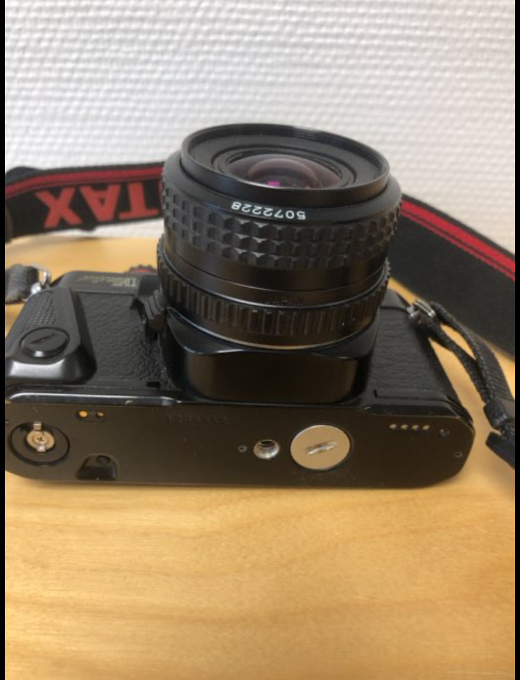 Kameraet har en sort metalramme med en optik på 28 mm og forskellige justeringsknapper. Spejlrefleks.
