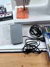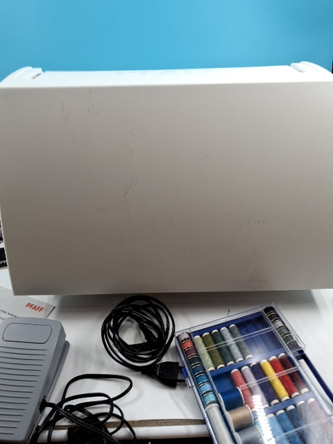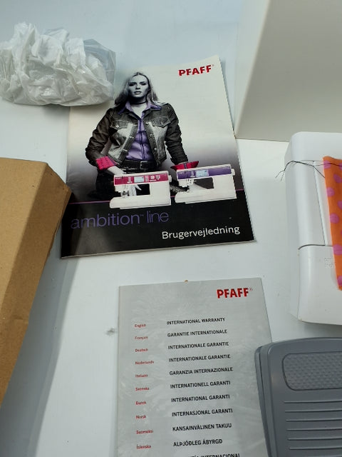 Model ambition 1.0. Den er afprøvet og virkerSymaskinen har et moderne design med digitale kontroller og en farvemonitor. Den er fremstillet i plast og metal. Der medfølger brugsvejledning, opbevarings kasse, kasse med tråd og spoler.