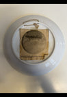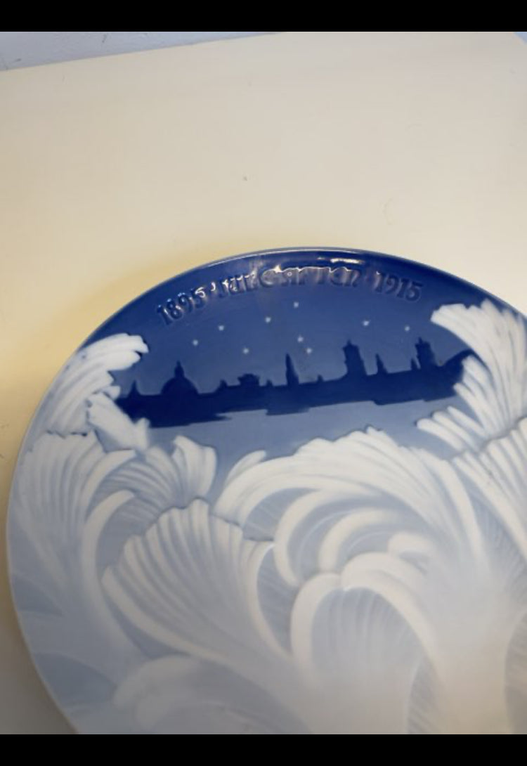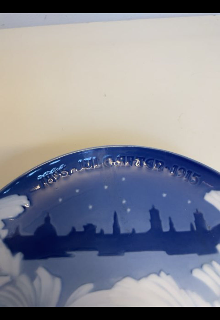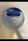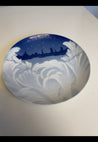 Skålen er rund med en blød, fordelagtig form. Den har et detaljeret, malet design i nuancer af blå, der viser en silhuet af bygninger. Materialet ser ud til at være keramik eller porcelæn.