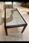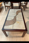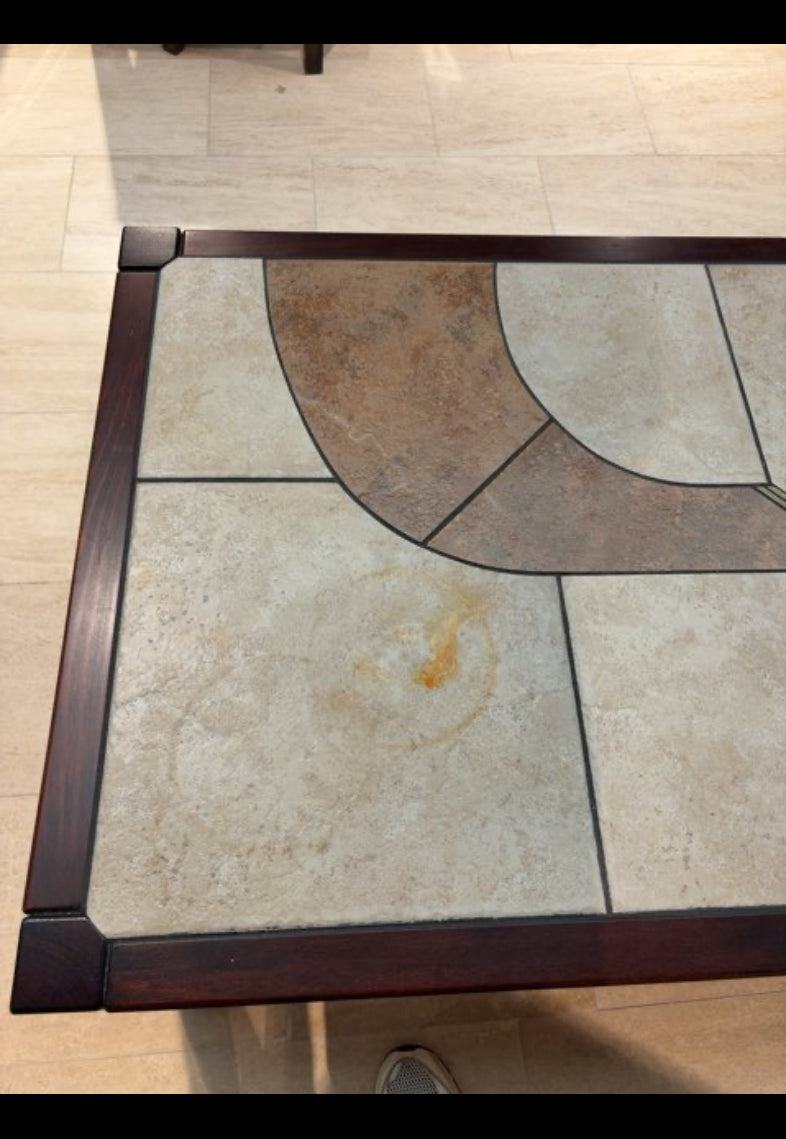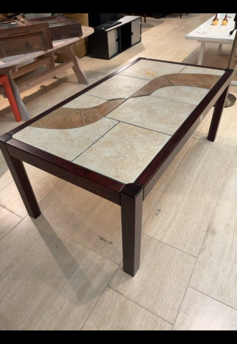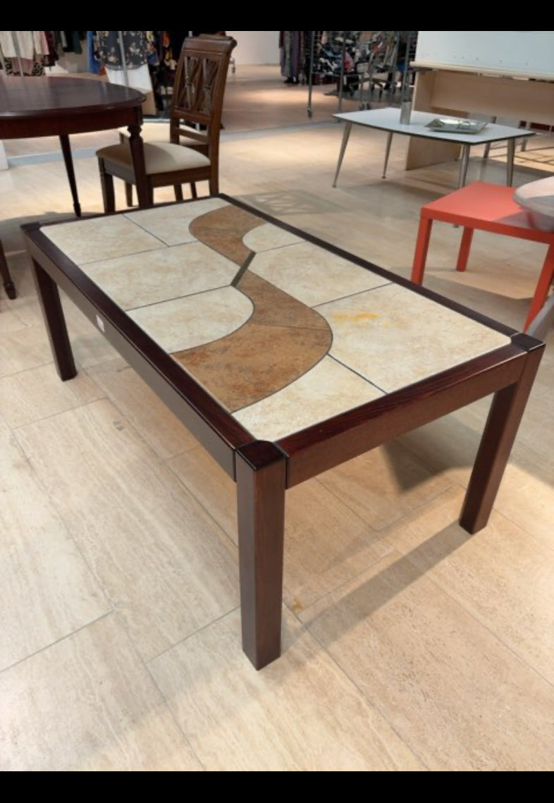 Bordet har en rektangulær form med en kombination af lakeret træramme og fliser på overfladen. Fliserne er i lys og beige nuance, med dekorative mønstre. Træet er mørkt og skaber en kontrast til fliserne. Solidt design.