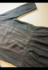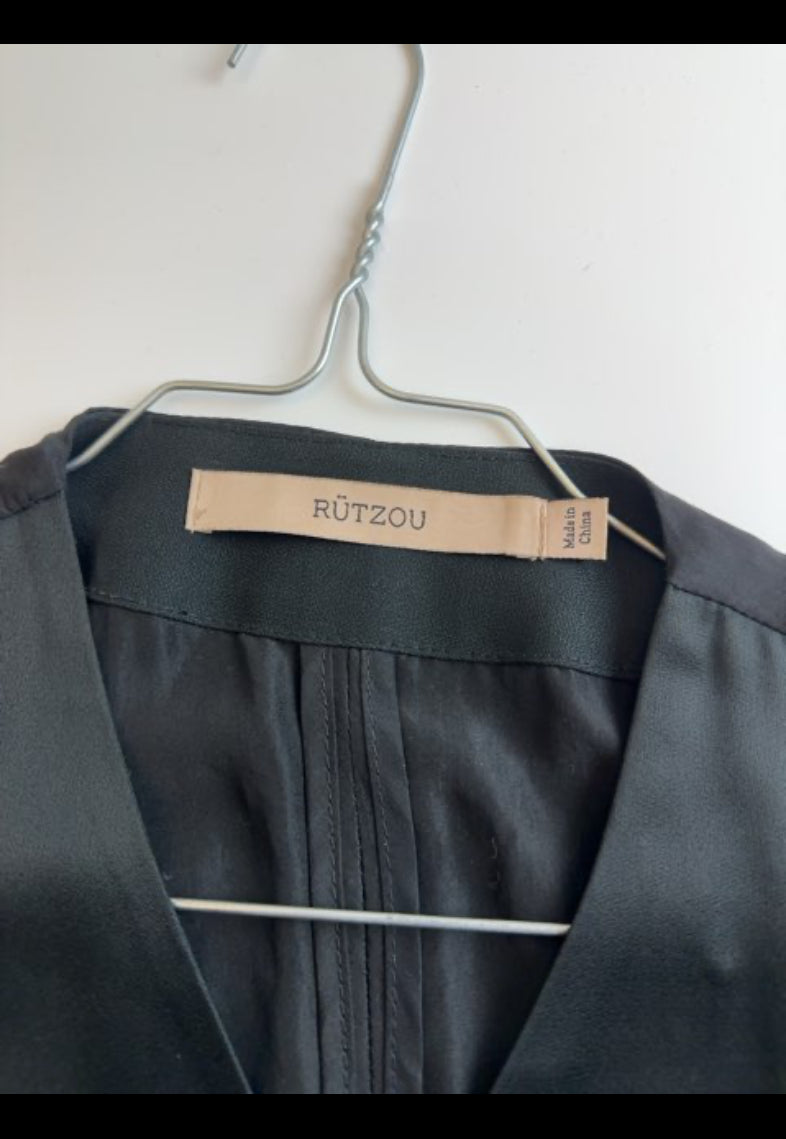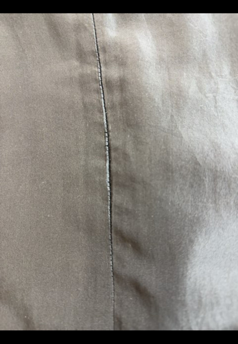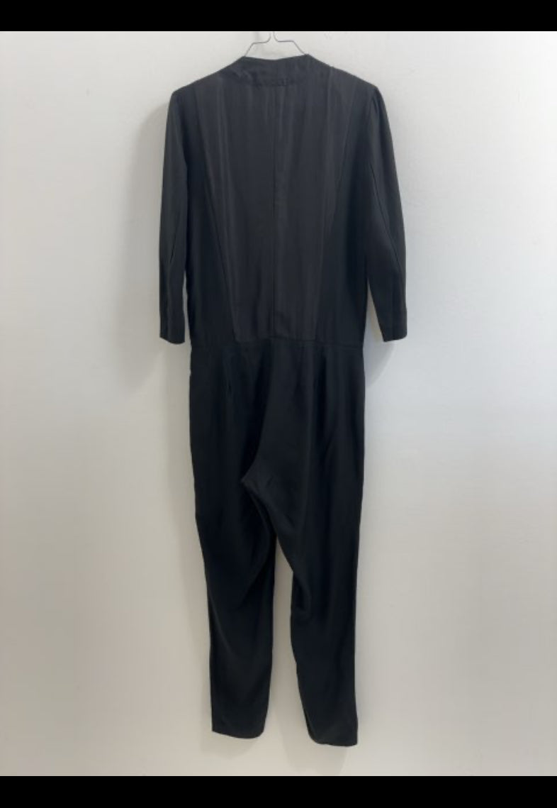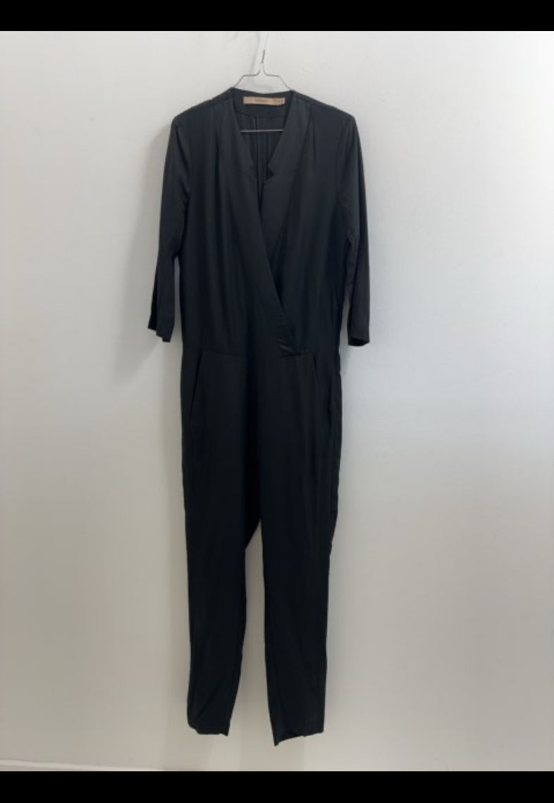 R473 Jumpsuit med v-hals og trekvartærmer. Den har skrå lommer og et enkelt, glat design. Stof virker blødt og strækbart. Har skulderpuder. Syningen har givet sig lidt på ryggen, se billede.