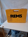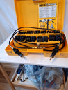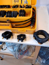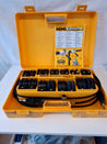Produktet er en værktøjskasse i plast med sorte og gule detaljer. Den indeholder adaptere.