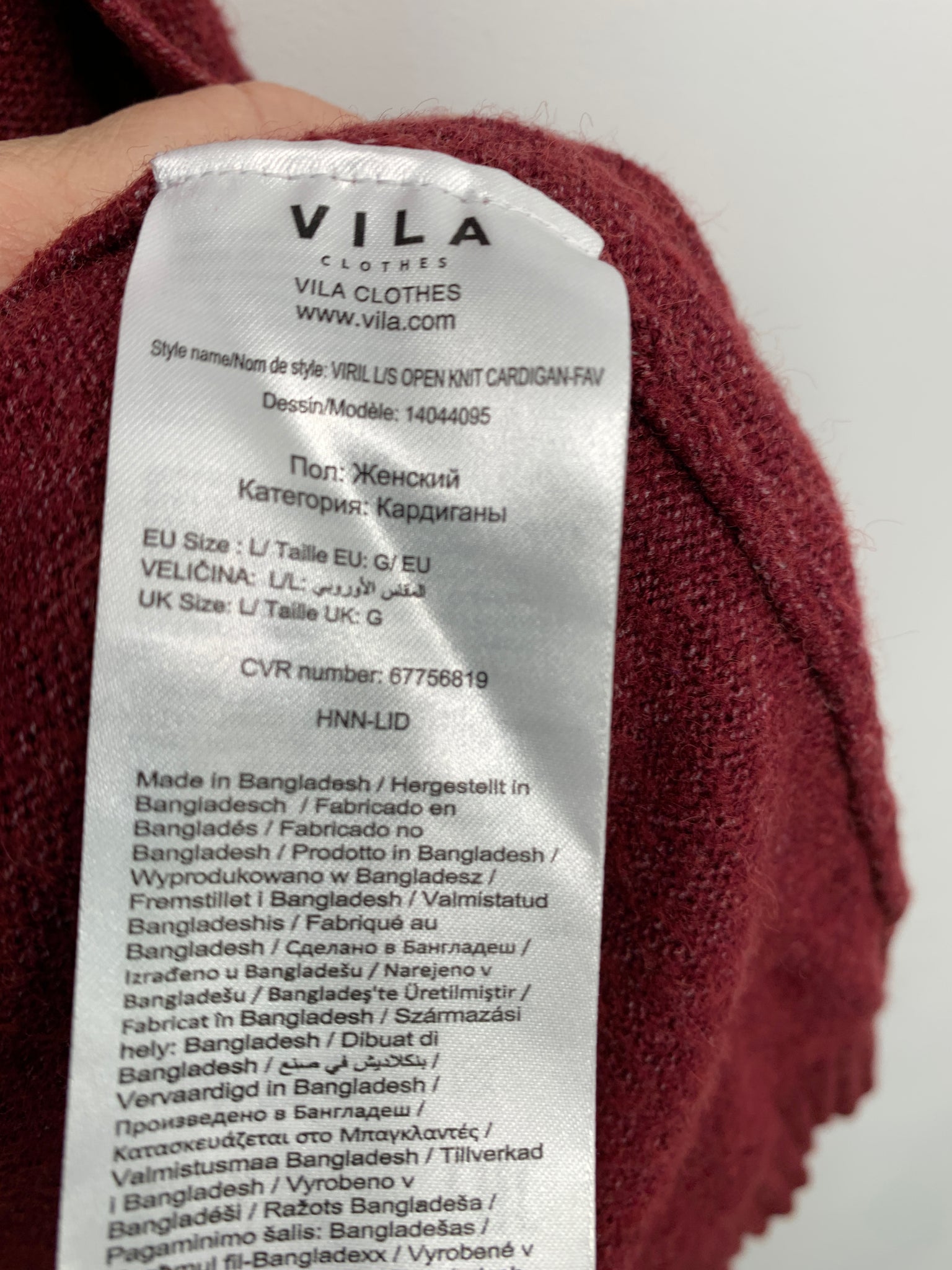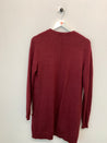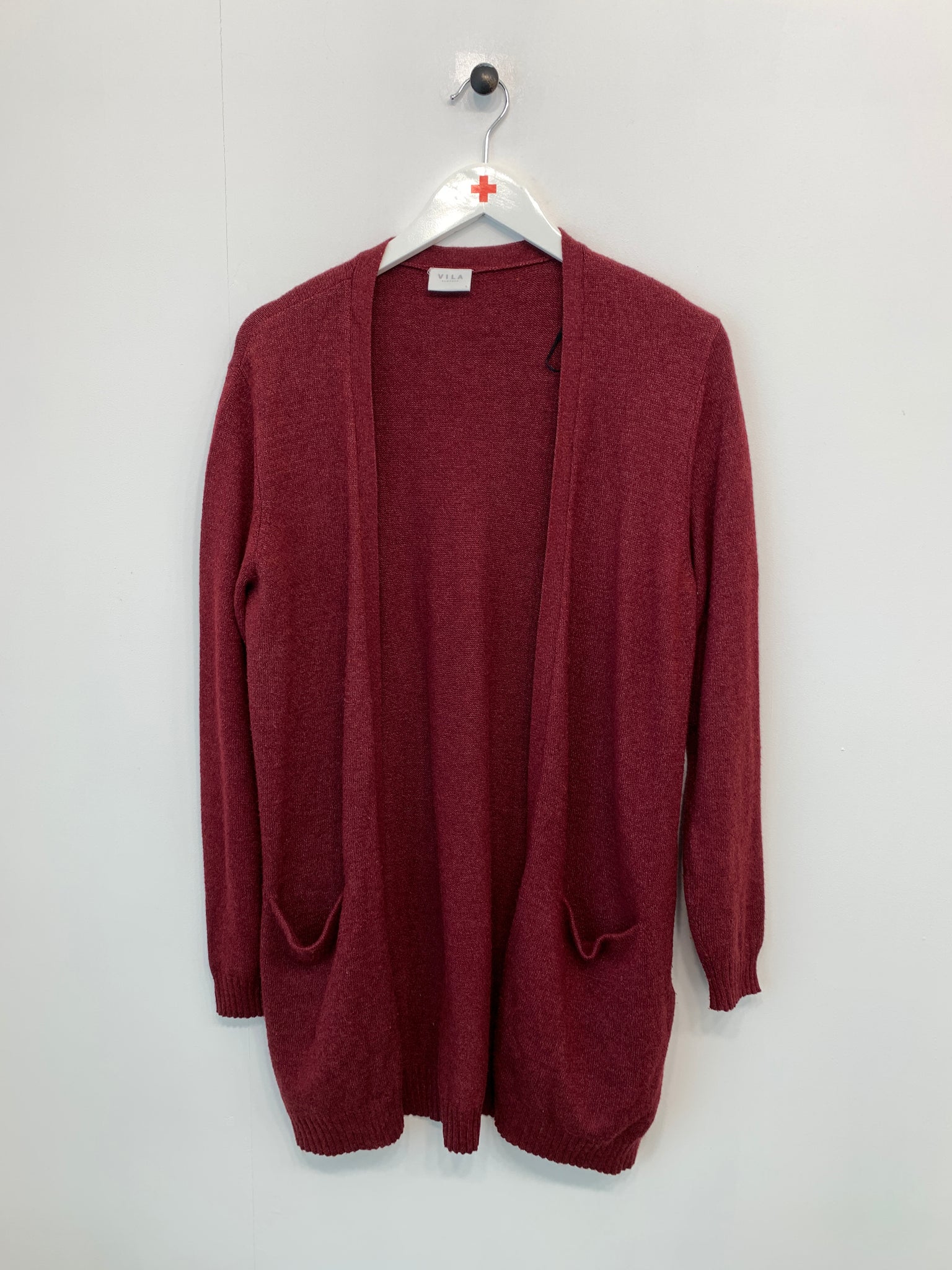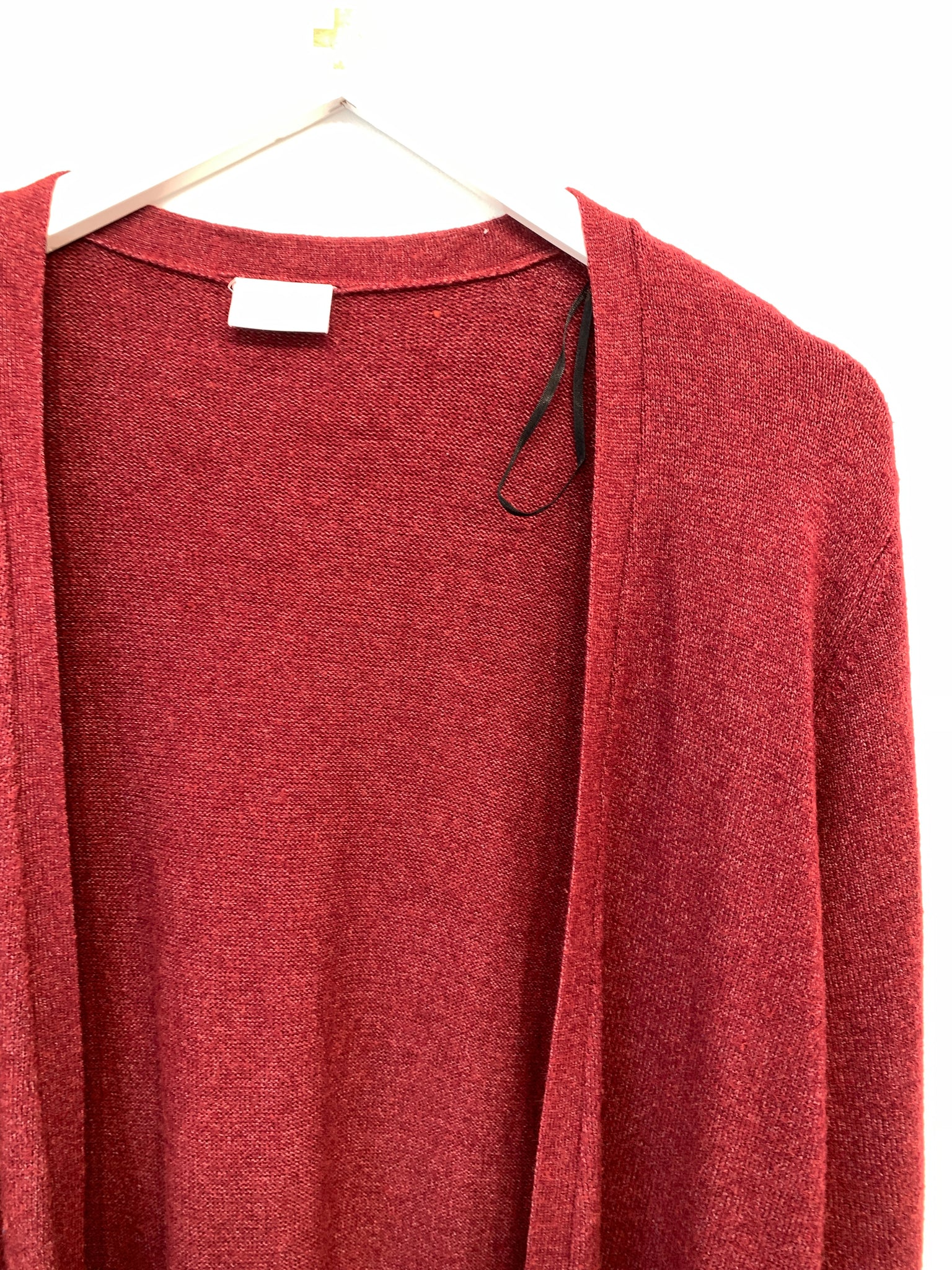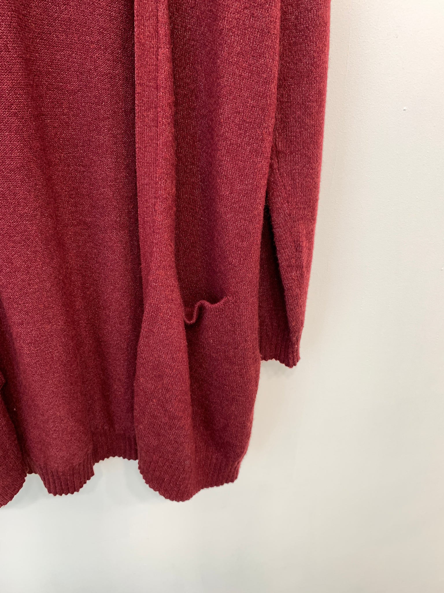 Lang åbenstående strik cardigan med lommer på front, og lange ærmer.