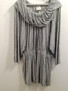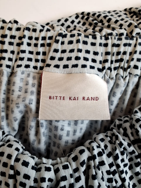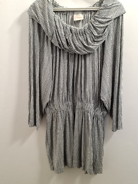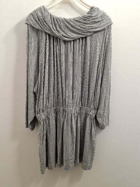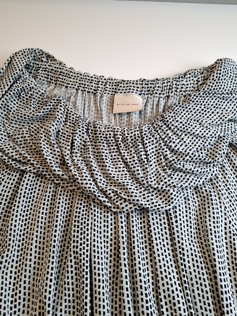 O484 Kjolen har en løs pasform med rynket detaljer ved kraven og taljen. Den er fremstillet i let, åndbart materiale med et mønster af små prikker. Sort-hvid.