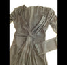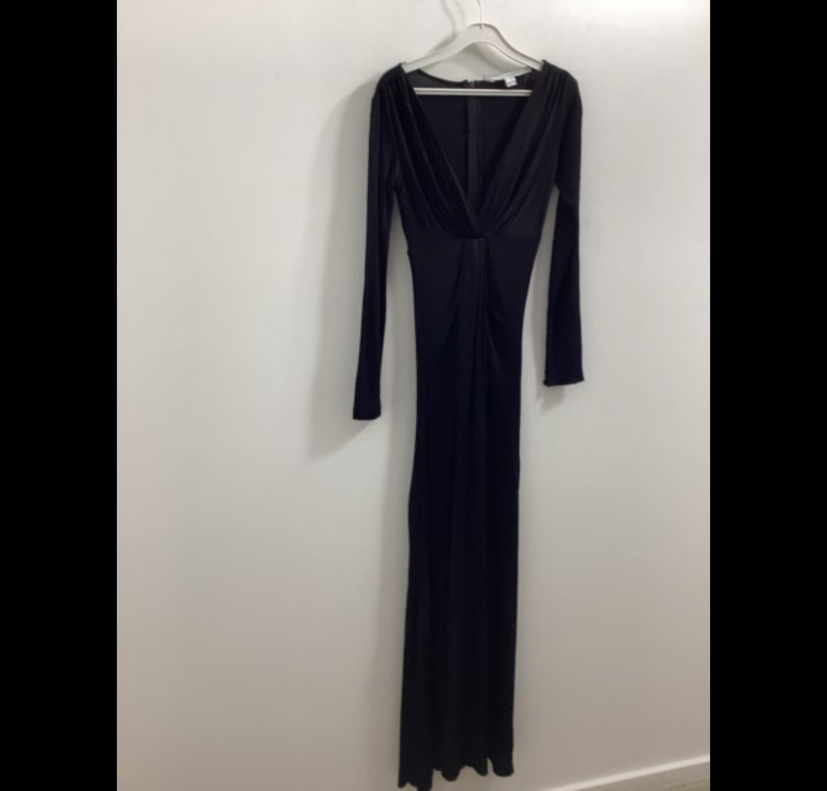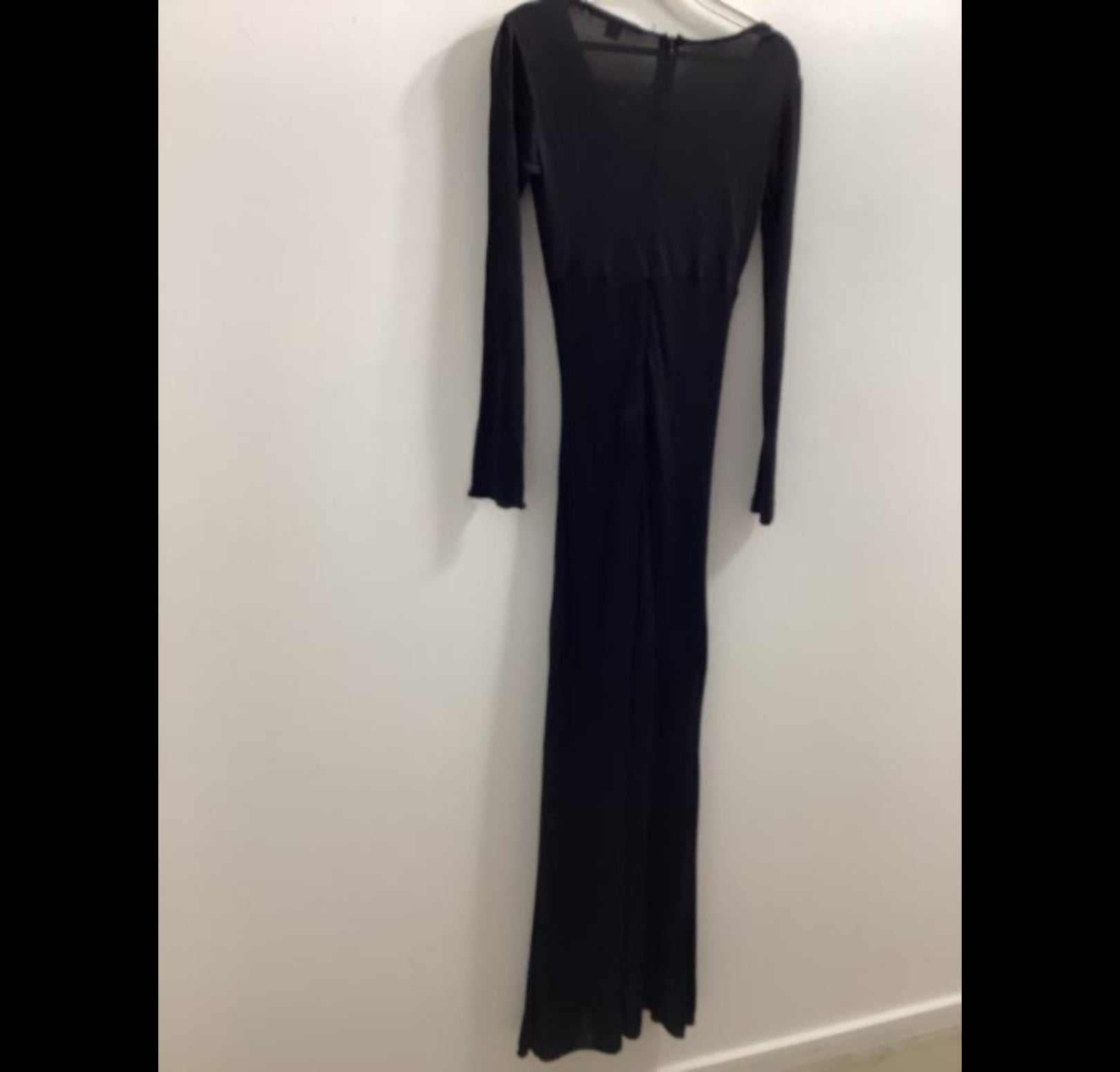 O581 Kjolen er langærmet med en dyb V-udskæring og draperinger ved brystet. Det er tætsiddende og lavet af strækbart materiale. Mærke i ryggen sidder løst se billede