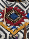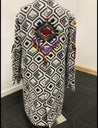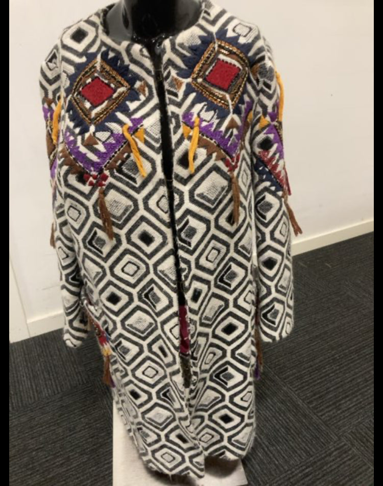 Bazar Deluxe jakke med geometrisk design og broderede detaljer. Den har en åben front og er dekoreret med farverige applikationer.