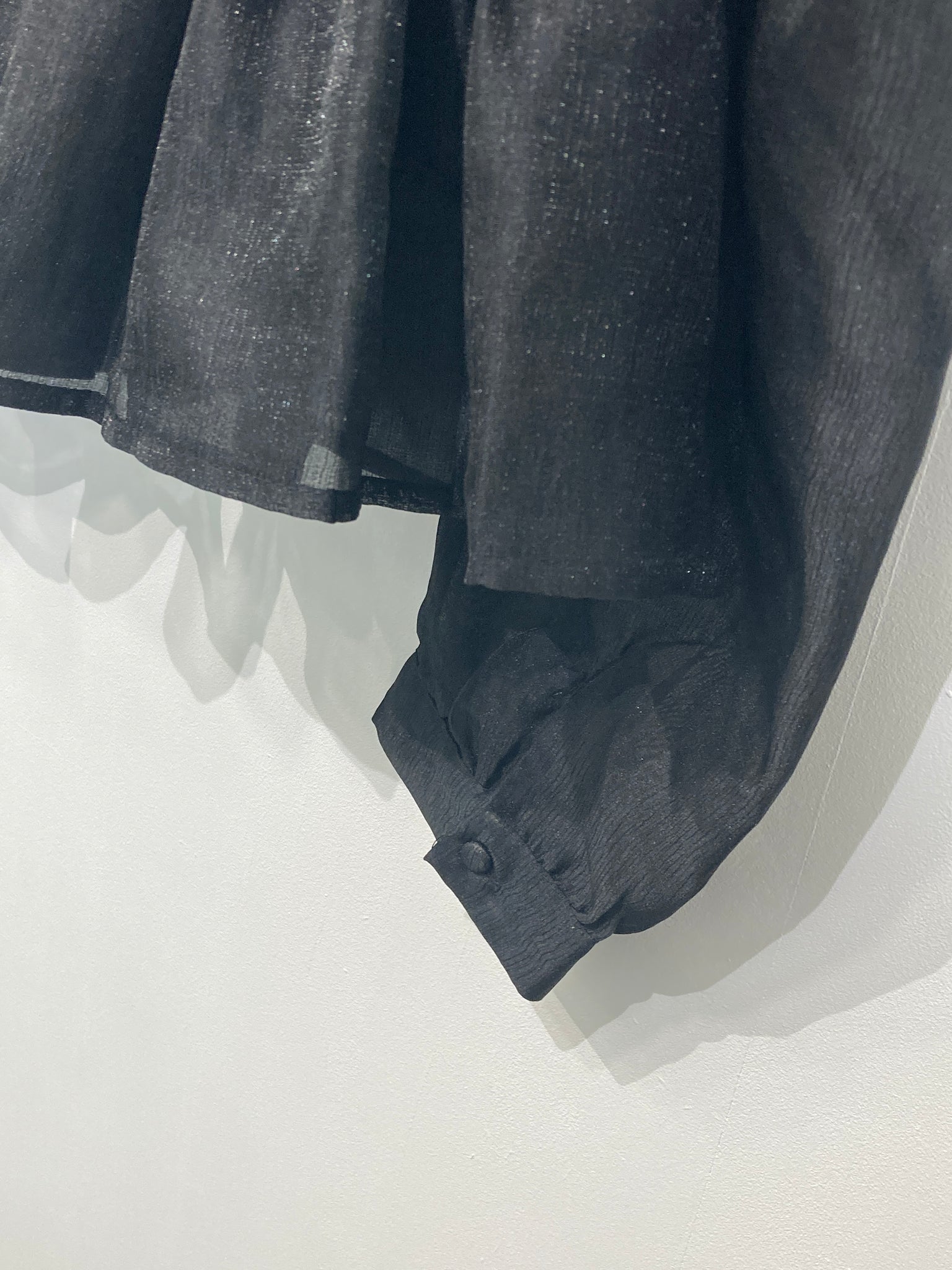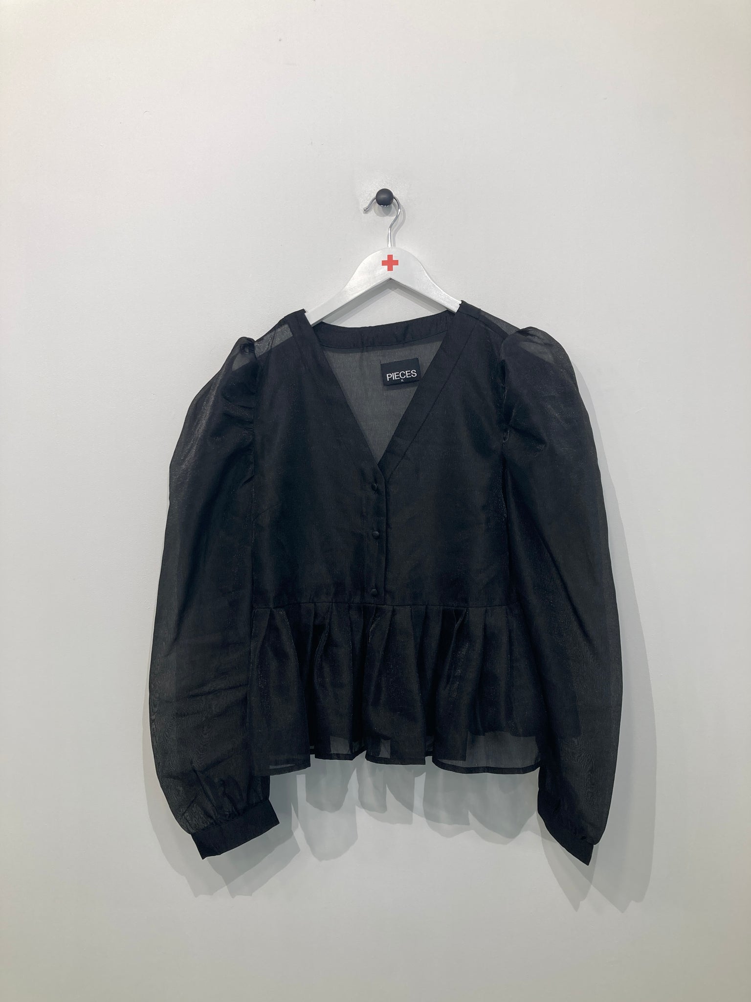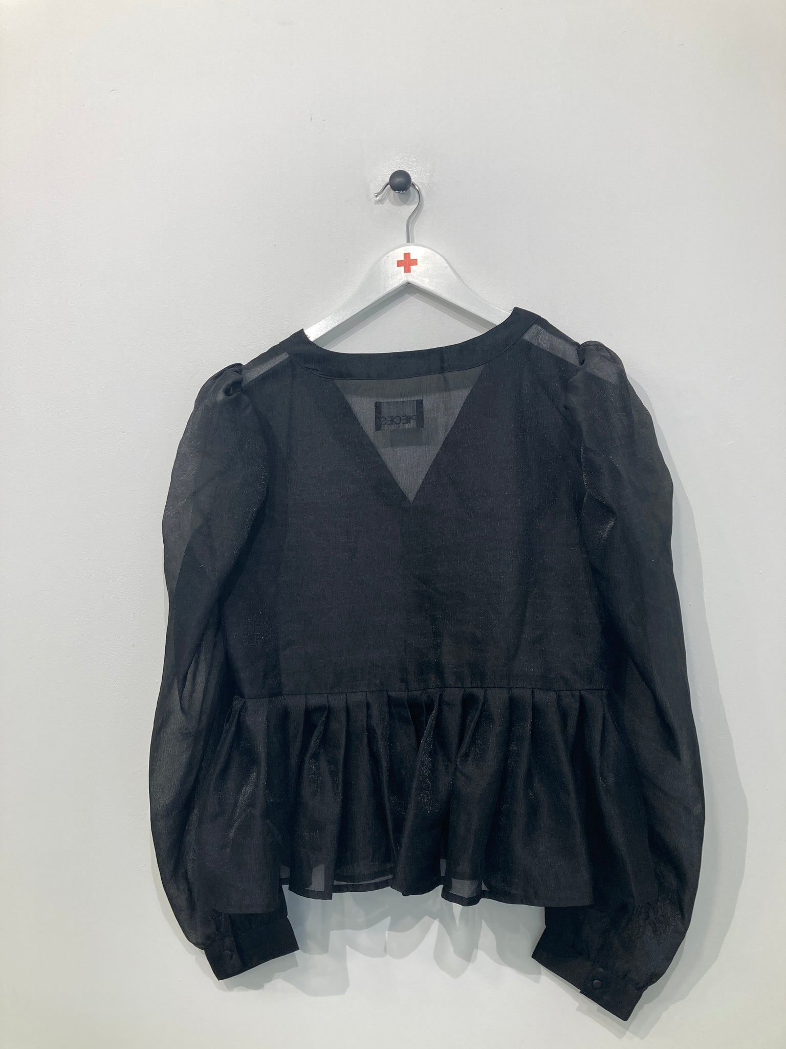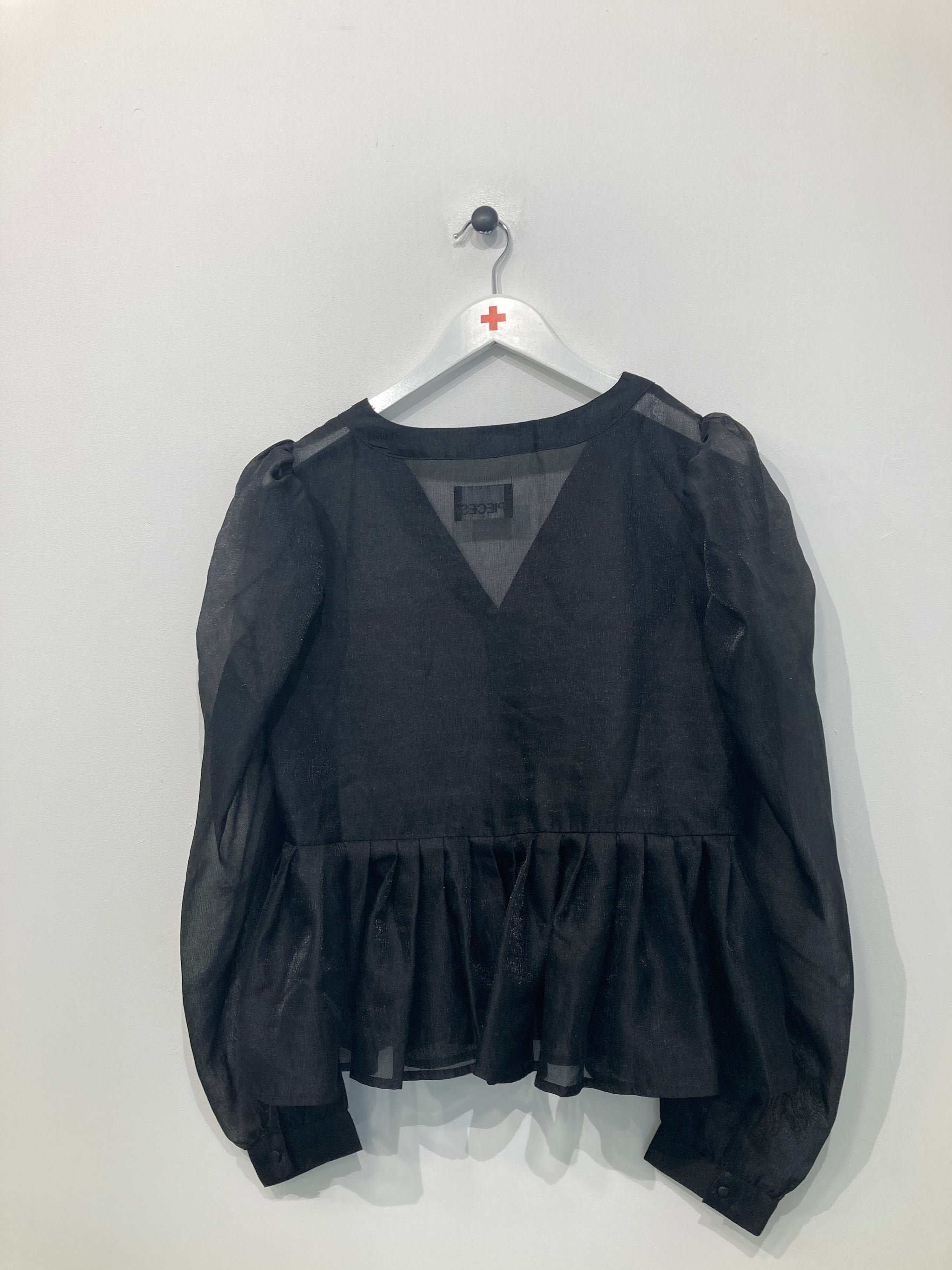 Fin gennemsigtig bluse med lange ærmer, knapper foran ved halsudskæring og vidde forneden.