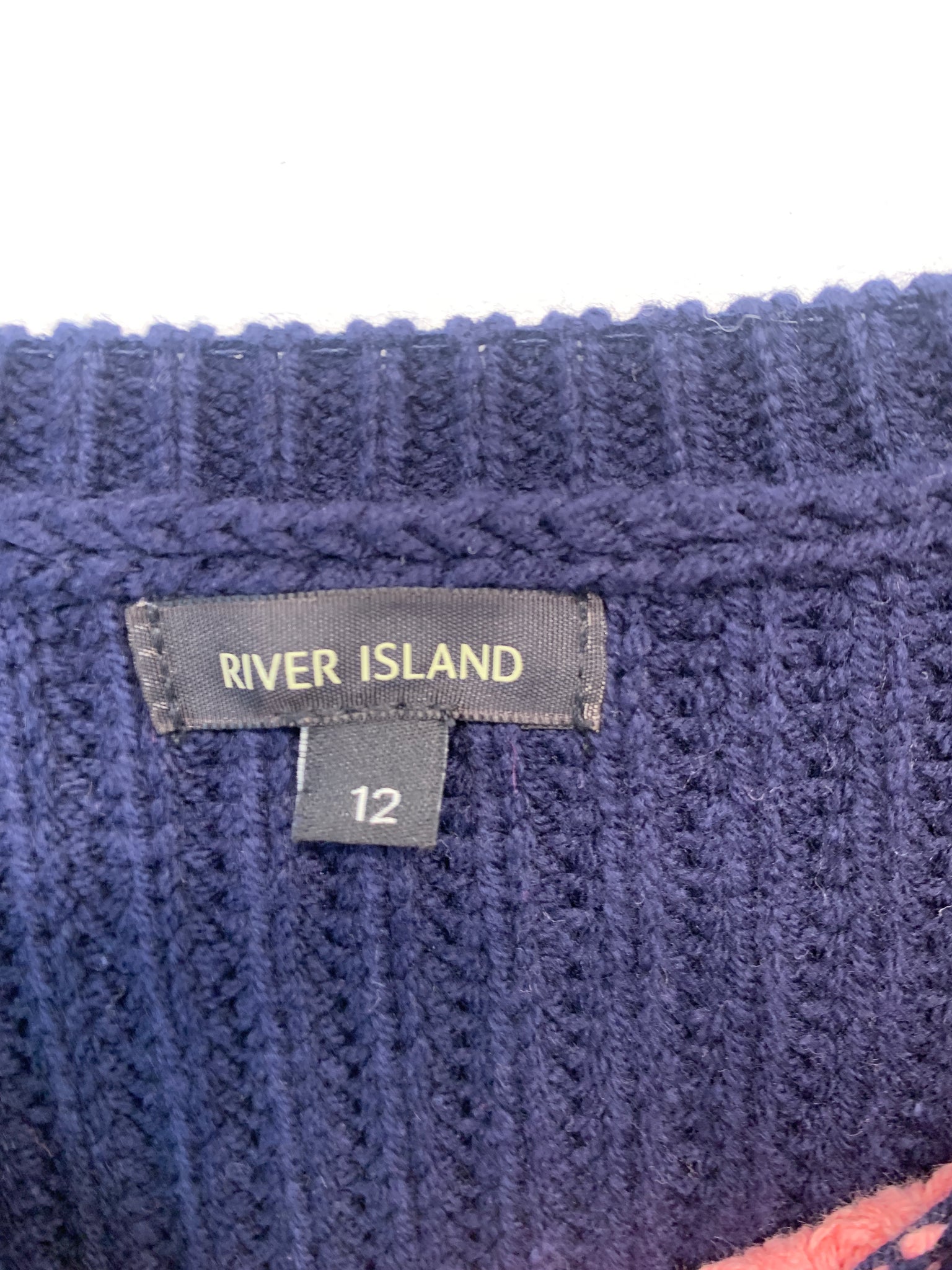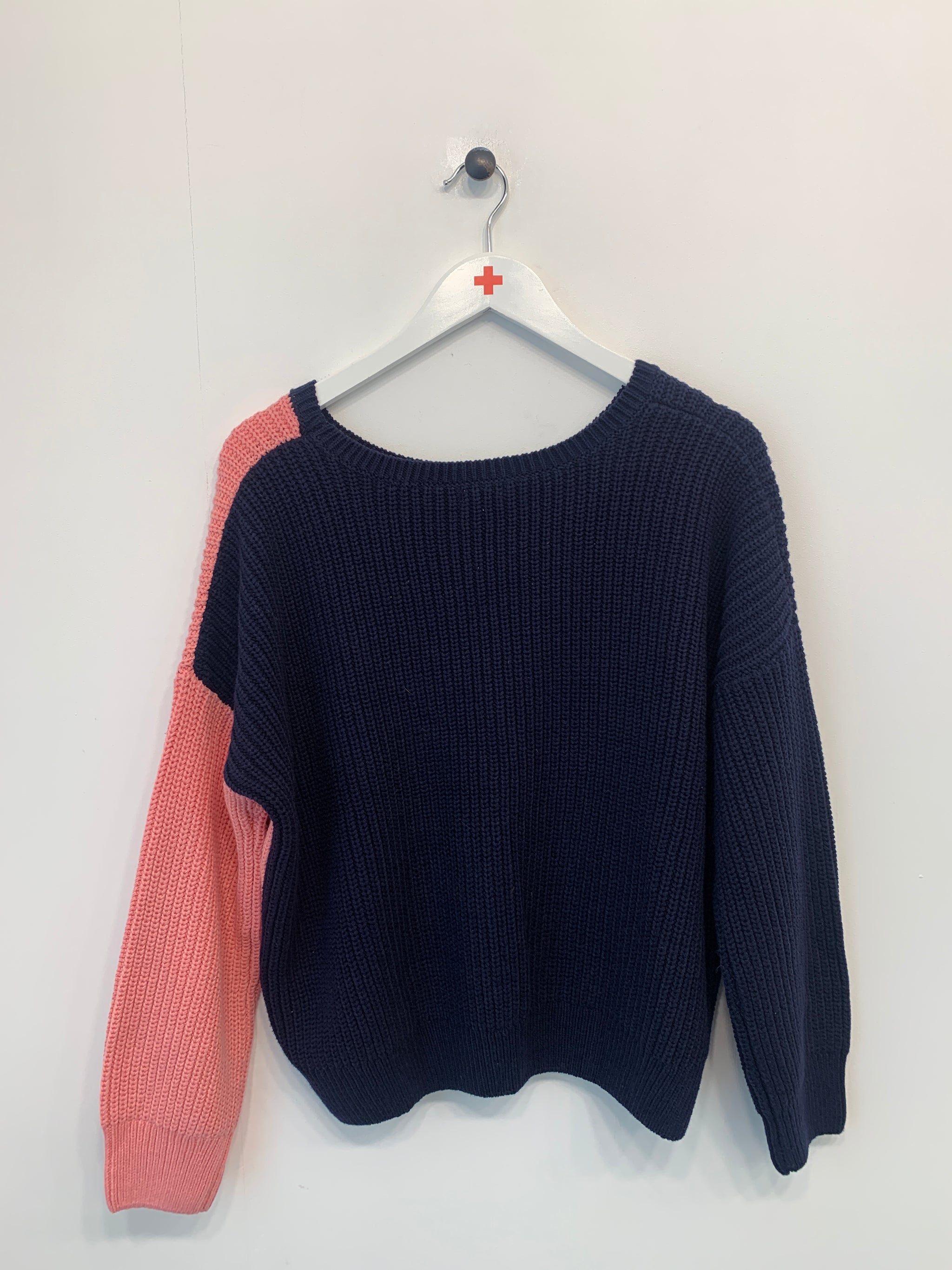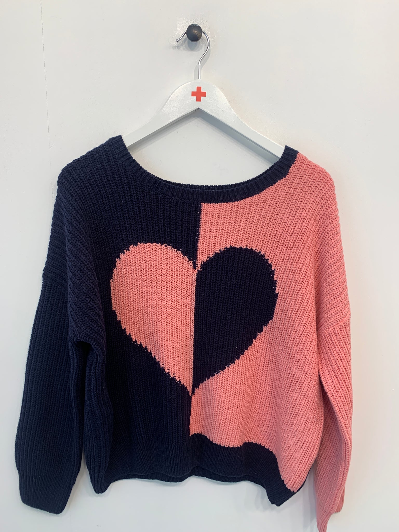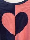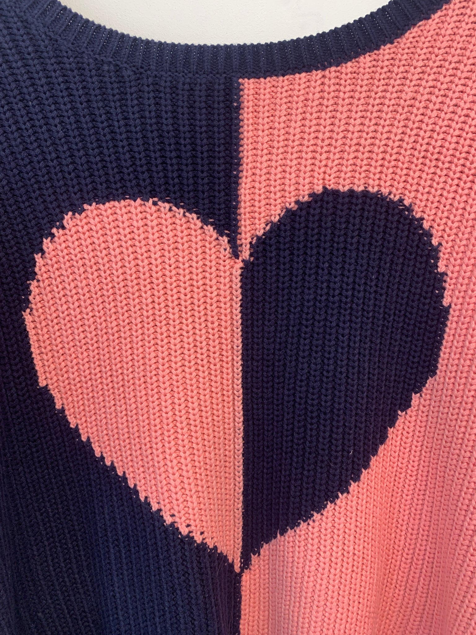 Sød striktrøje med rund hals, lange ærmer og hjerte-motiv foran.