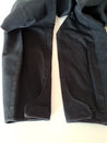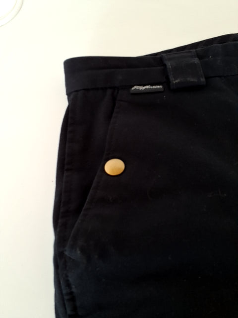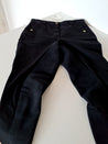 Bukserne har en tætsiddende pasform med to forlommer og en knaplukning.