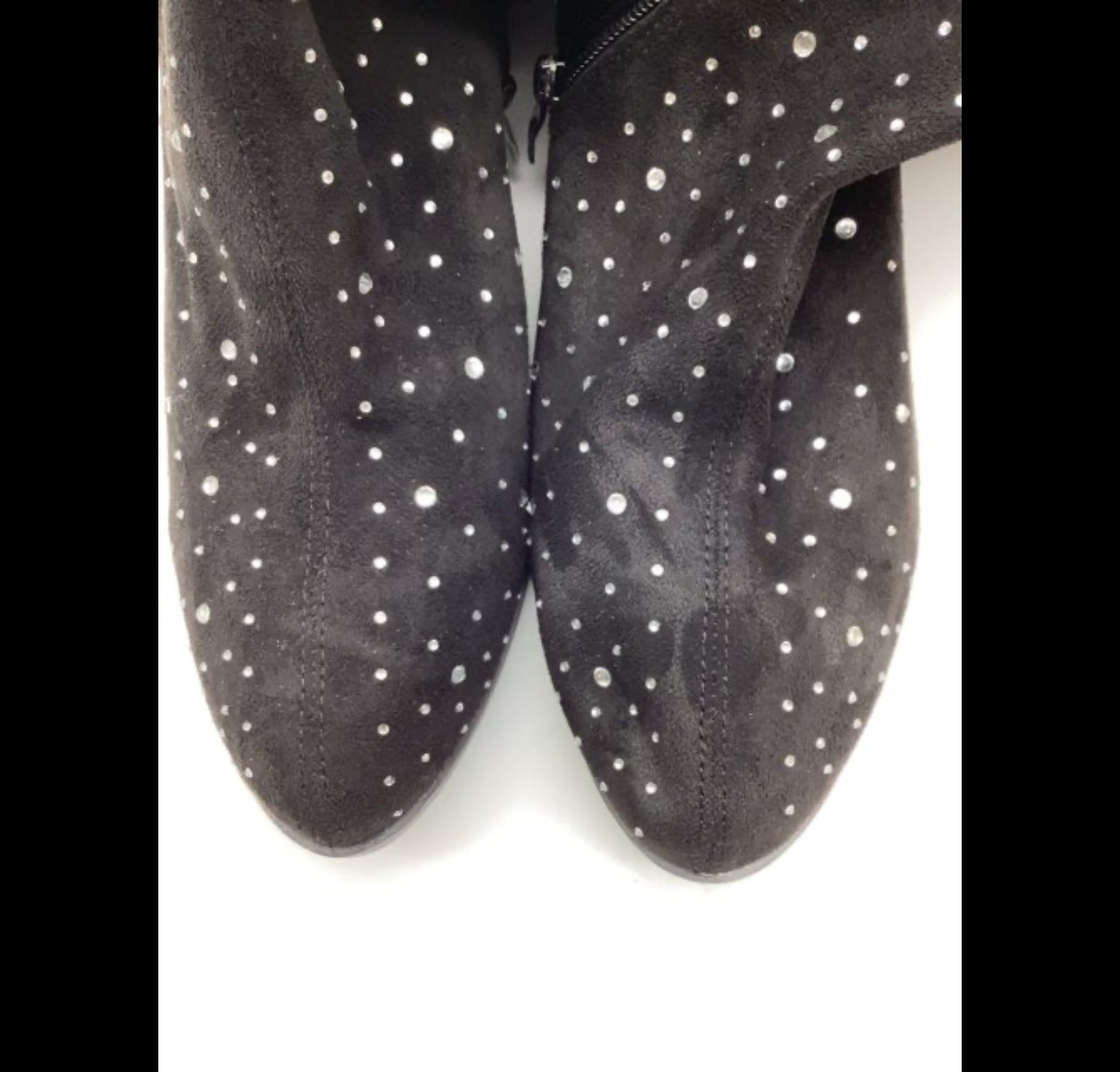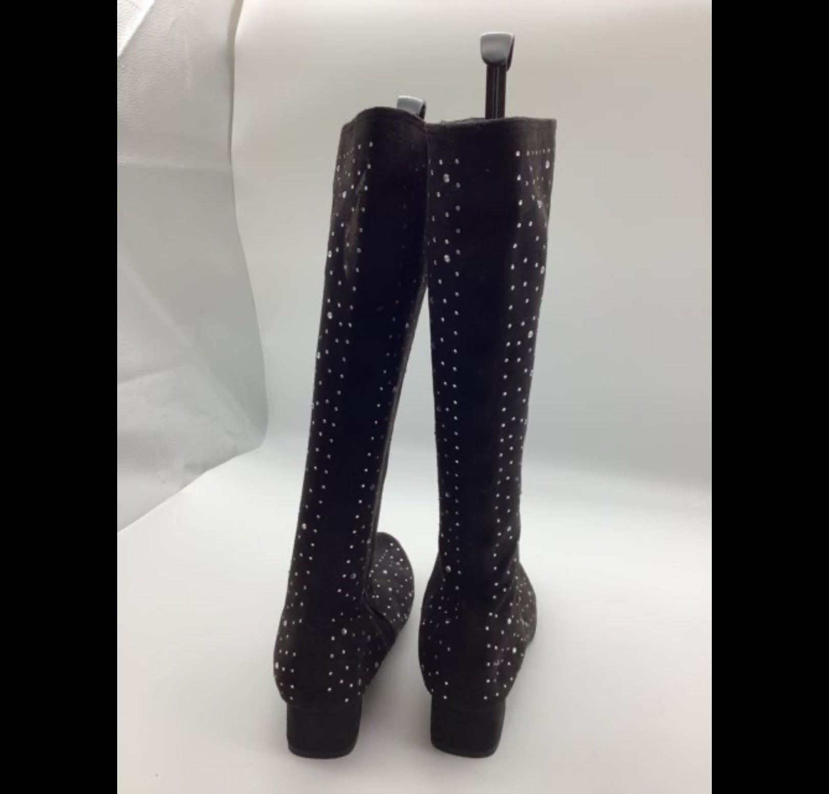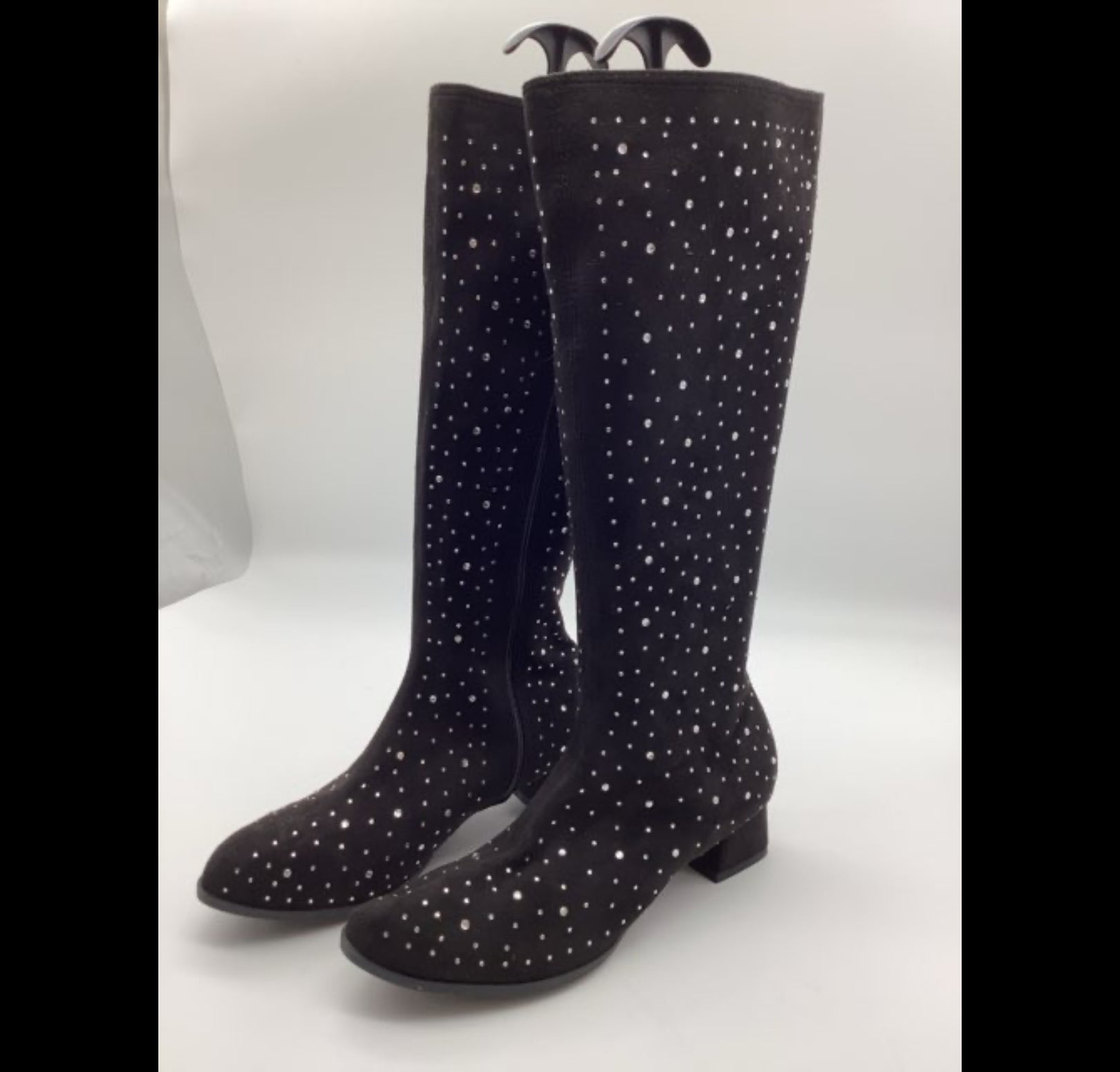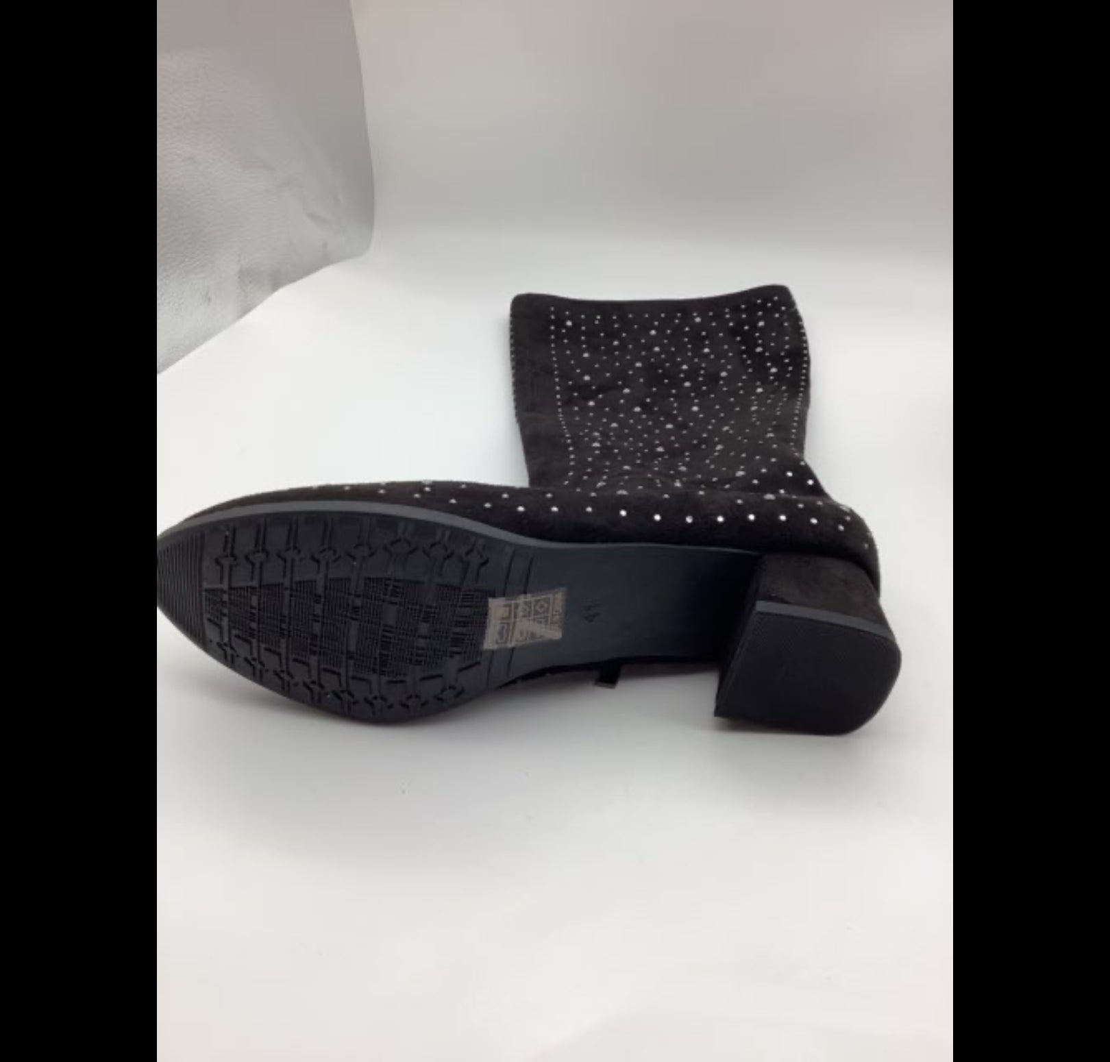 H830 Støvlerne har et høj skaft, er dekoreret med blanke sten og har en let hæl på 4 cm. Materialet er ruskind, sål i gummi.