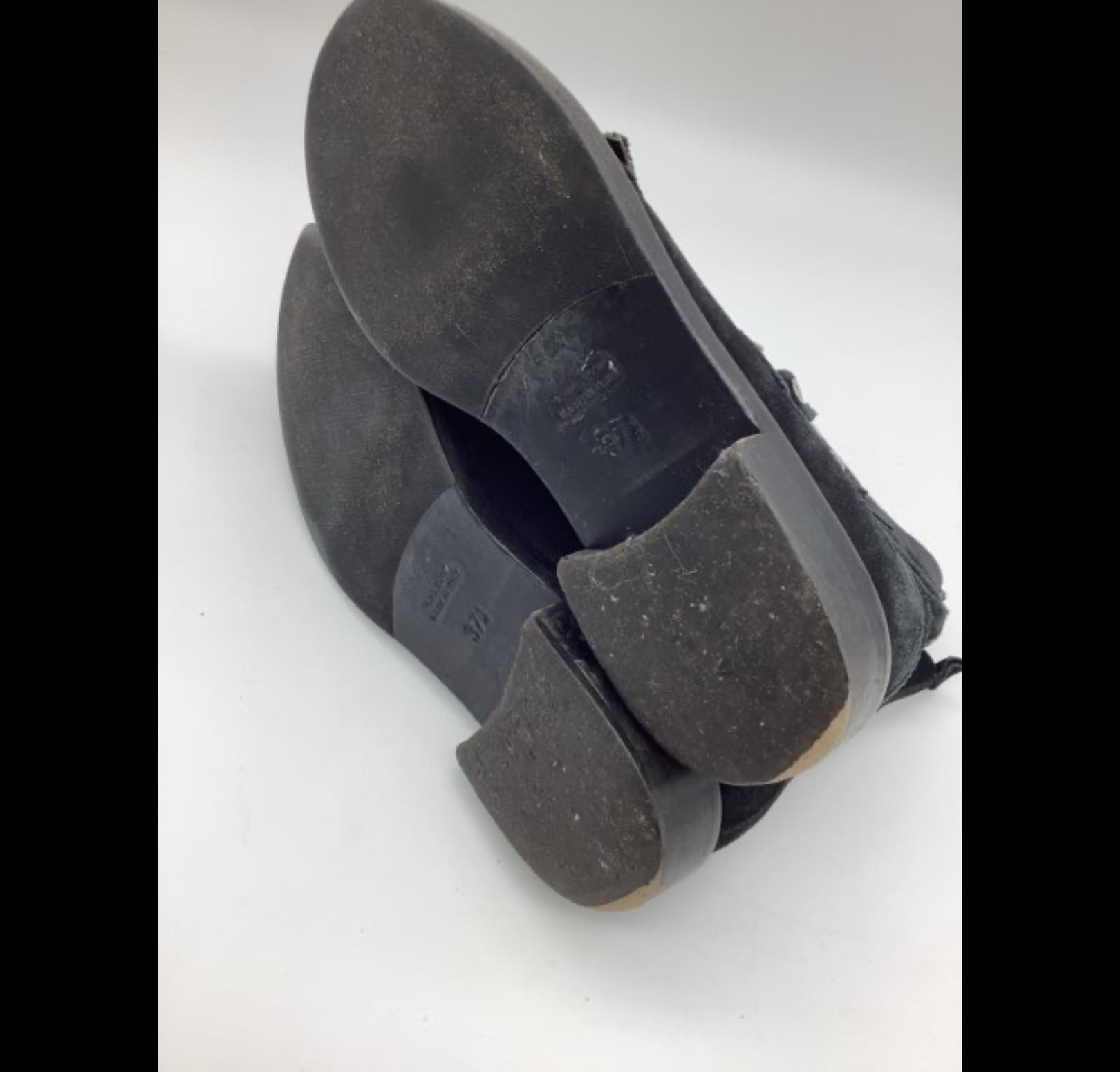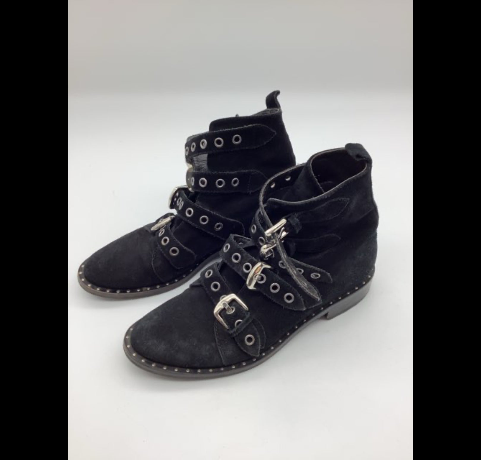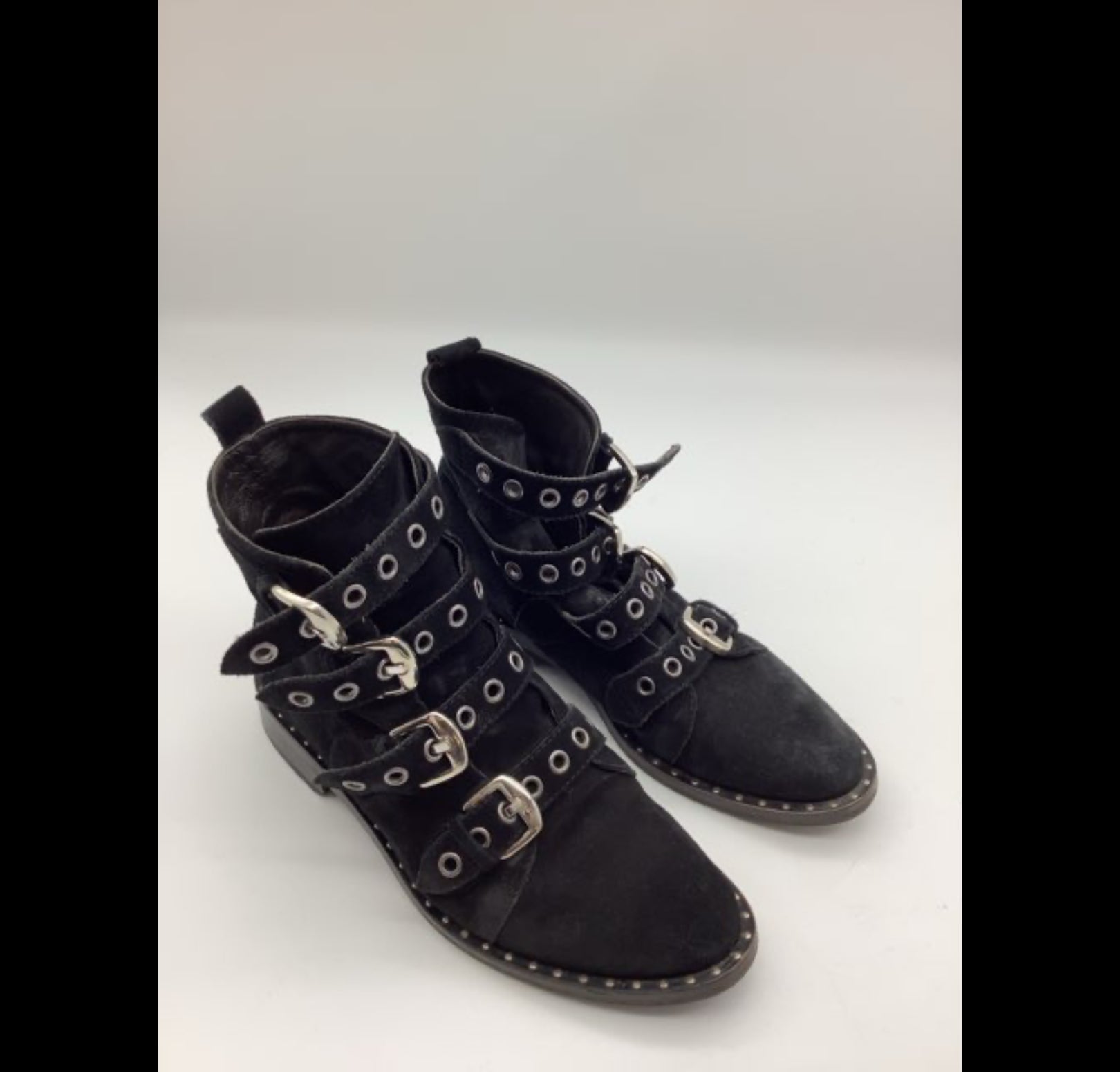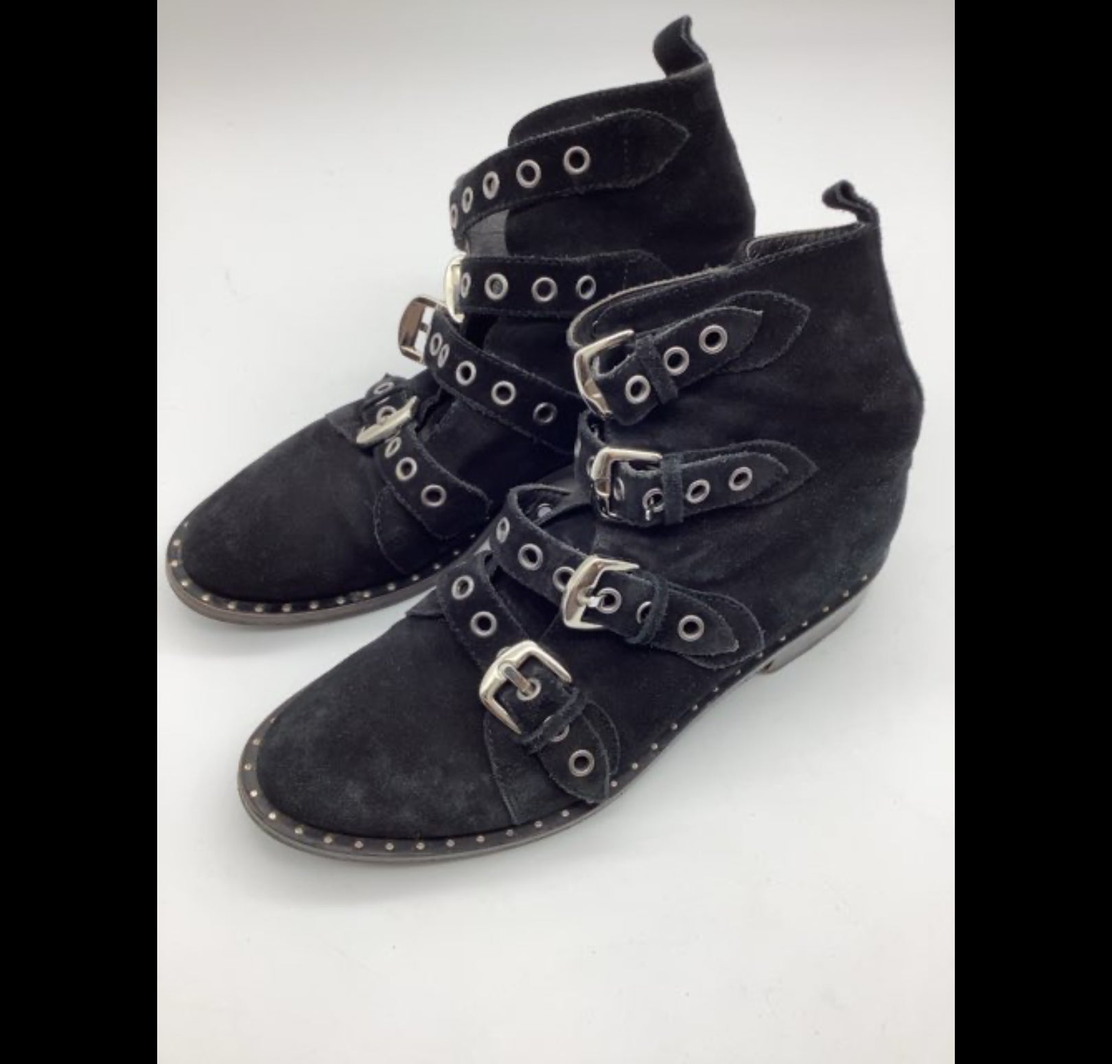 H848 Støvlerne har en kort, moderne silhuet med flere spænder og nitter. Materialet er blødt ruskind. Slitage på hæle.