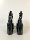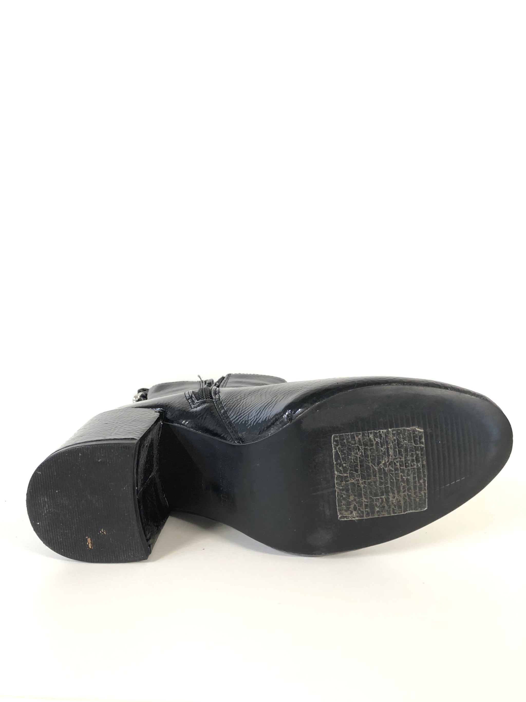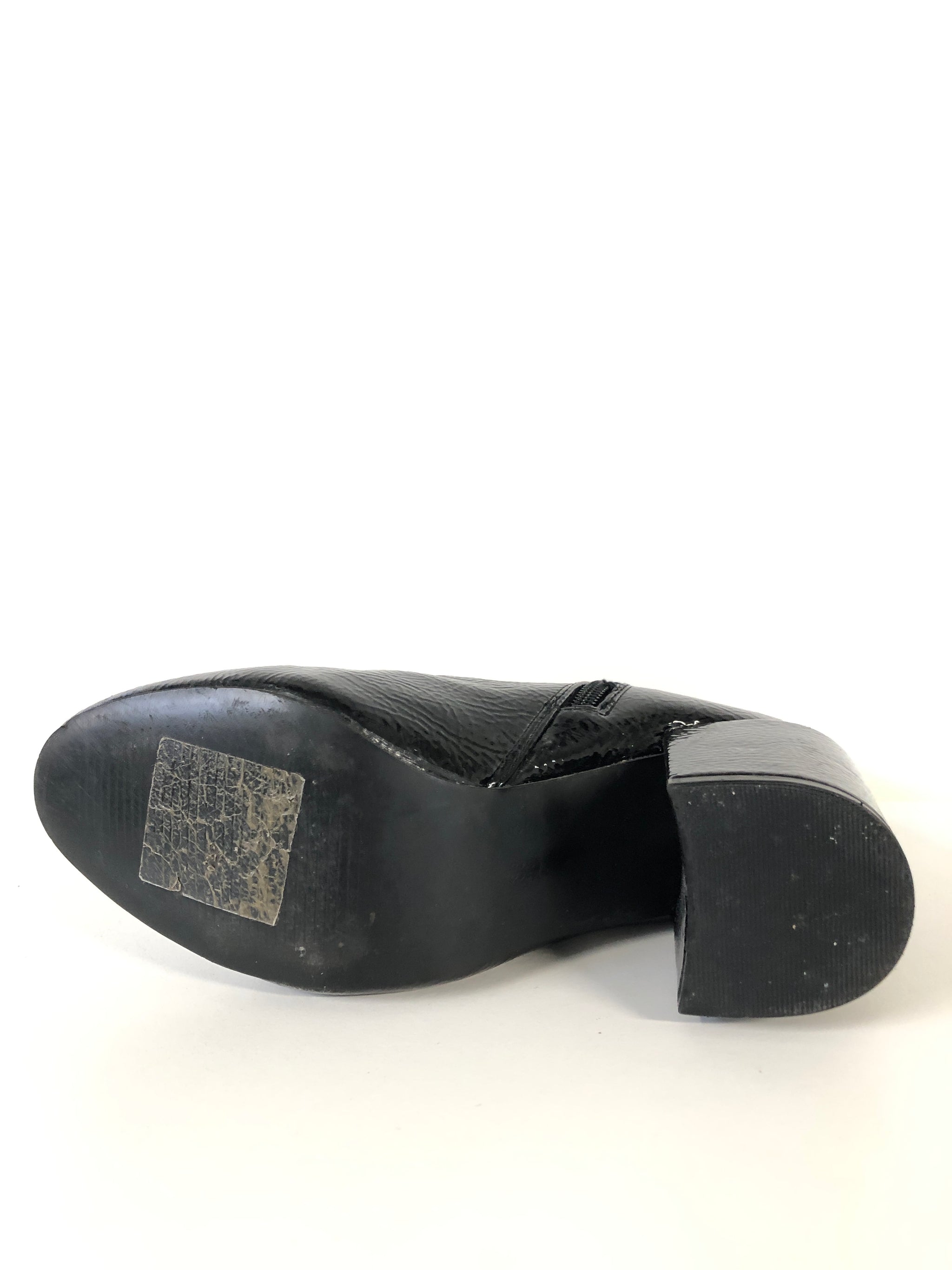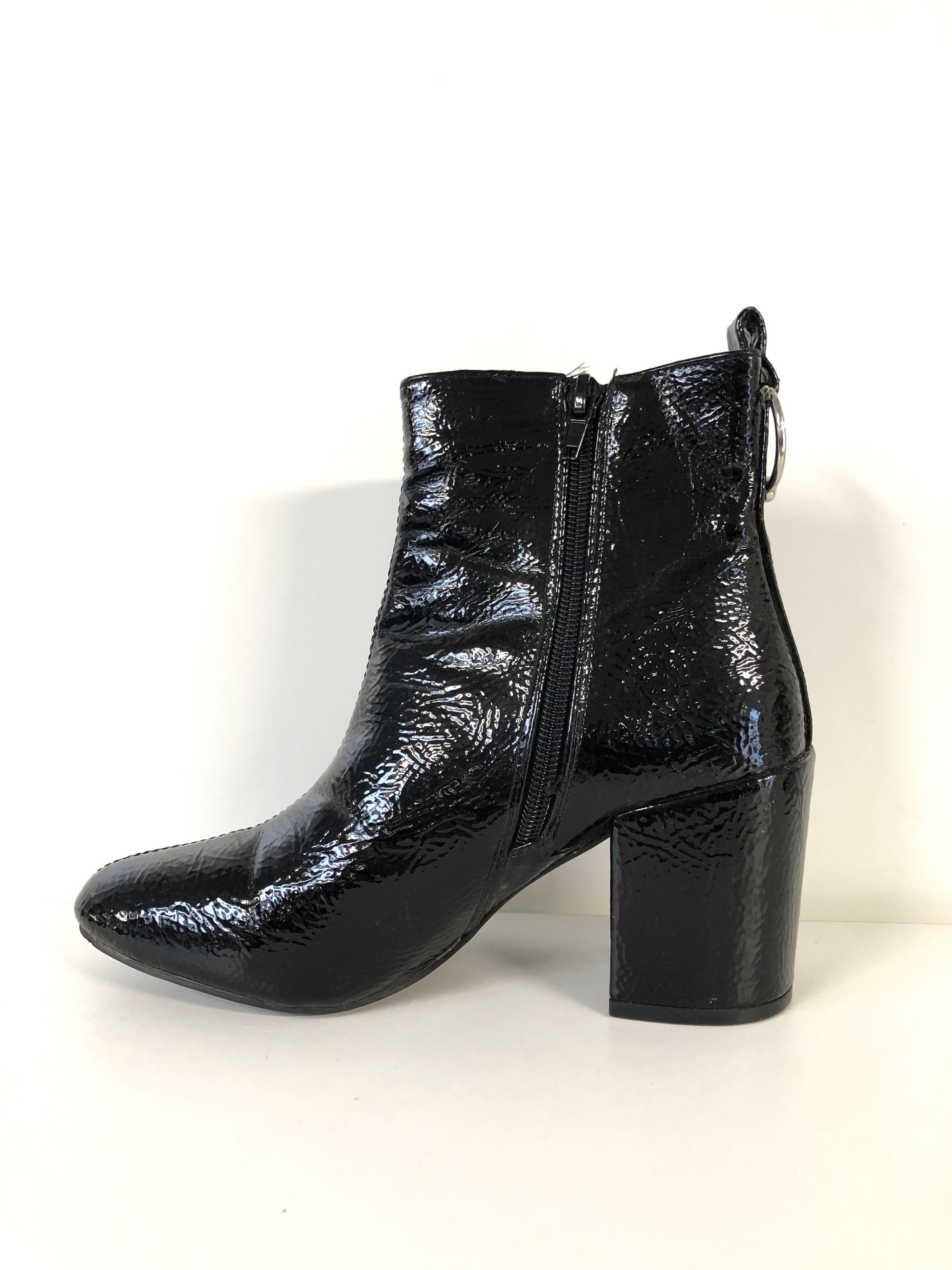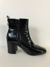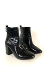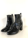 Elegant ankelstøvle i sort laklæder med spids tå og solid blokhæl