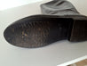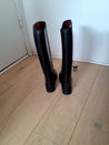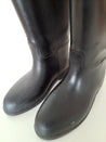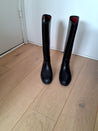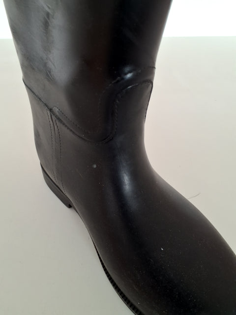 Støvlerne er høje, glatte og lavet af gummi med en blank overflade.