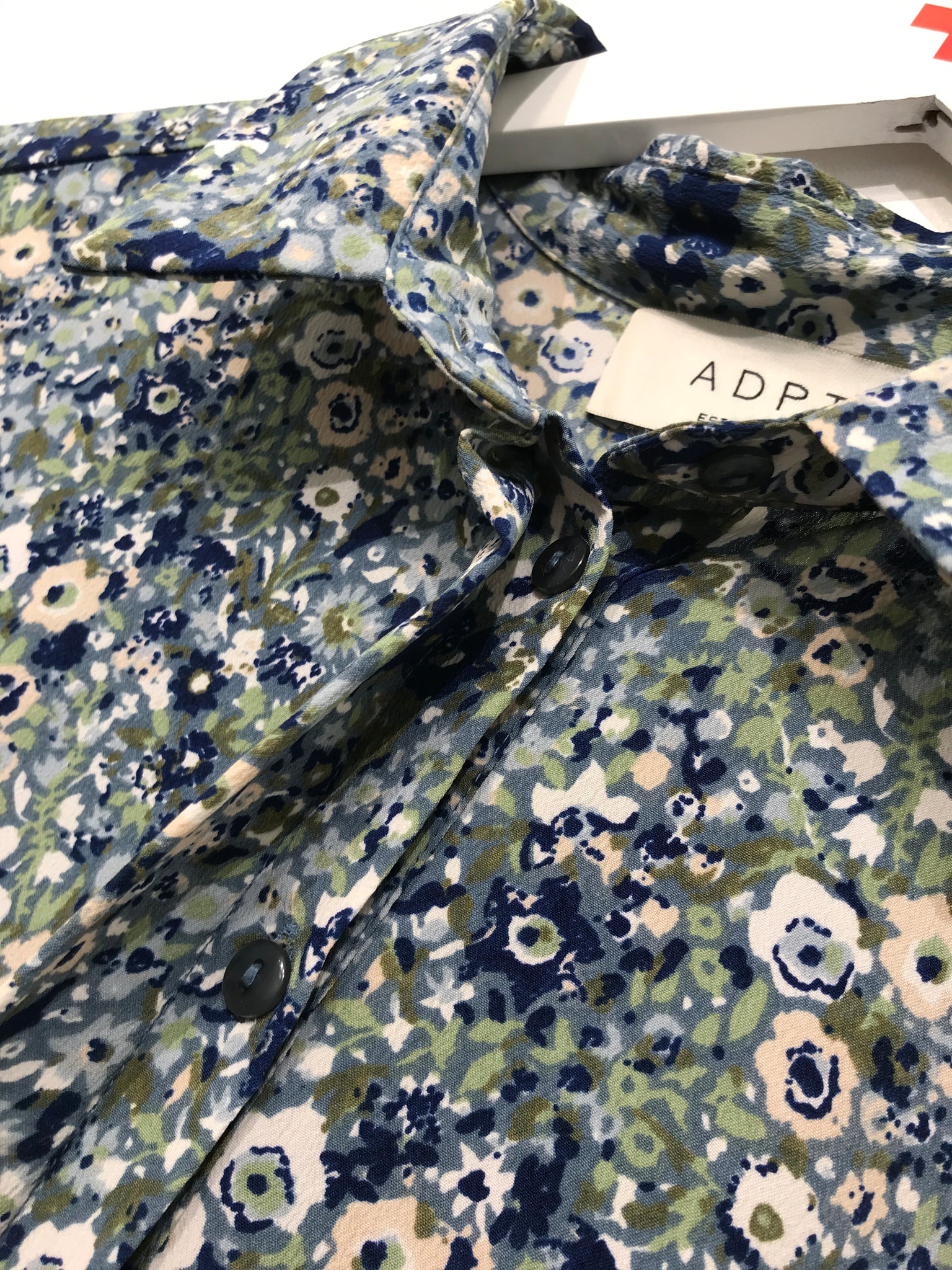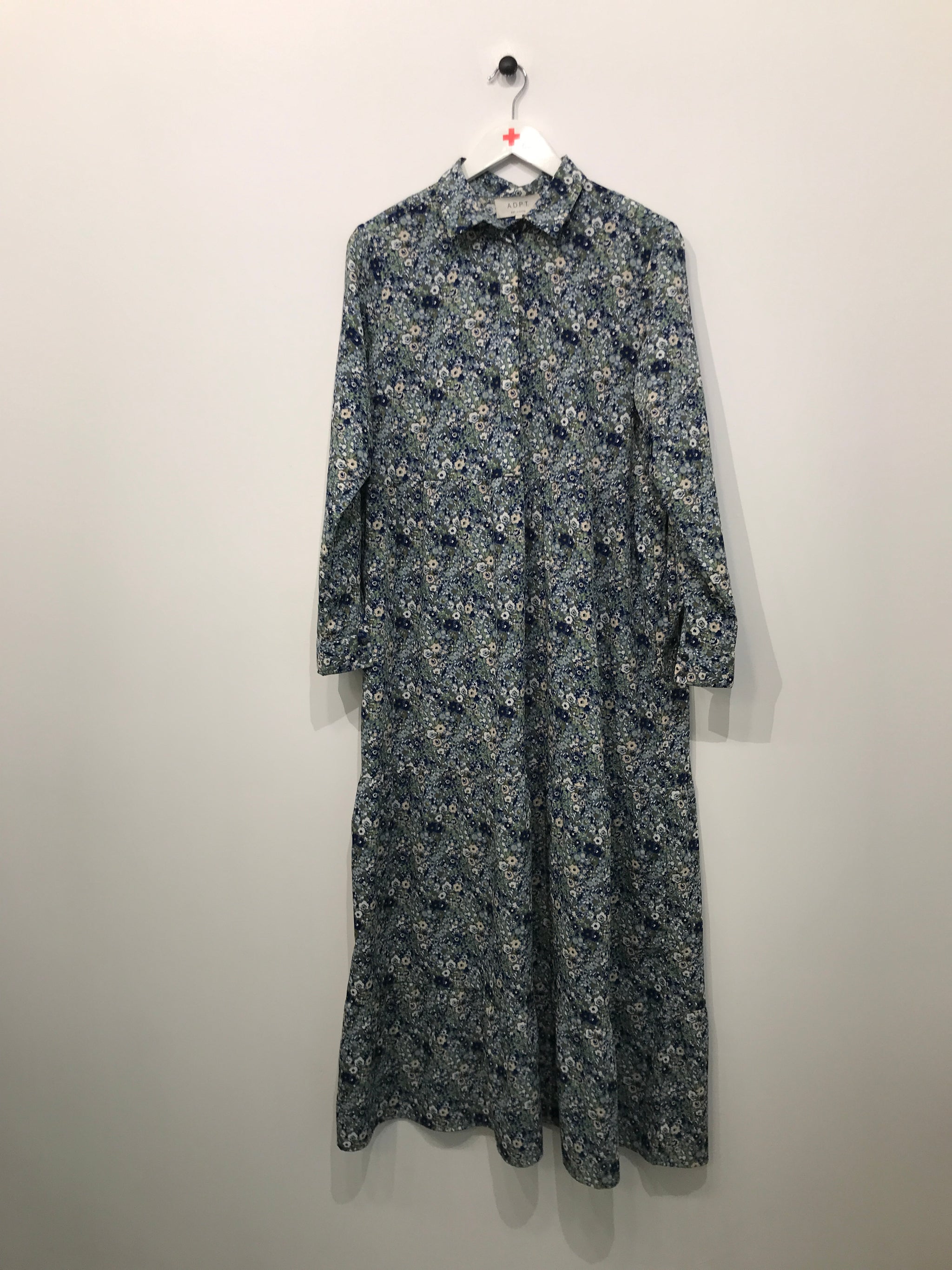 Lang kjole med etager, løs pasform og skjult knaplukning.