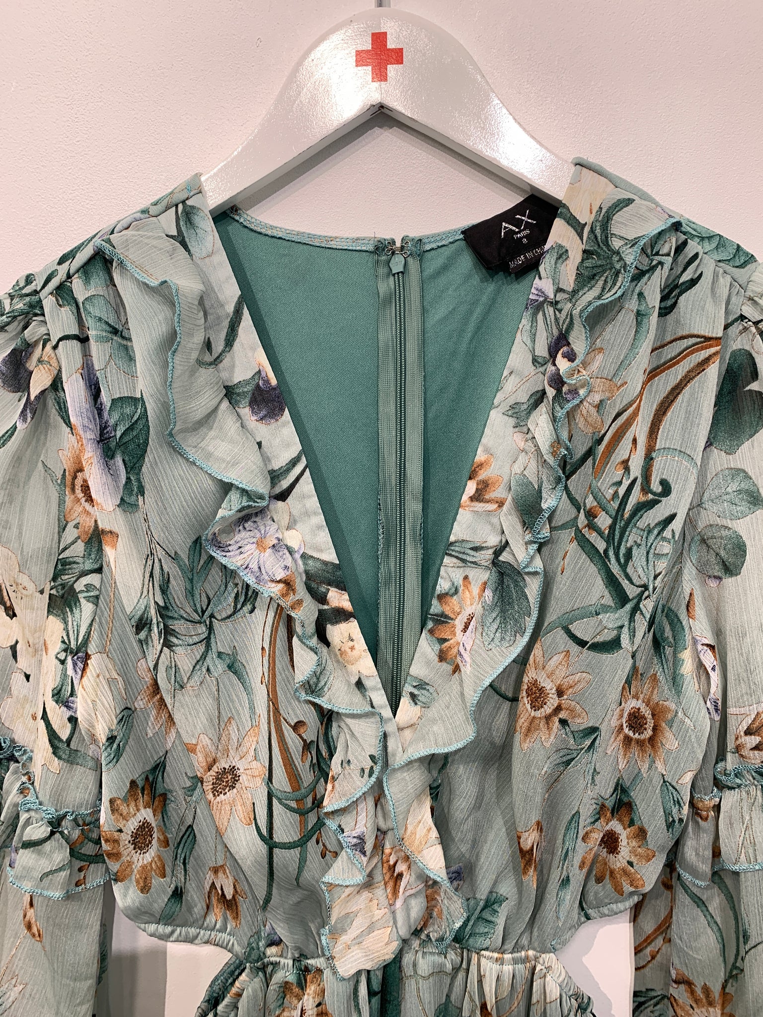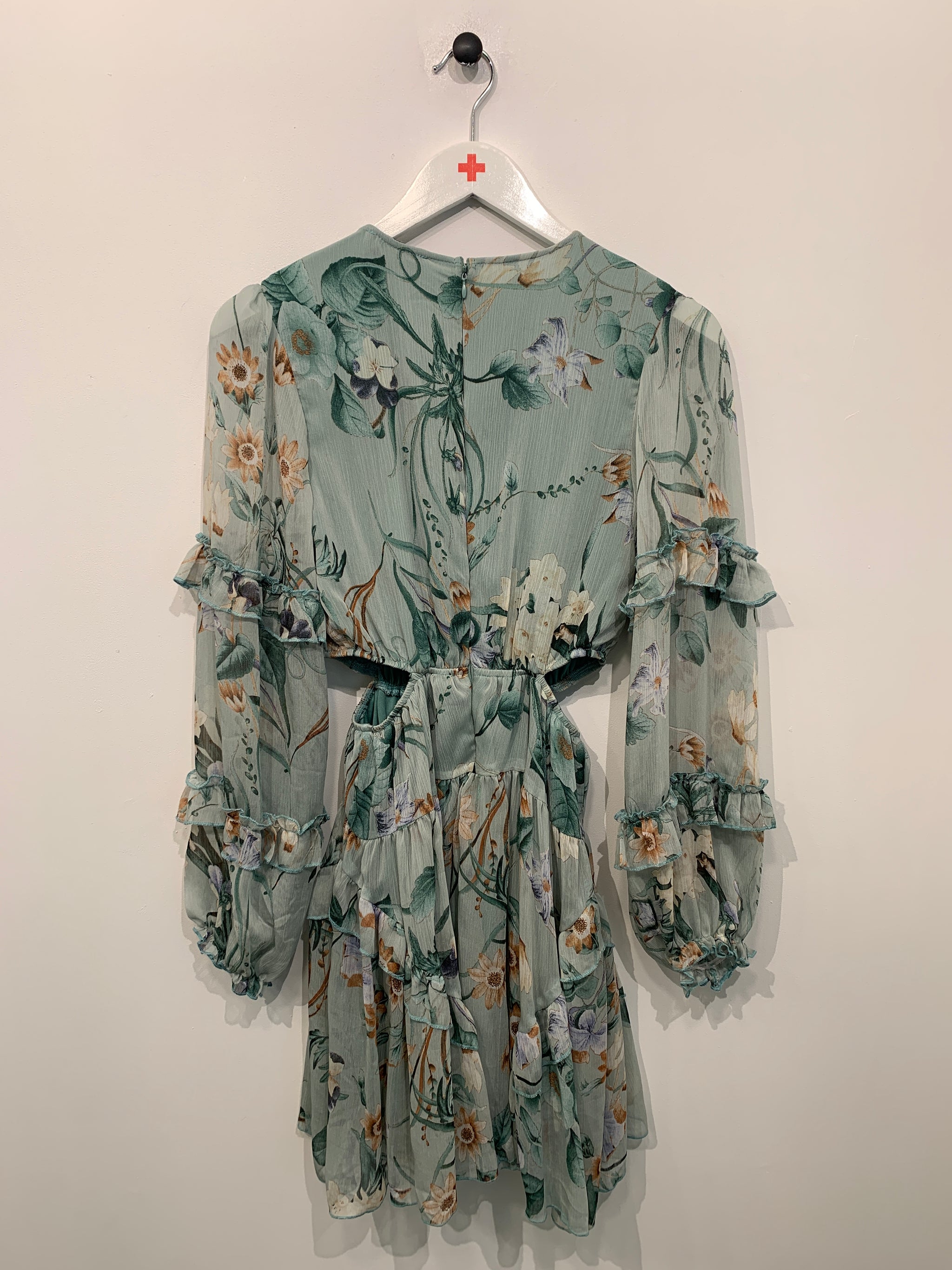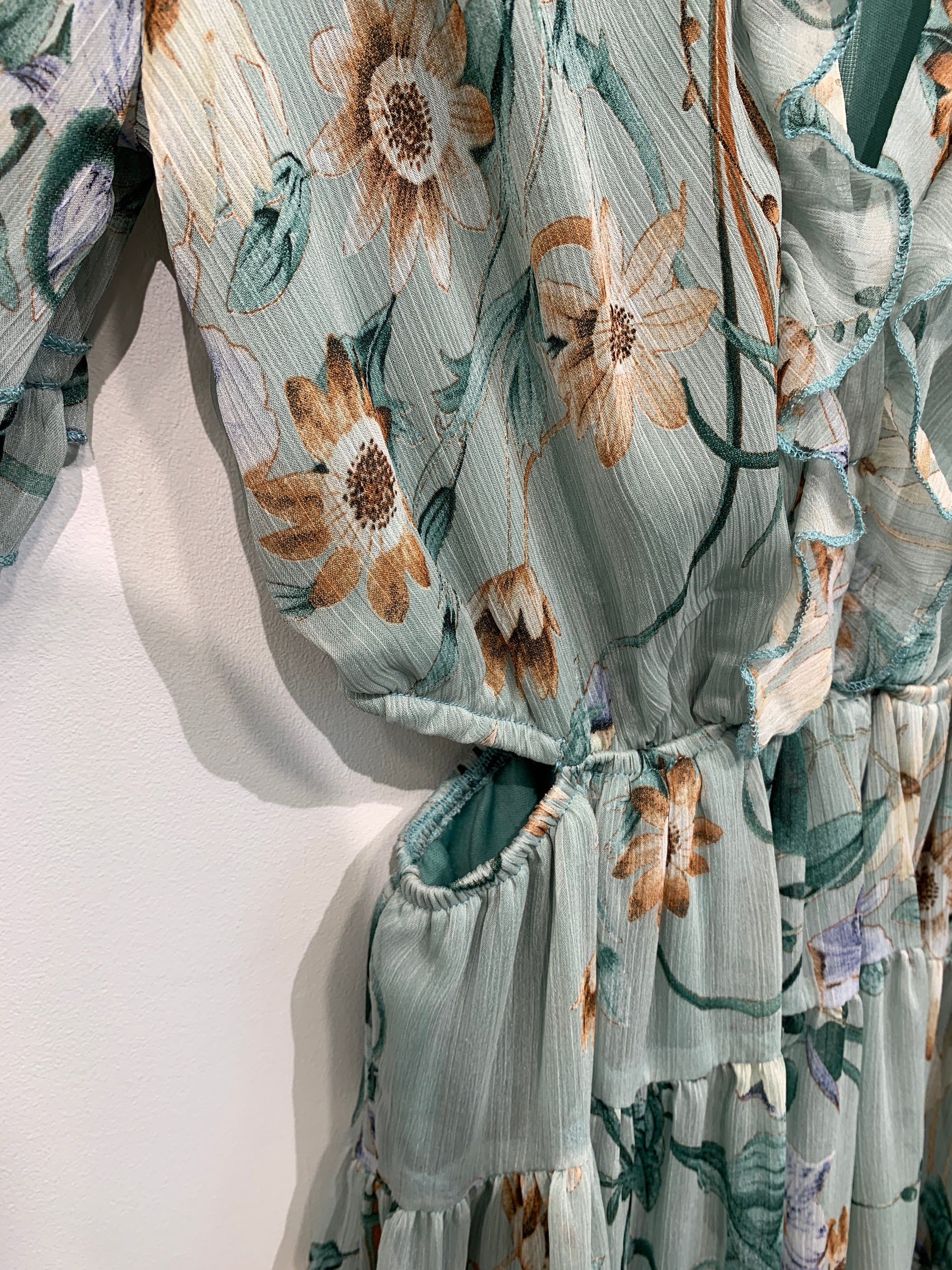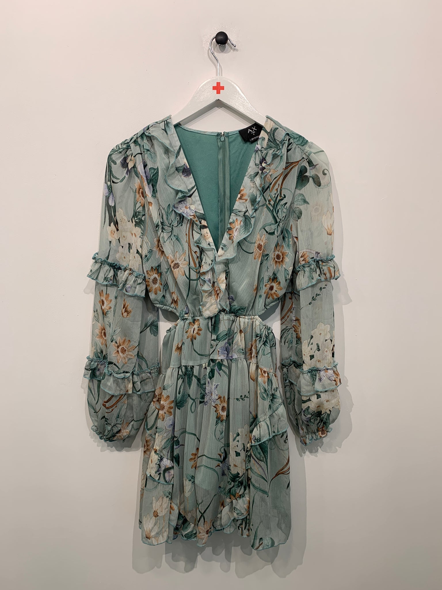 Fin kjole med flæser. Kjolen er åben i siderne af taljen.
