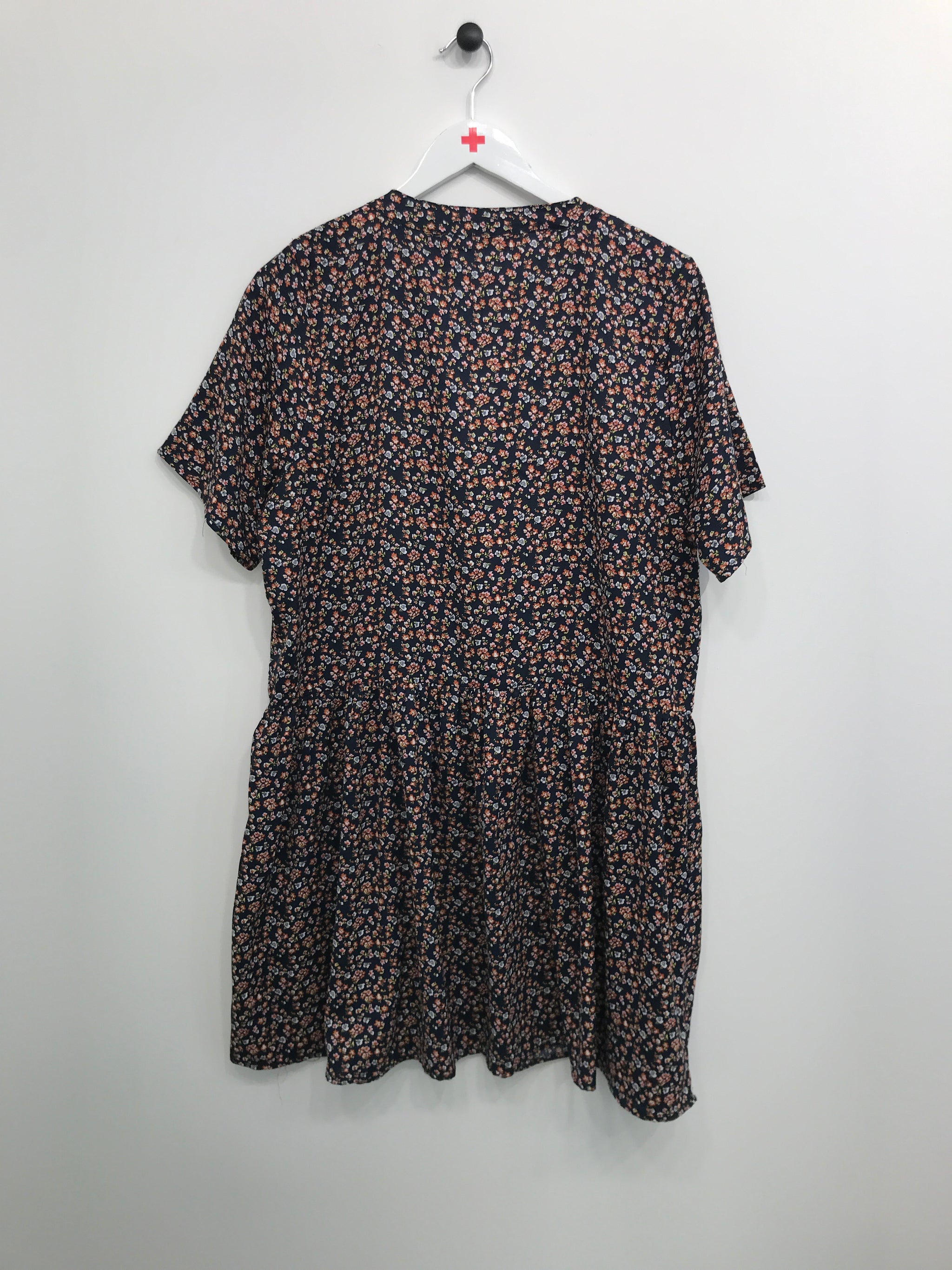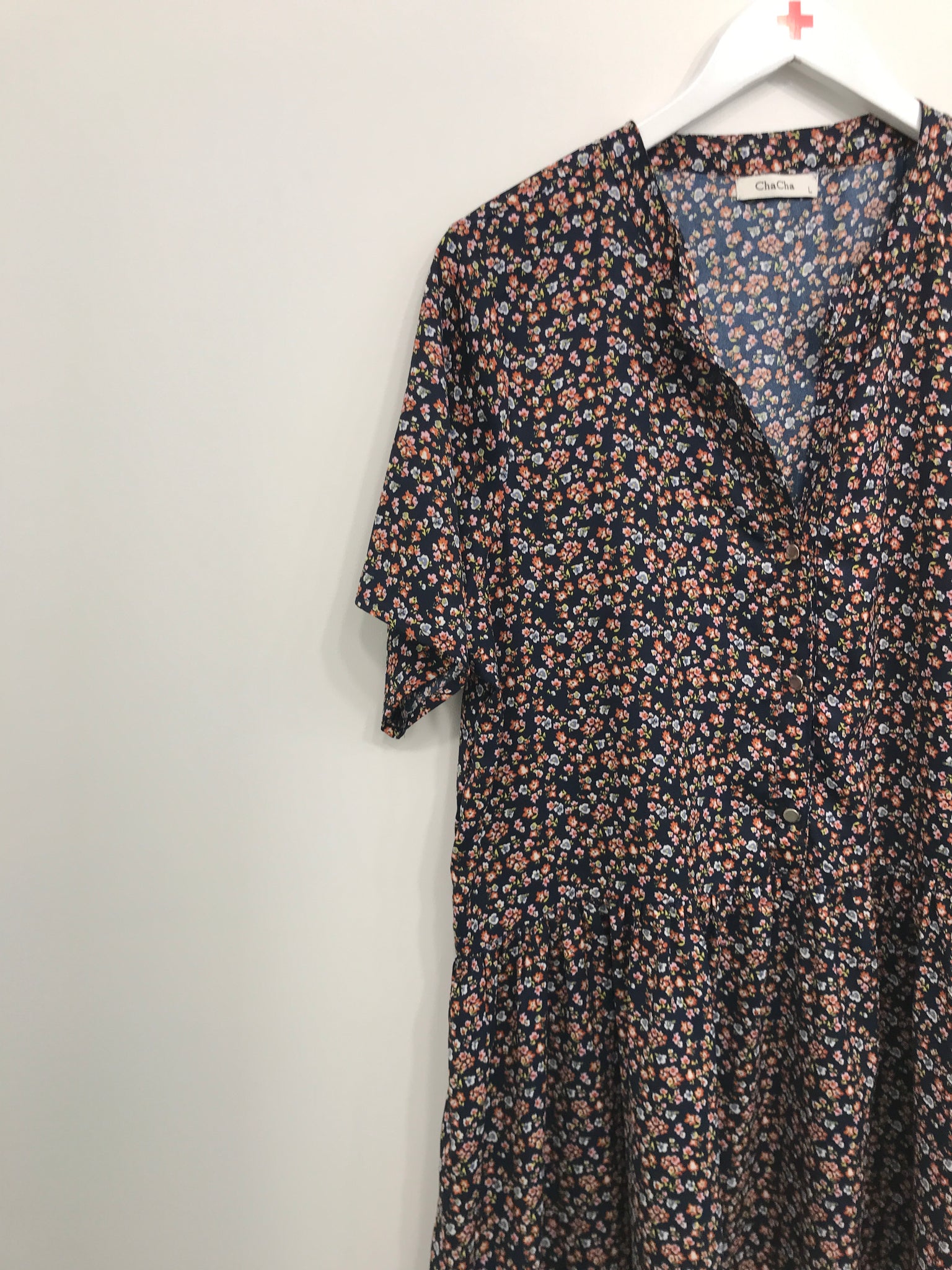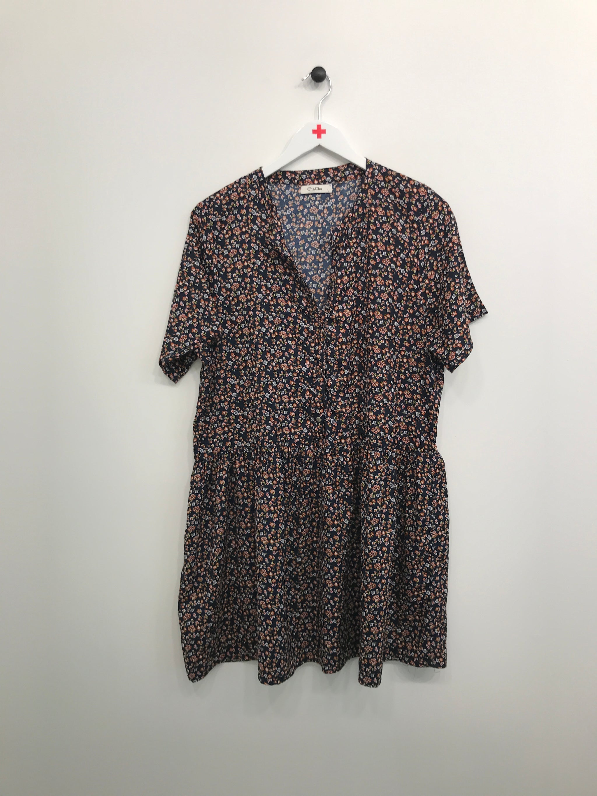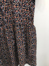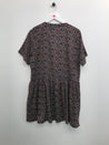 Kjole med knaplukning øverst på front, korte ærmer og flæse forneden.