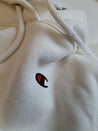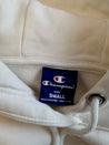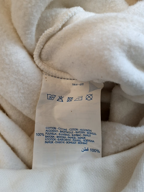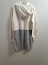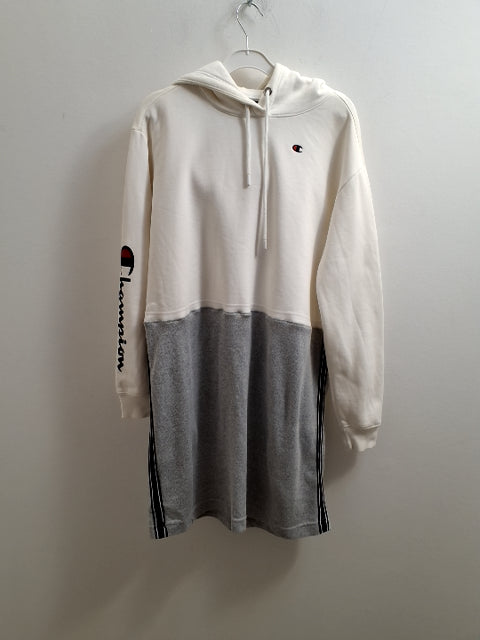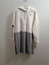 O663 Produktet er en sweatshirtkjole med hætte. Den har en lys overdel og en grå underdel.
