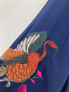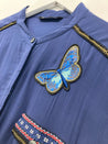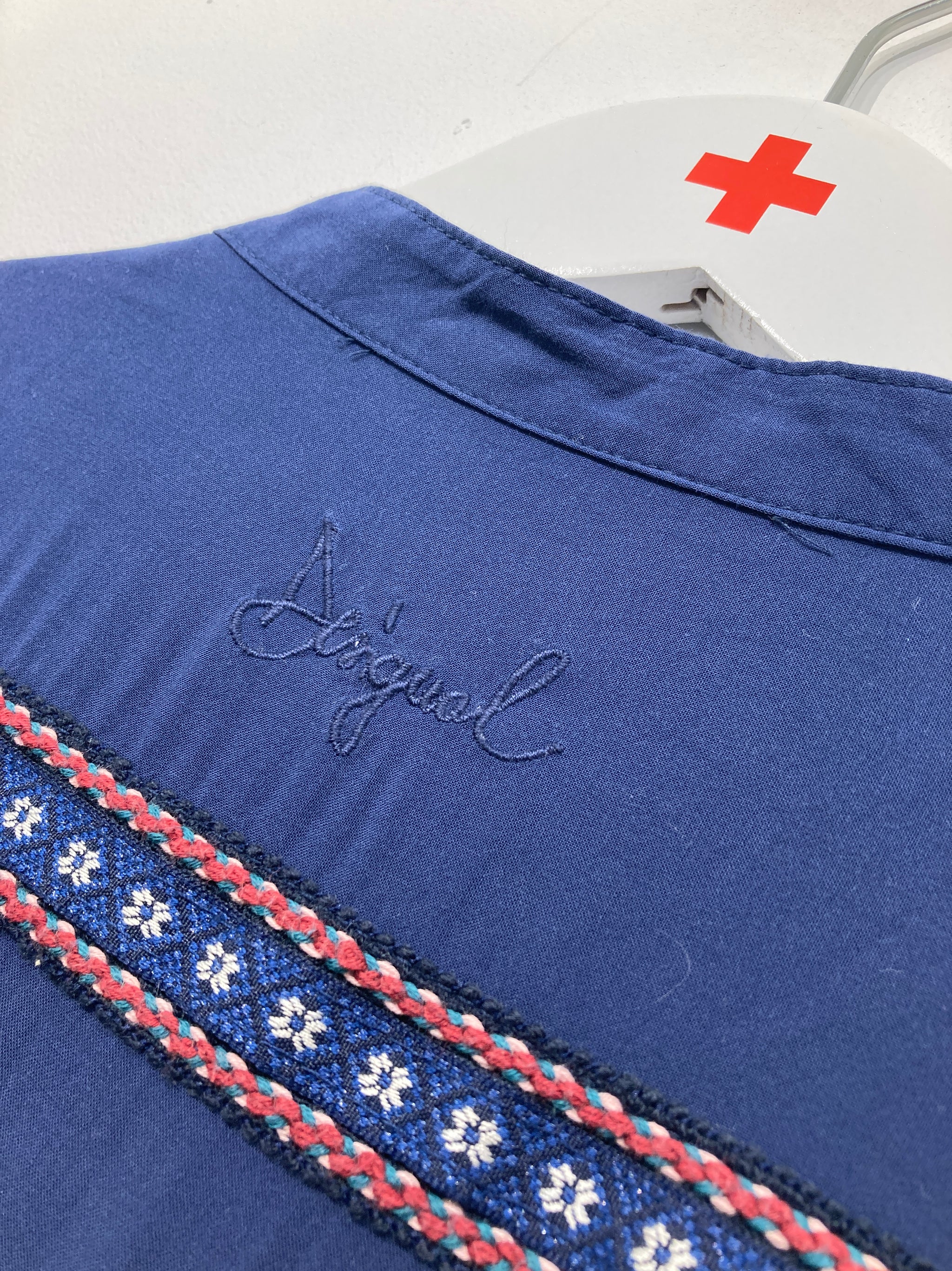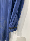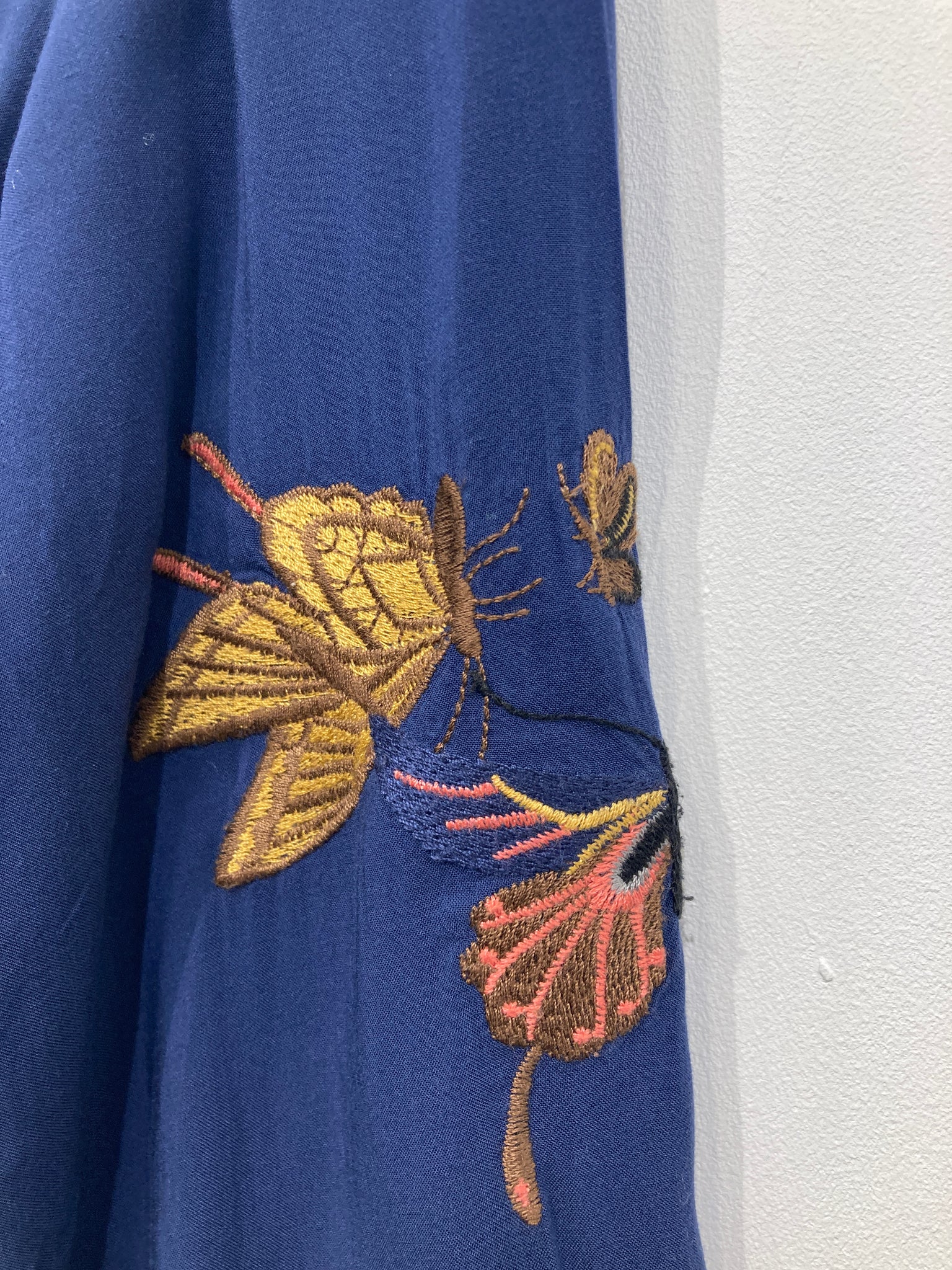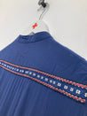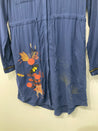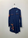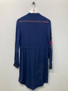Fin langærmet skjortekjole med broderet detaljer og indsnøring ved taljen. Mangler vaskemærke.