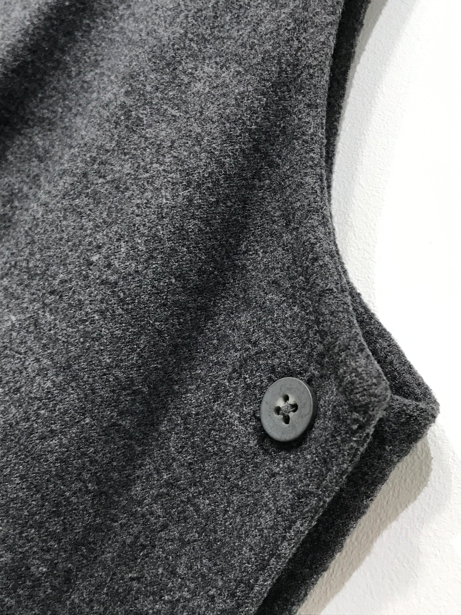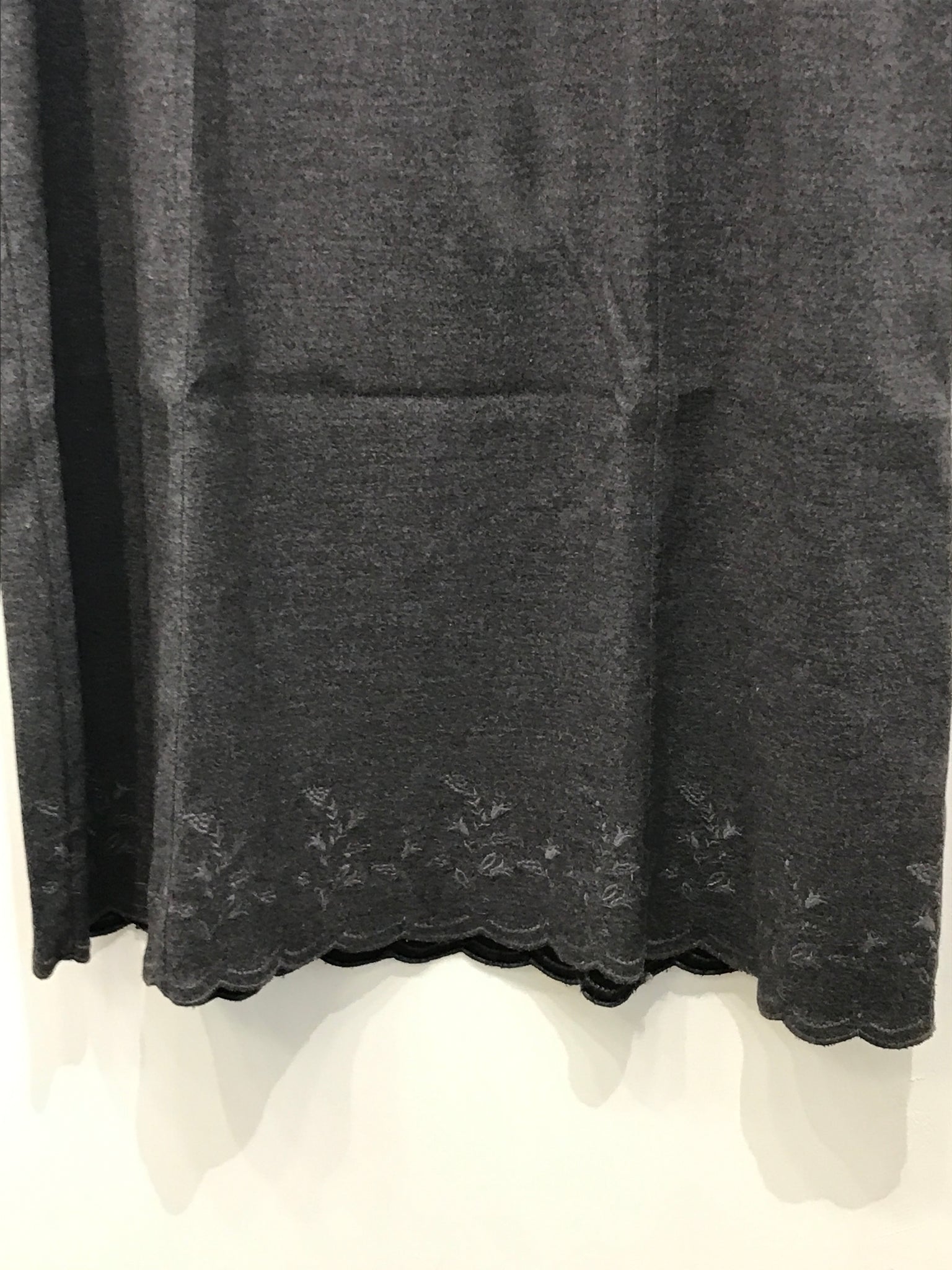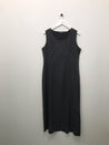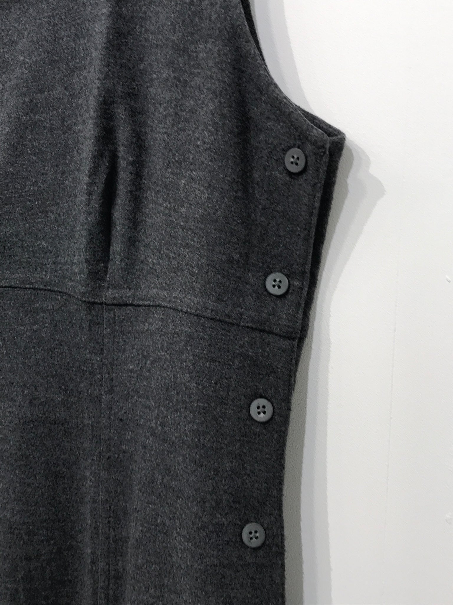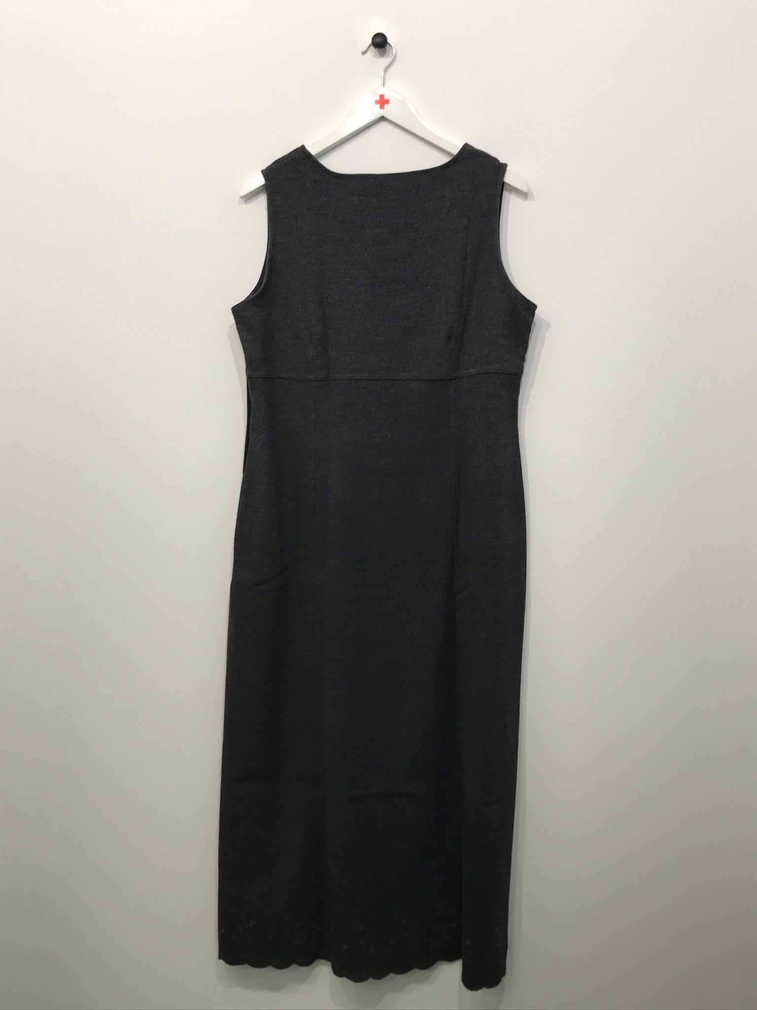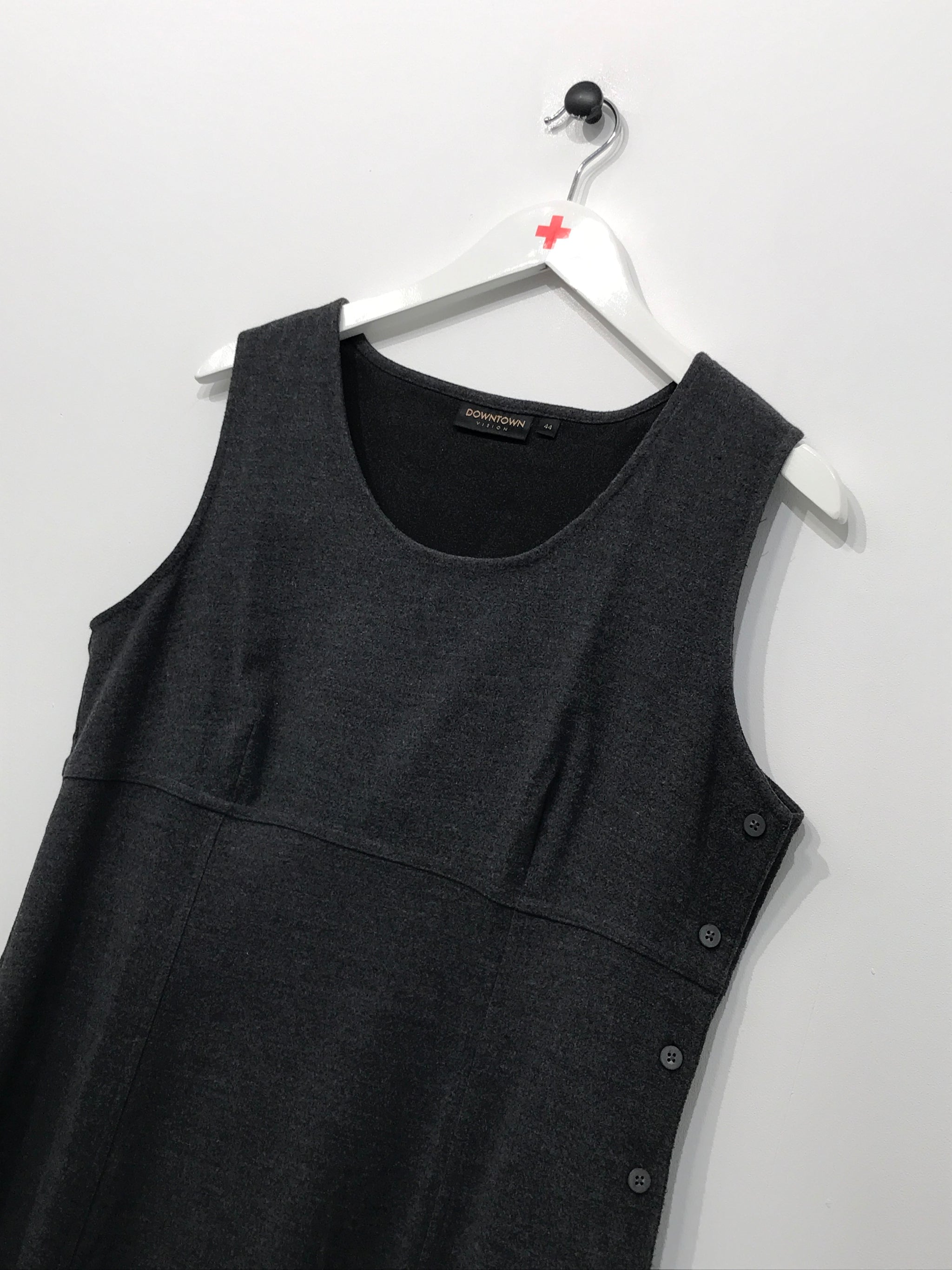 Figursyet kjole uden ærmer, med knapper i siden og broderi detalje langs kanten.
