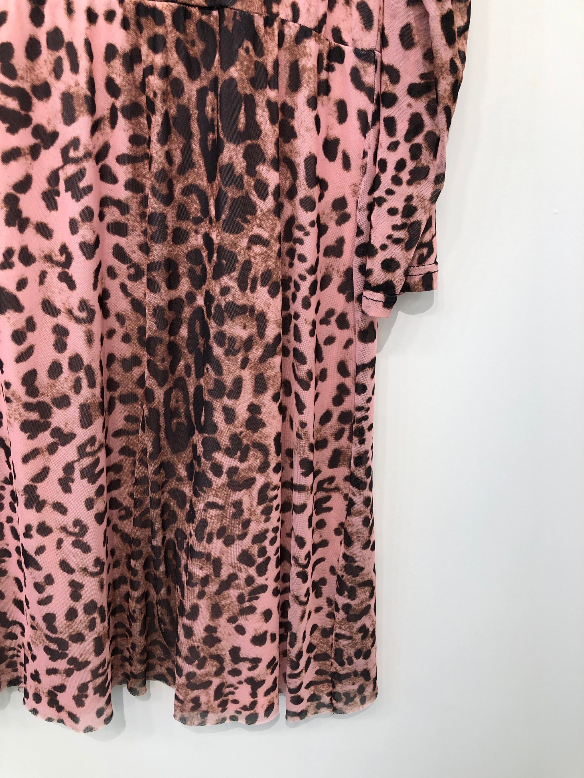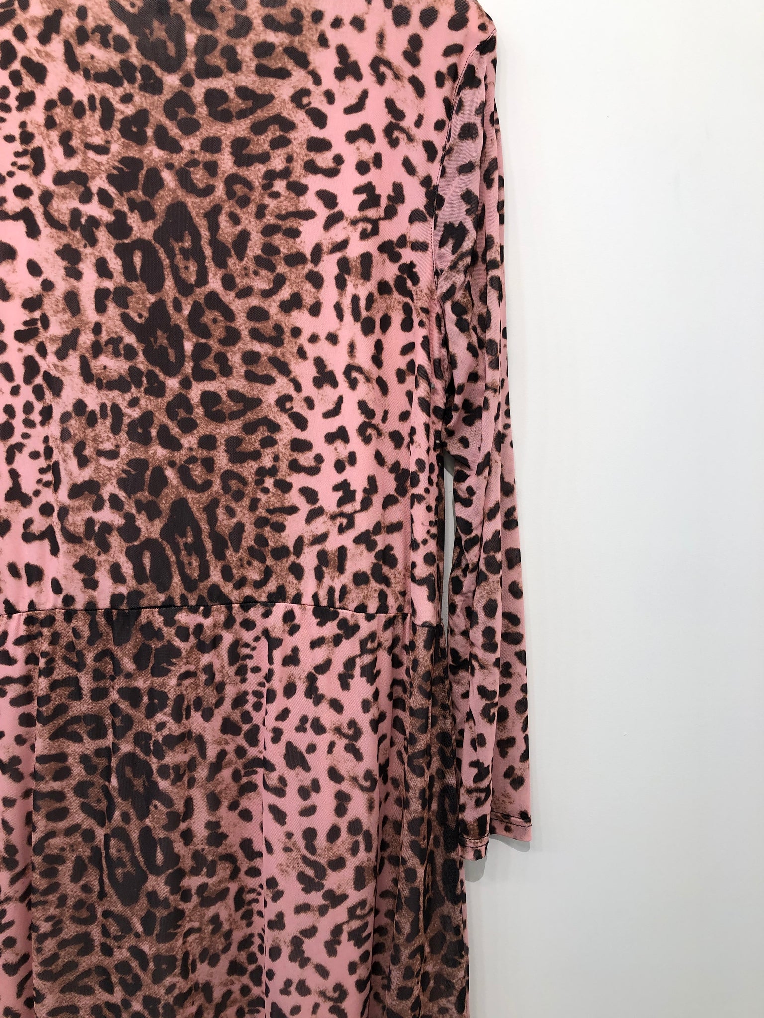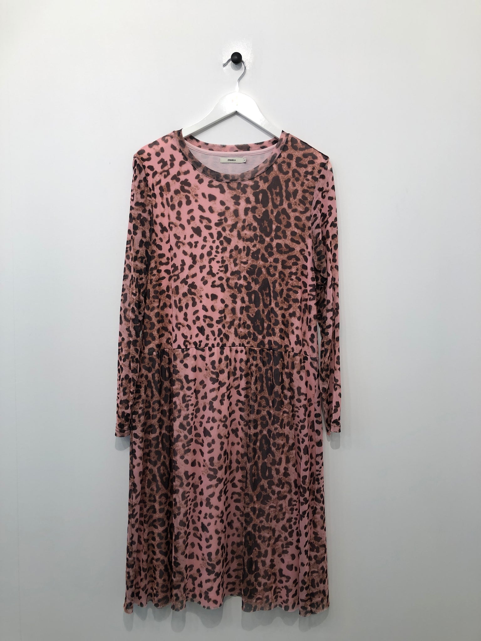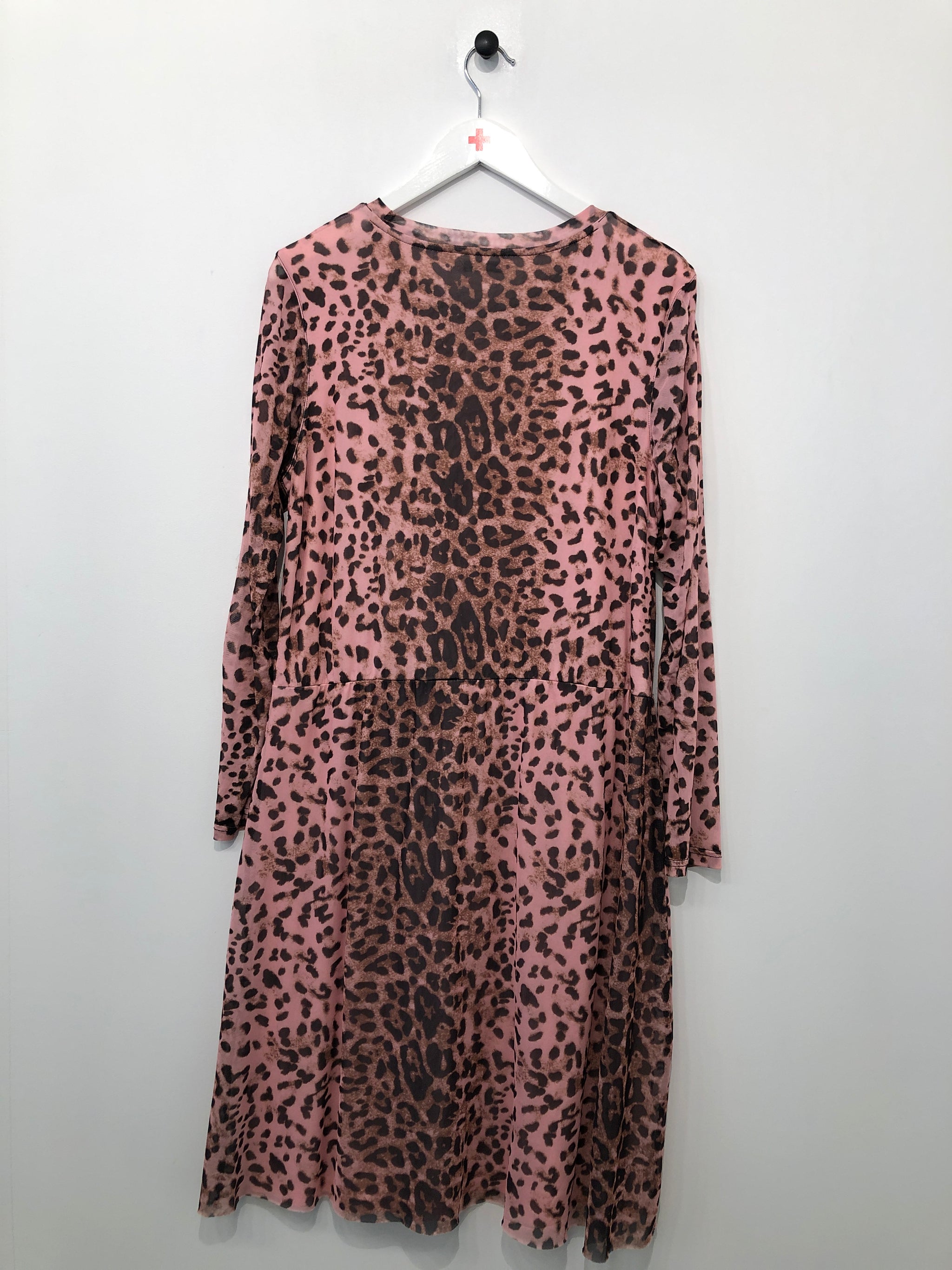 Leopardmønstret kjole med lange ærmer og rund halsudskæring. Mangler vaskemærke.
