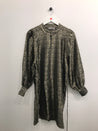 Elegant kjole i kraftigt stof med lange ærmer, rund hals med 2 knapper foran og smalt bindebånd, der fremhæver taljen.
