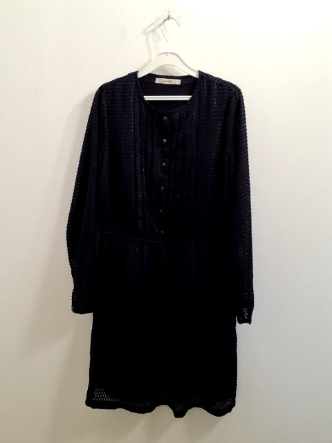 O460 Kjolen har lange ærmer, knaplukning og en let plisseret struktur.