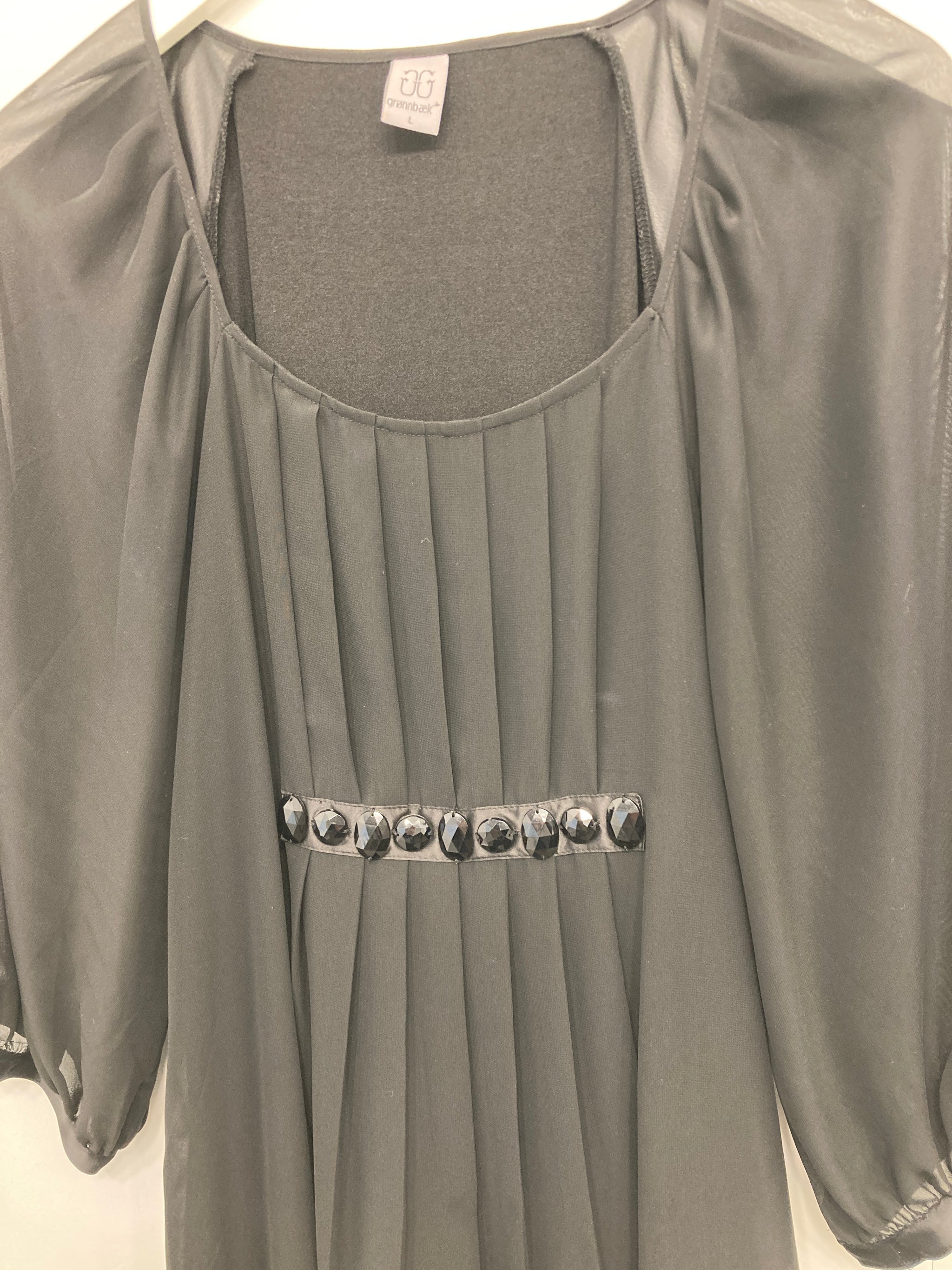 Flot kjole med dekorative sten foran.