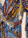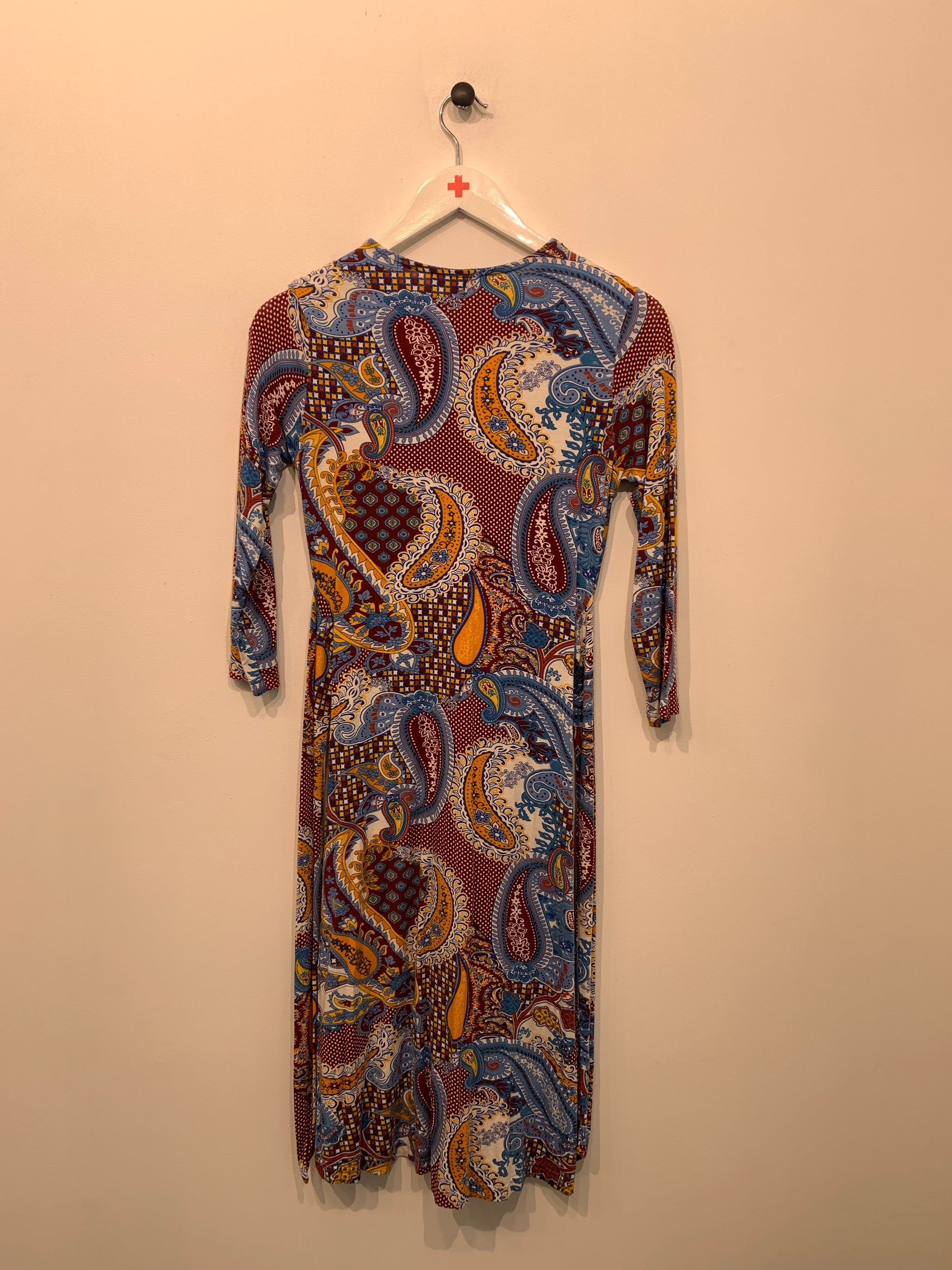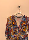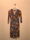 Kjole med v-udskæring, snoning foran og bredt bindebånd.