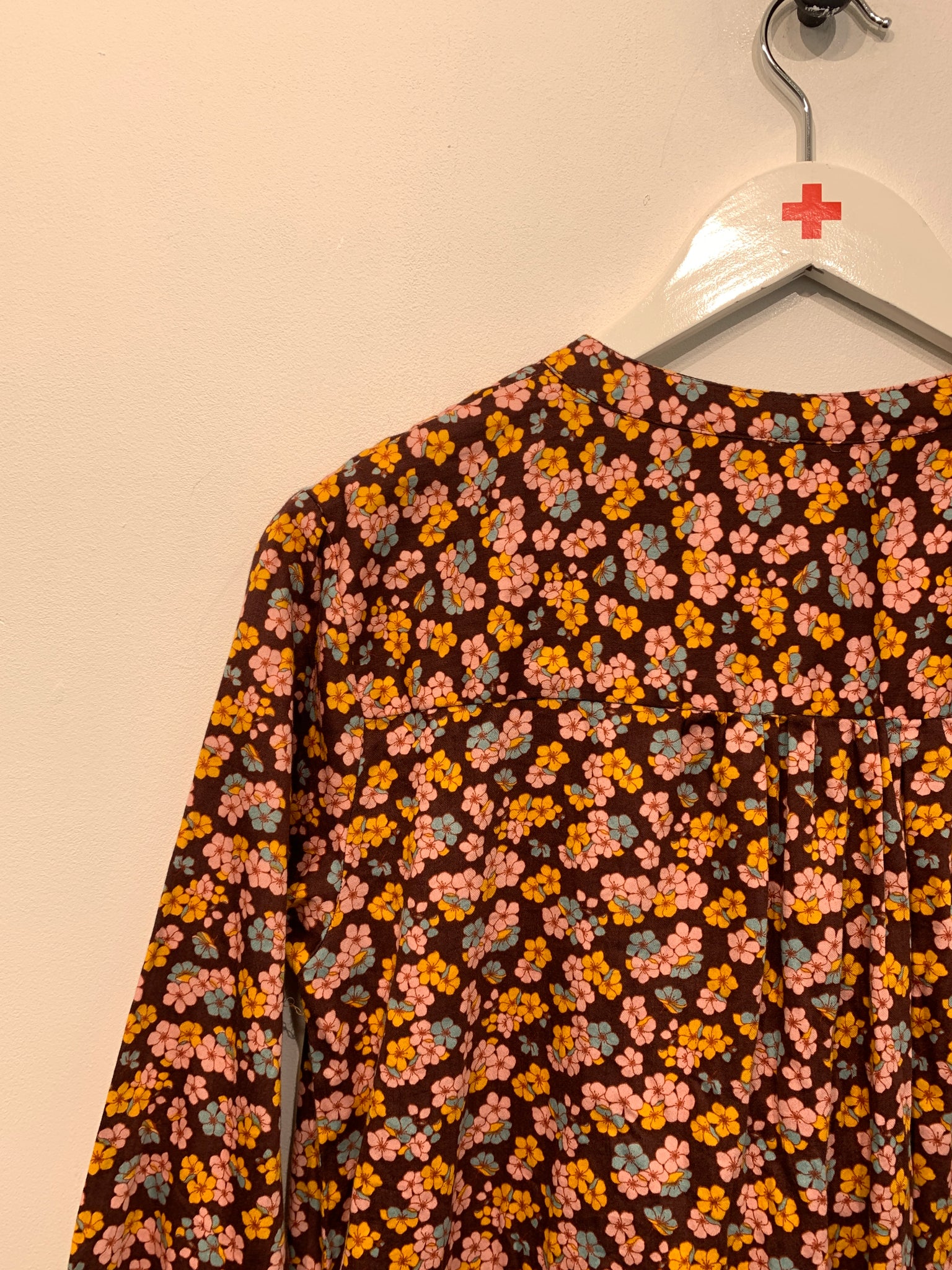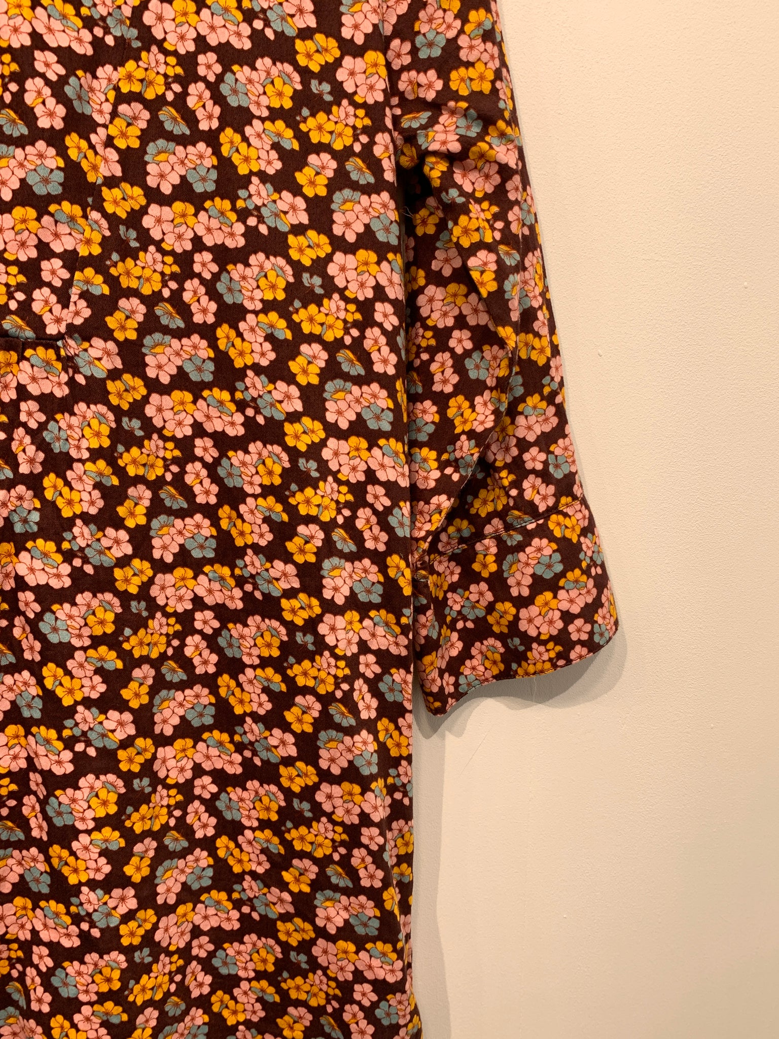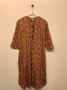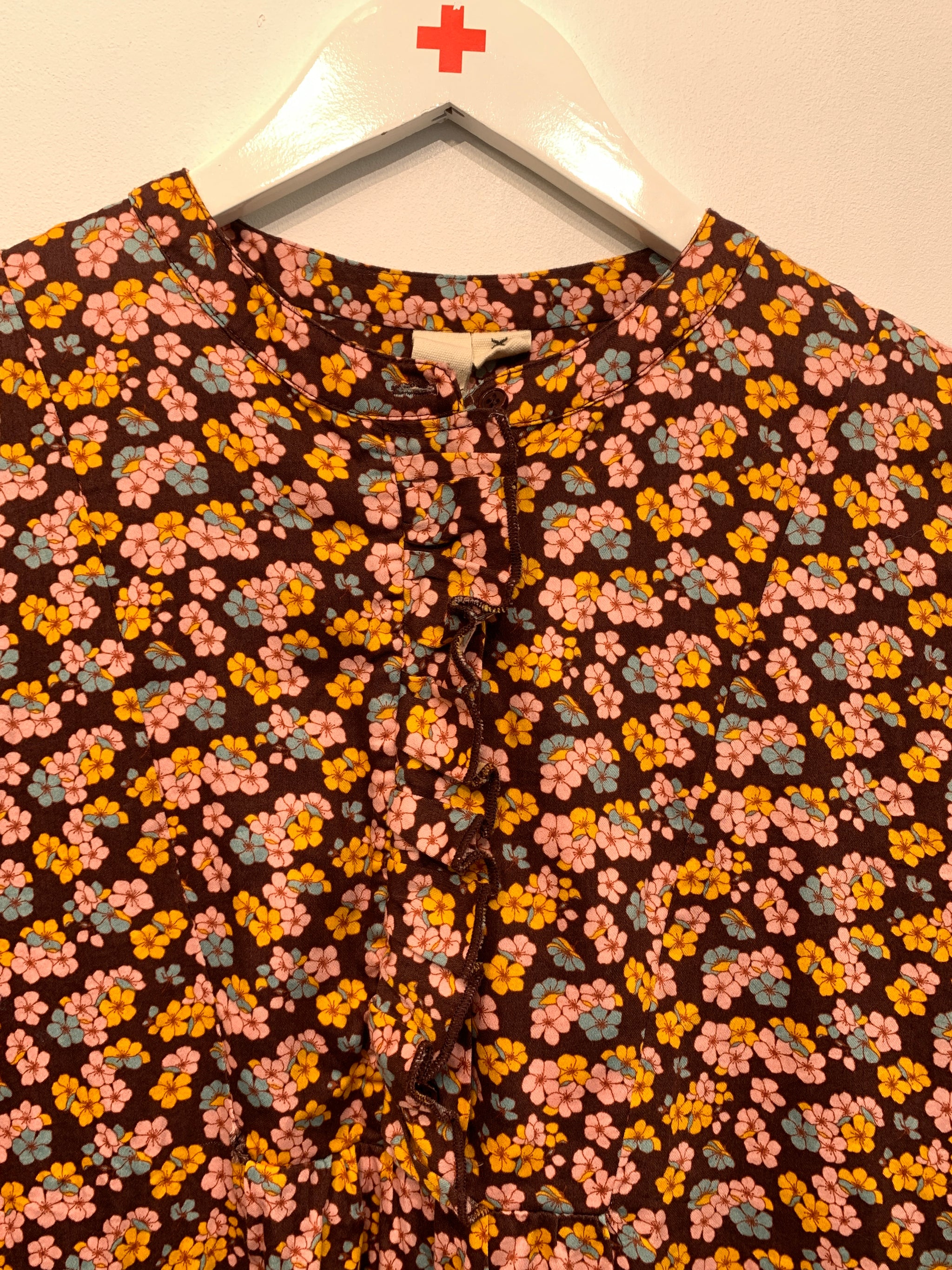 Kjole i løs pasform med rund hals og lukning foran med flæser