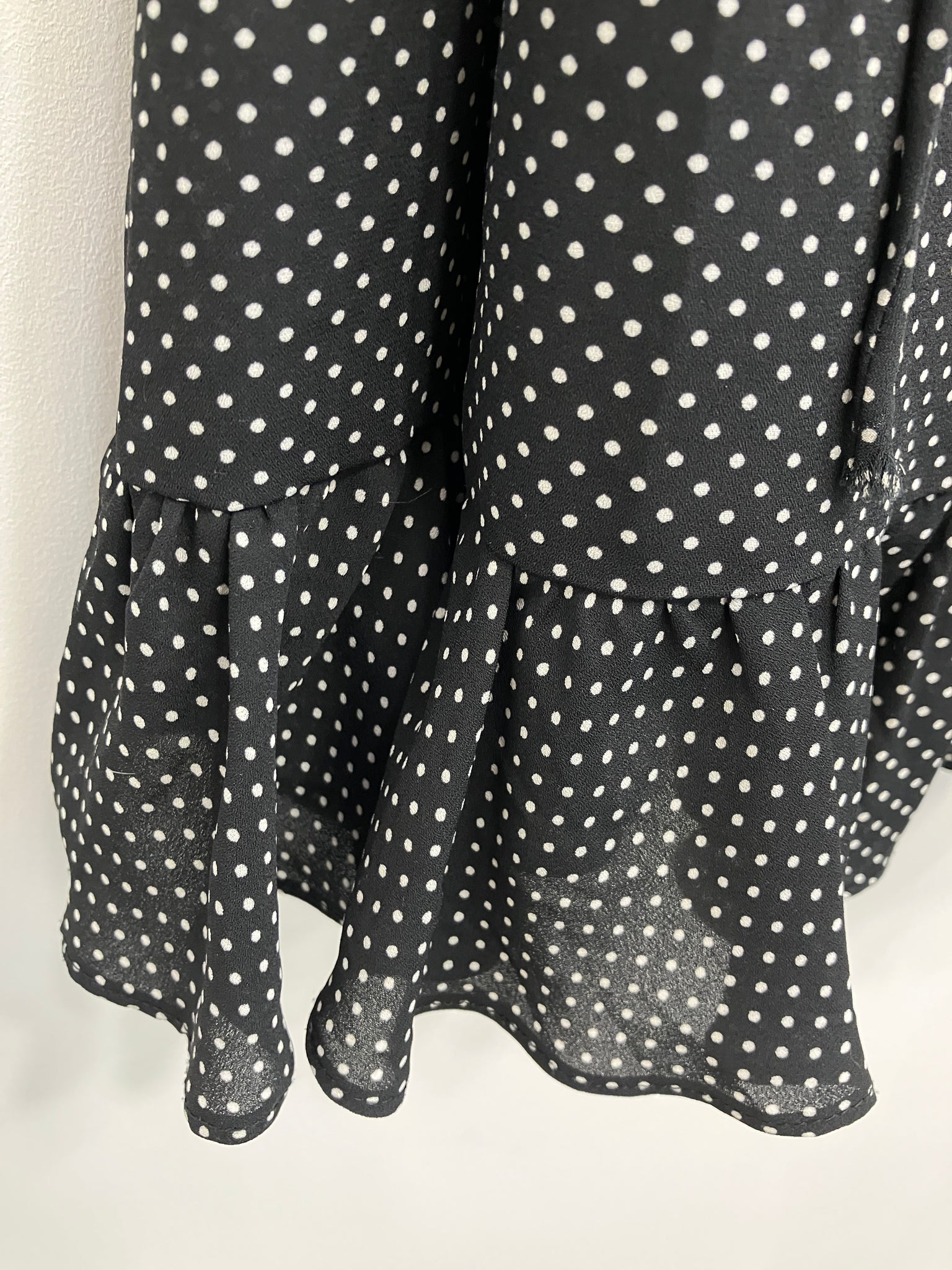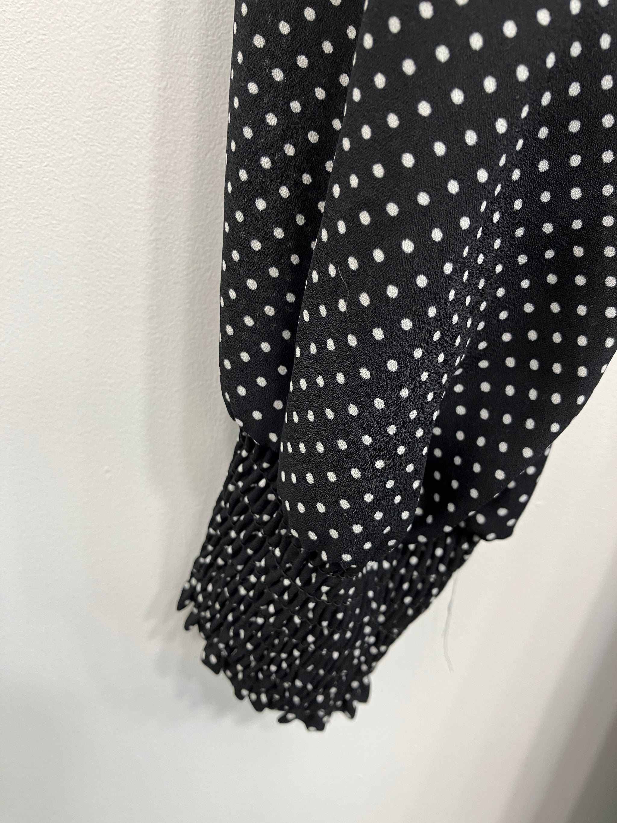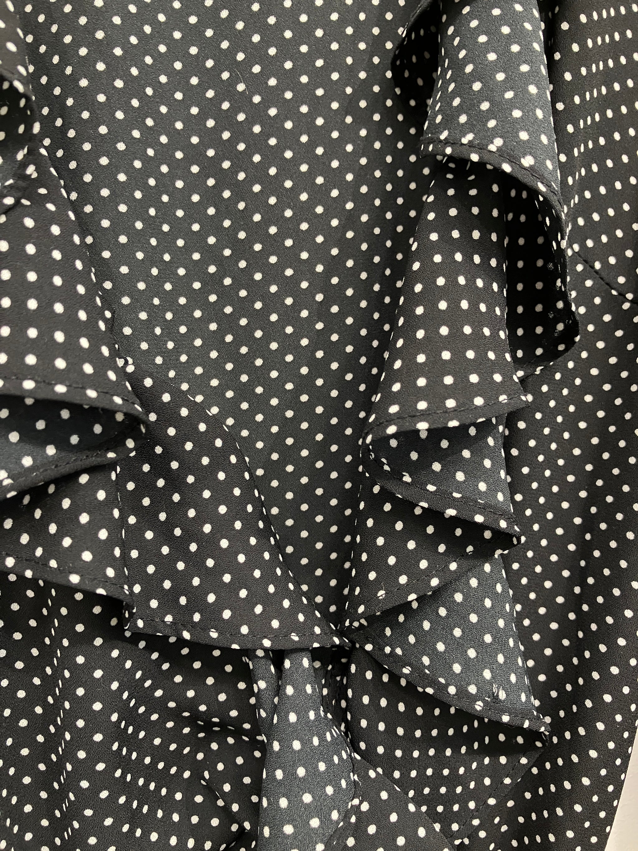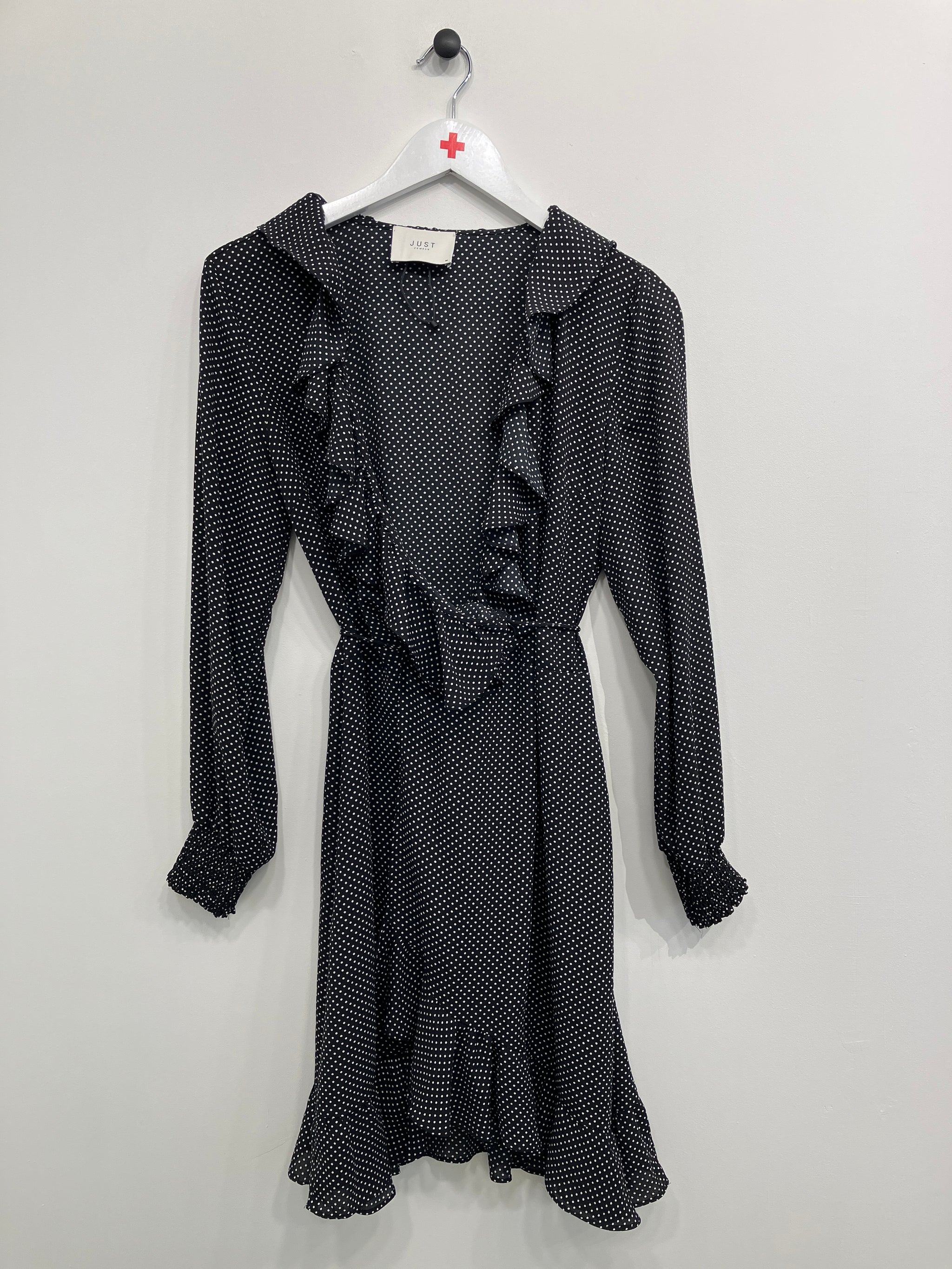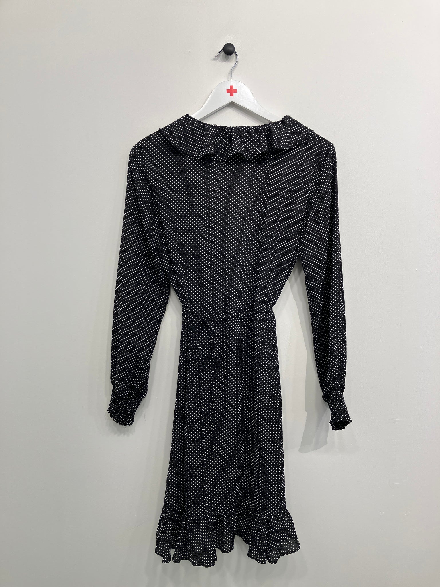 Slå-om kjole med flæsekanter og lange ærmer med smocksyning ved ærmekanter.