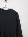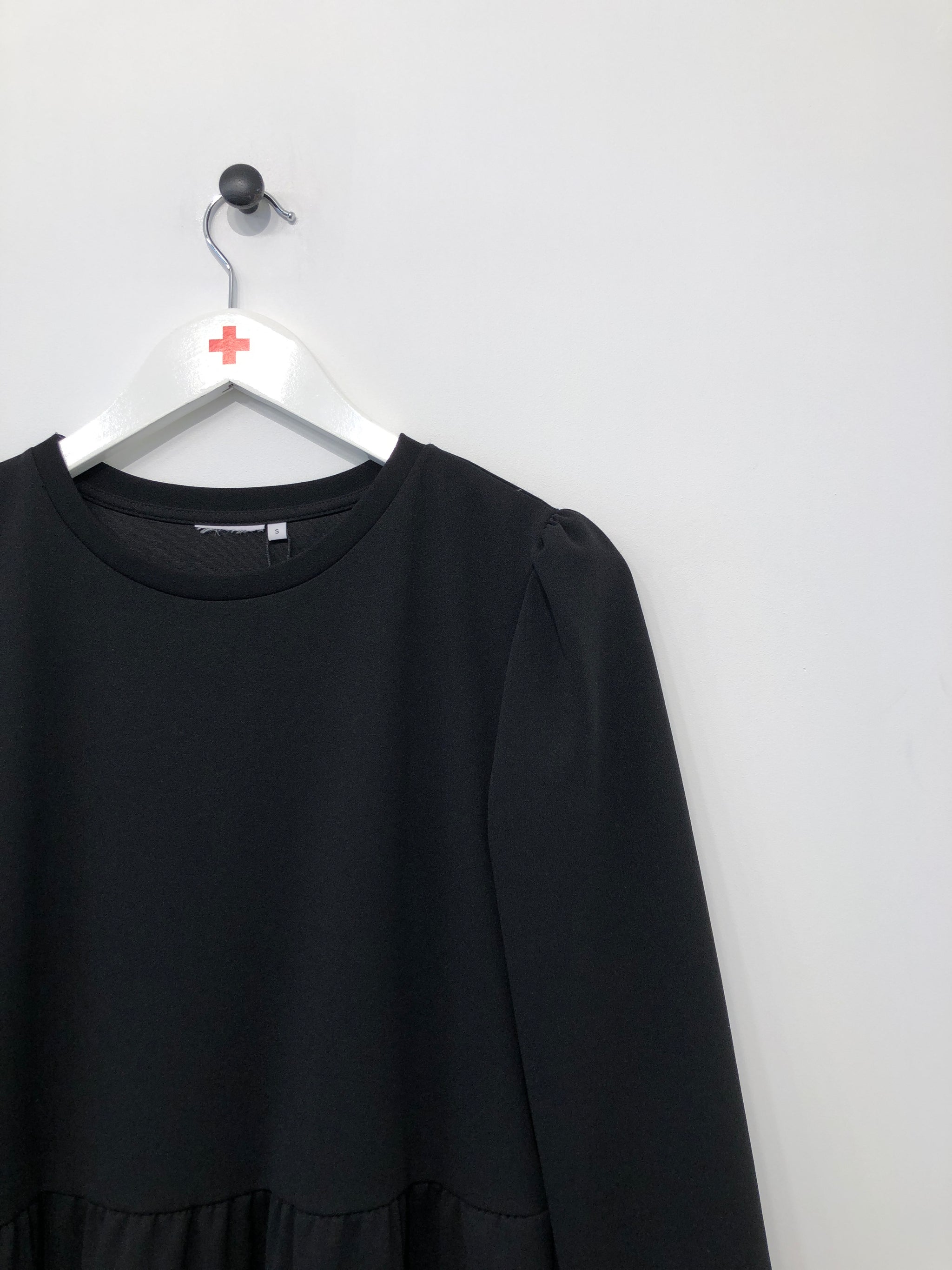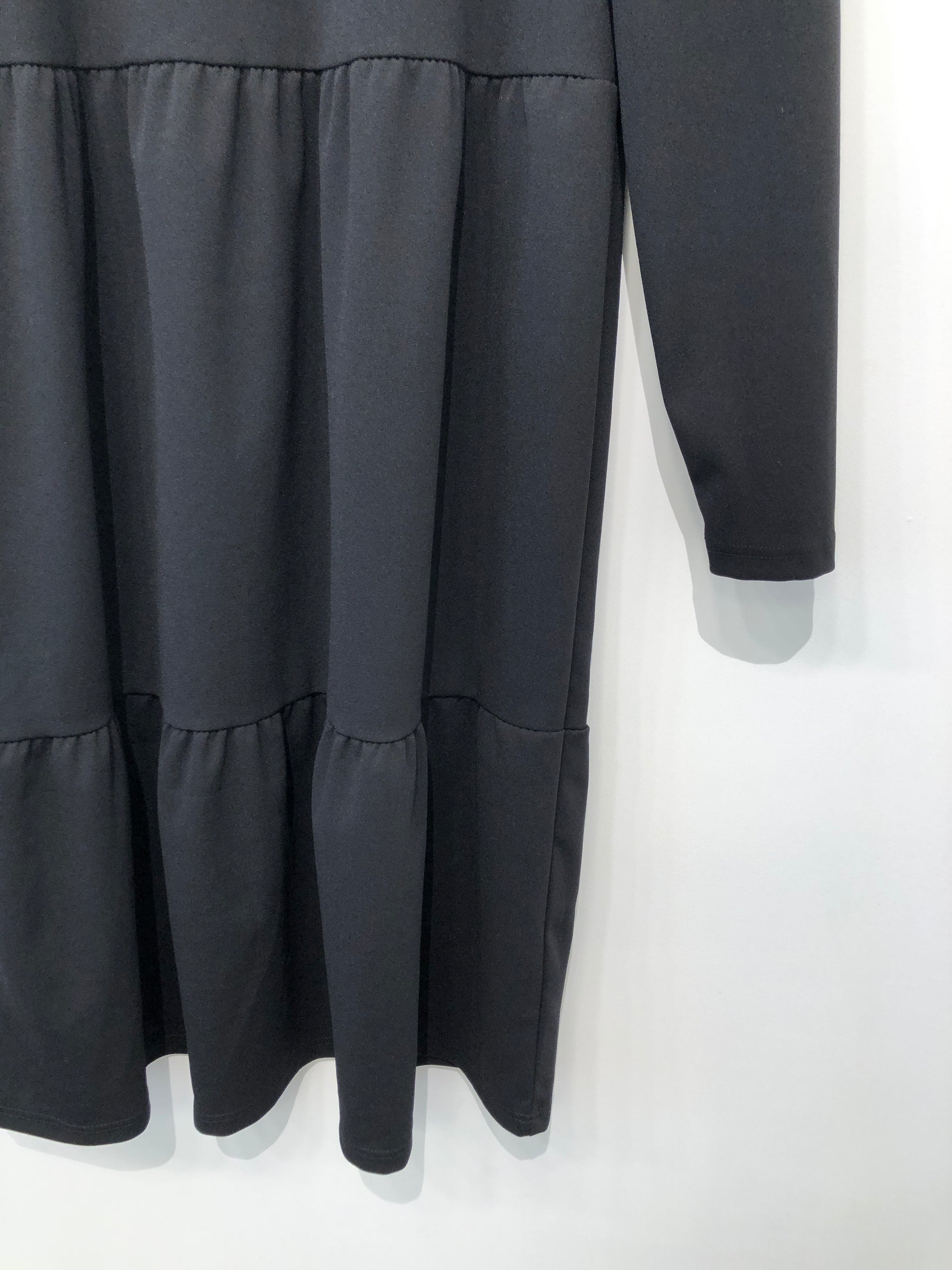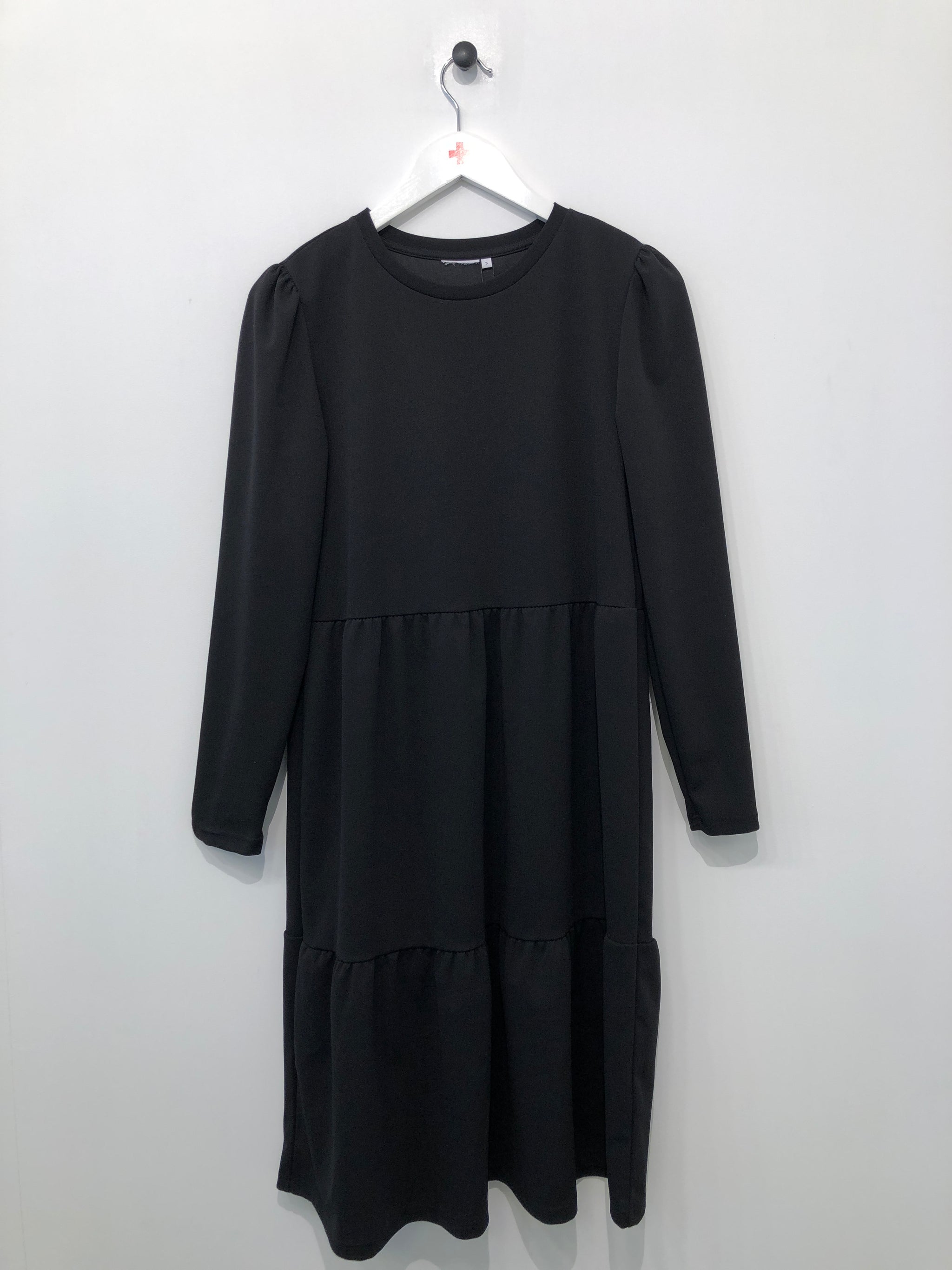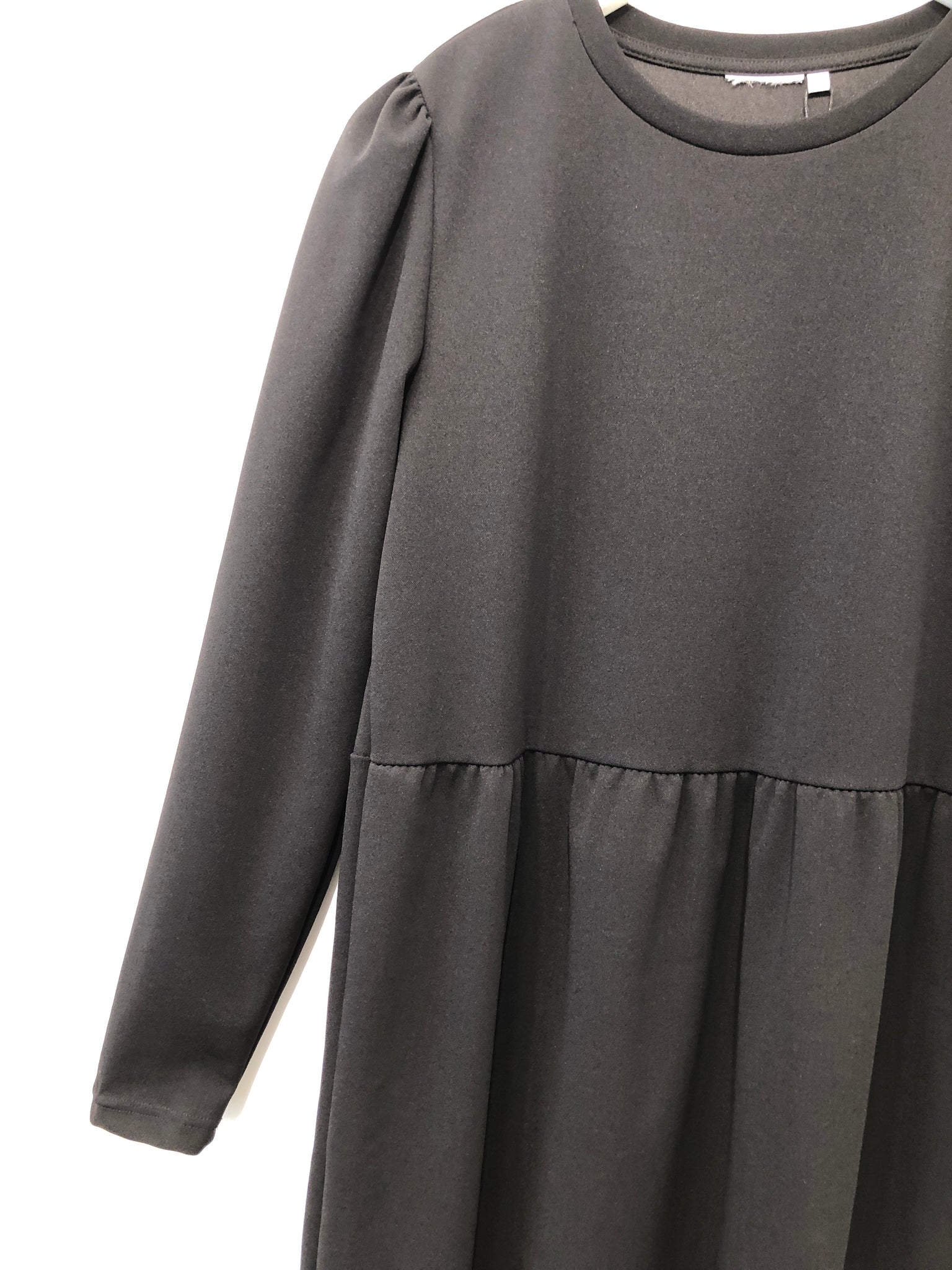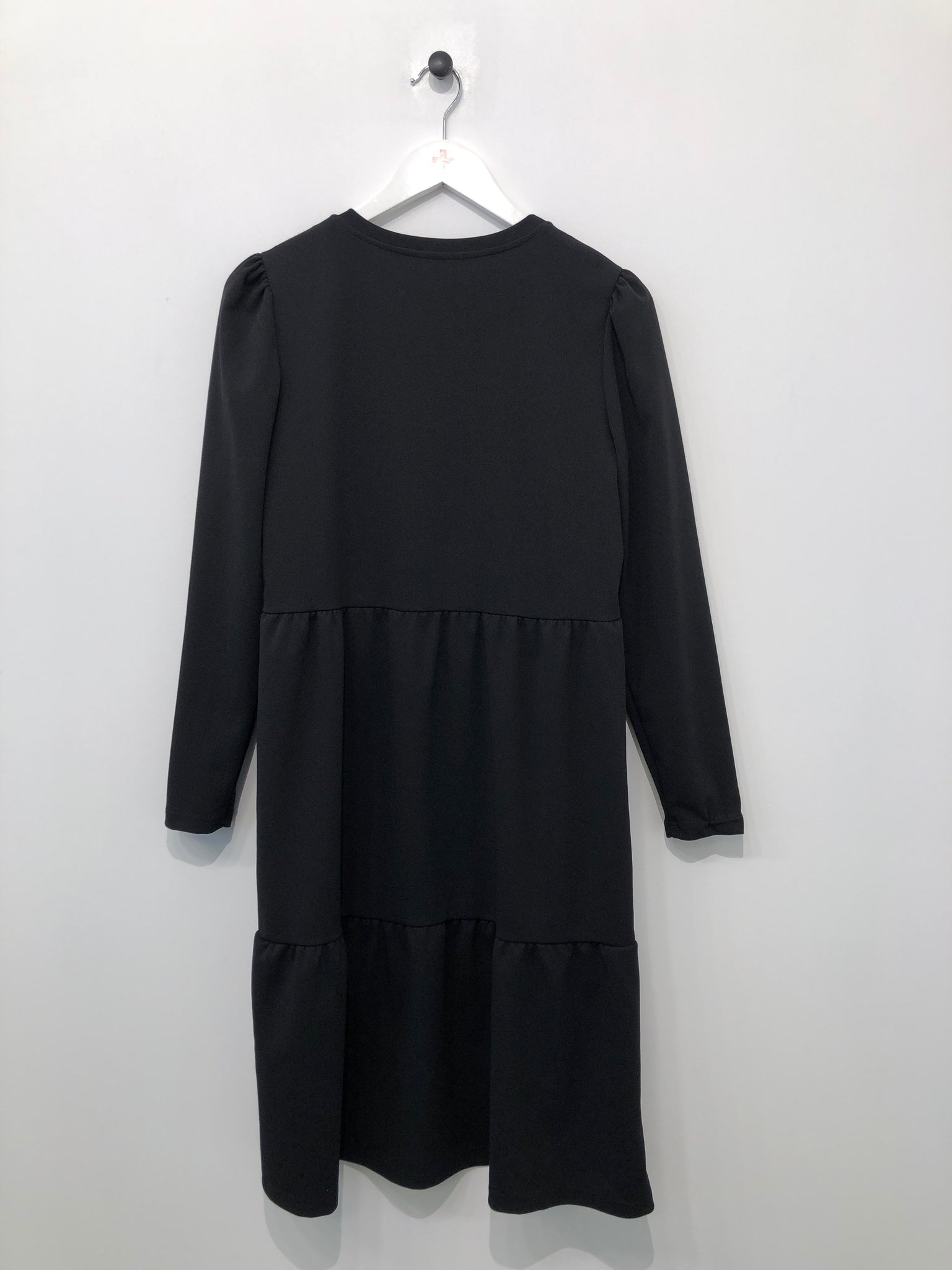 Langærmet kjole med rund hals og lagdetalje, samt lidt puf i ærmerne.