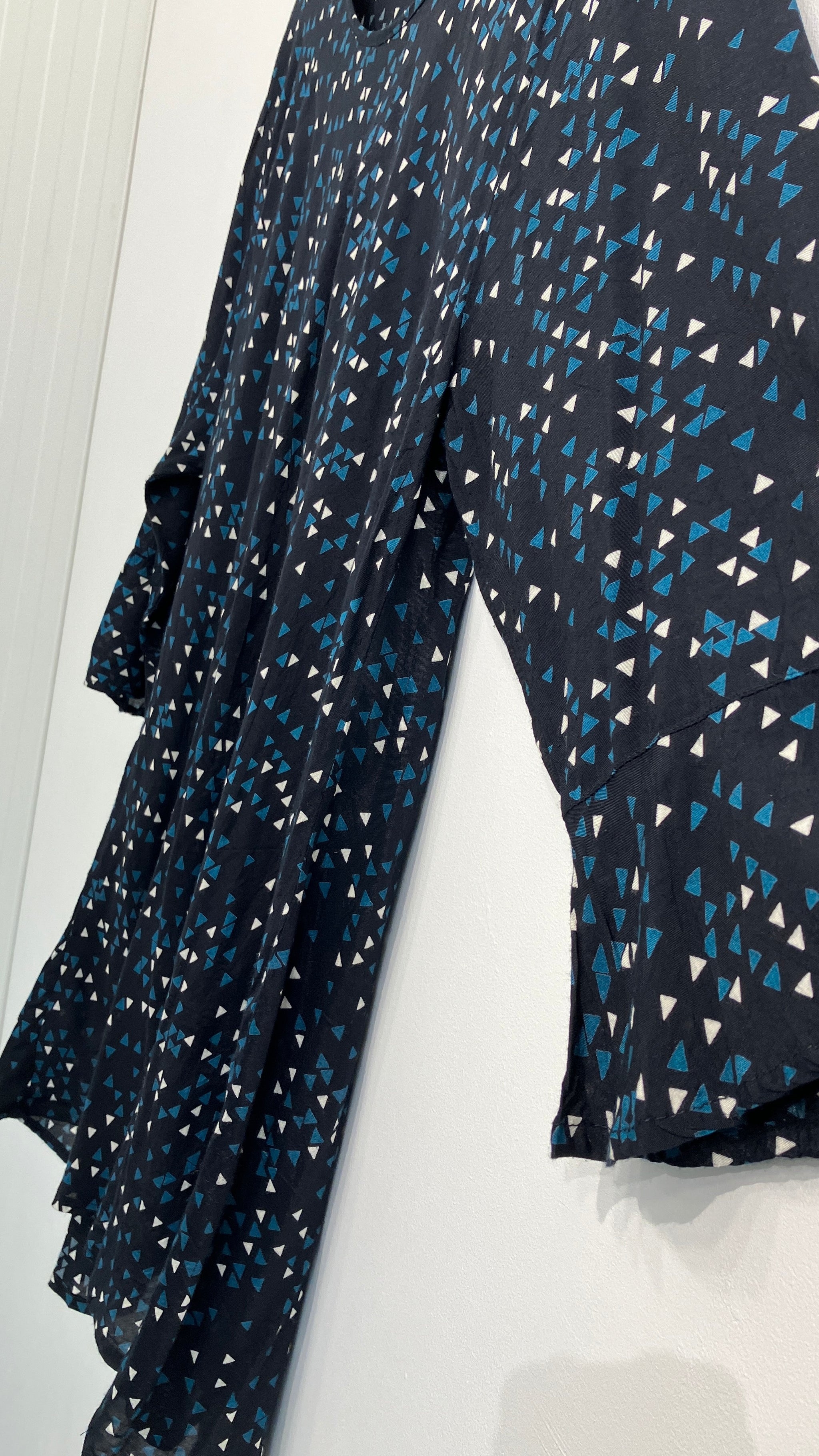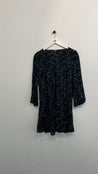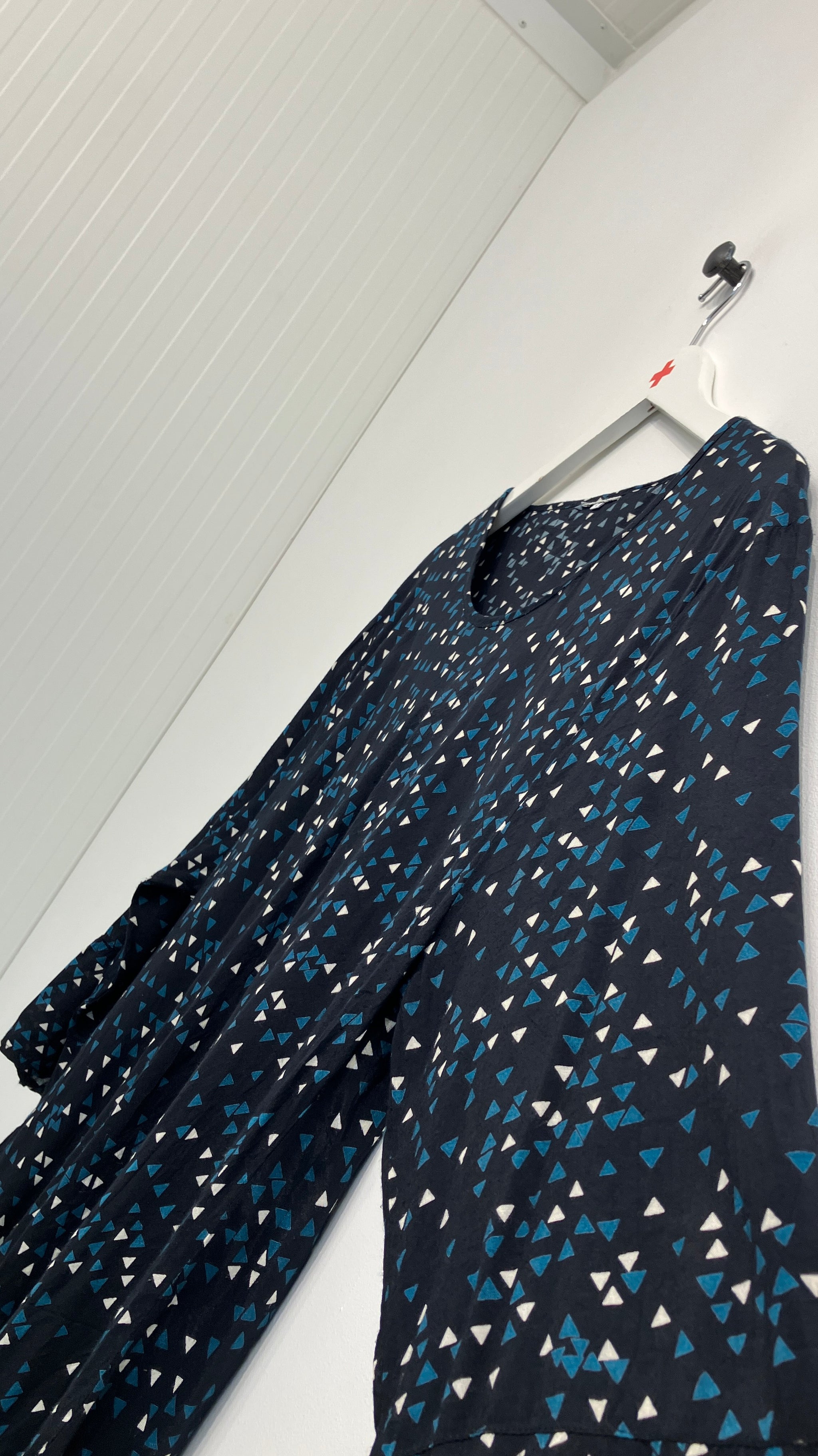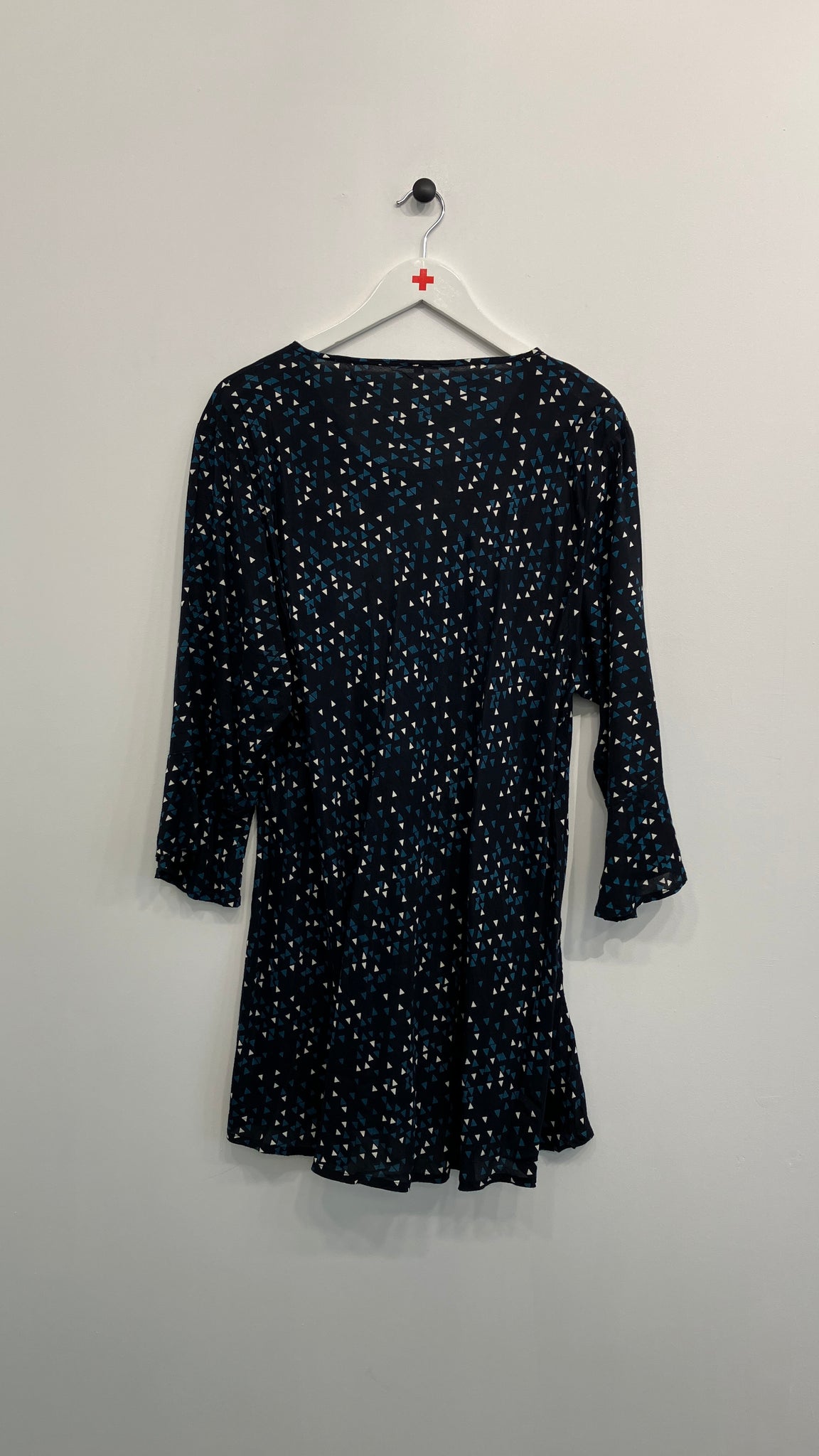 Yndig mellemlang kjole med flerfarvet mønster og rund halsudskæring. Mangler vaskemærke