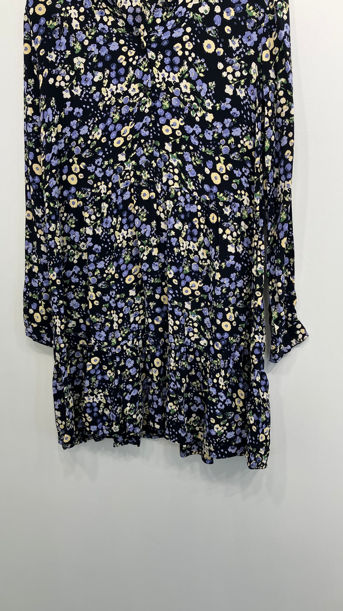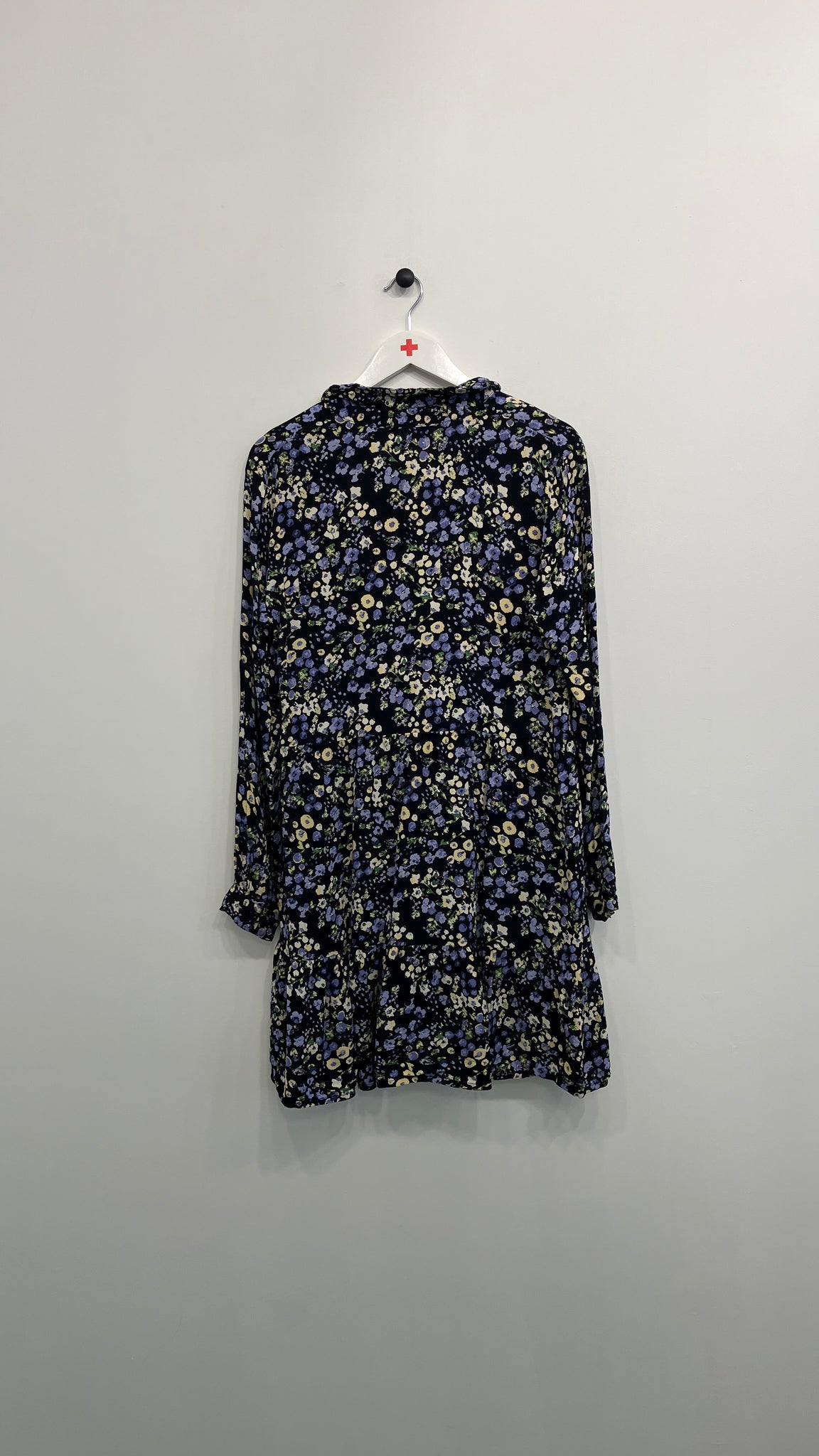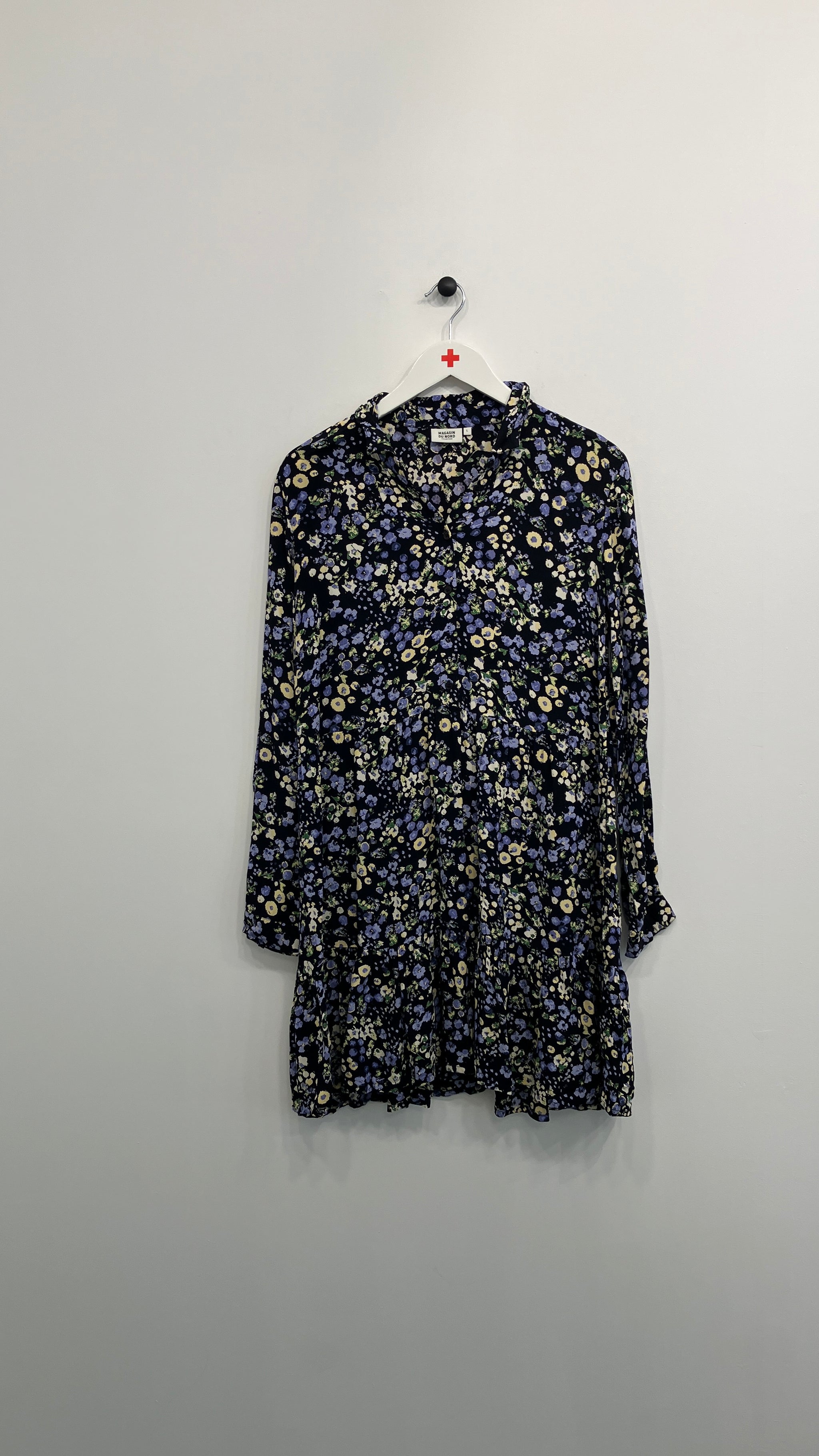 Flot mellemlang Magasin kjole med fin krave og flæsedetaljer i bunden.