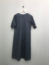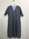 Kjole med v-hals og korte ærmer med lille flæsekant.